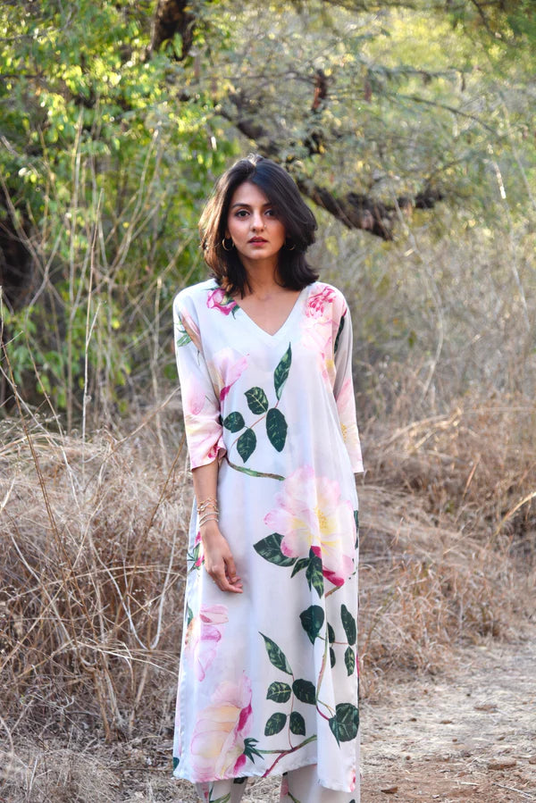 Introducing our captivating blue rose printed kurta. The straight kurta had V neck and straight sleeves.
