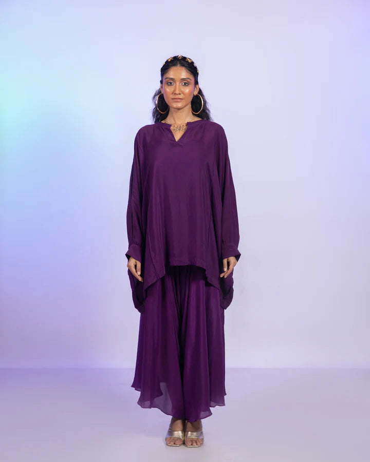 Add a pop of vibrant color to your wardrobe with this stunning purple draped pant set, paired with a matching solid purple comfy top. The smooth, rich purple hue creates a sleek and sophisticated look, while the draped pants offer a relaxed yet flattering fit. Perfect for casual outings, dinner dates, or evening events, this set combines comfort with a bold, modern style.