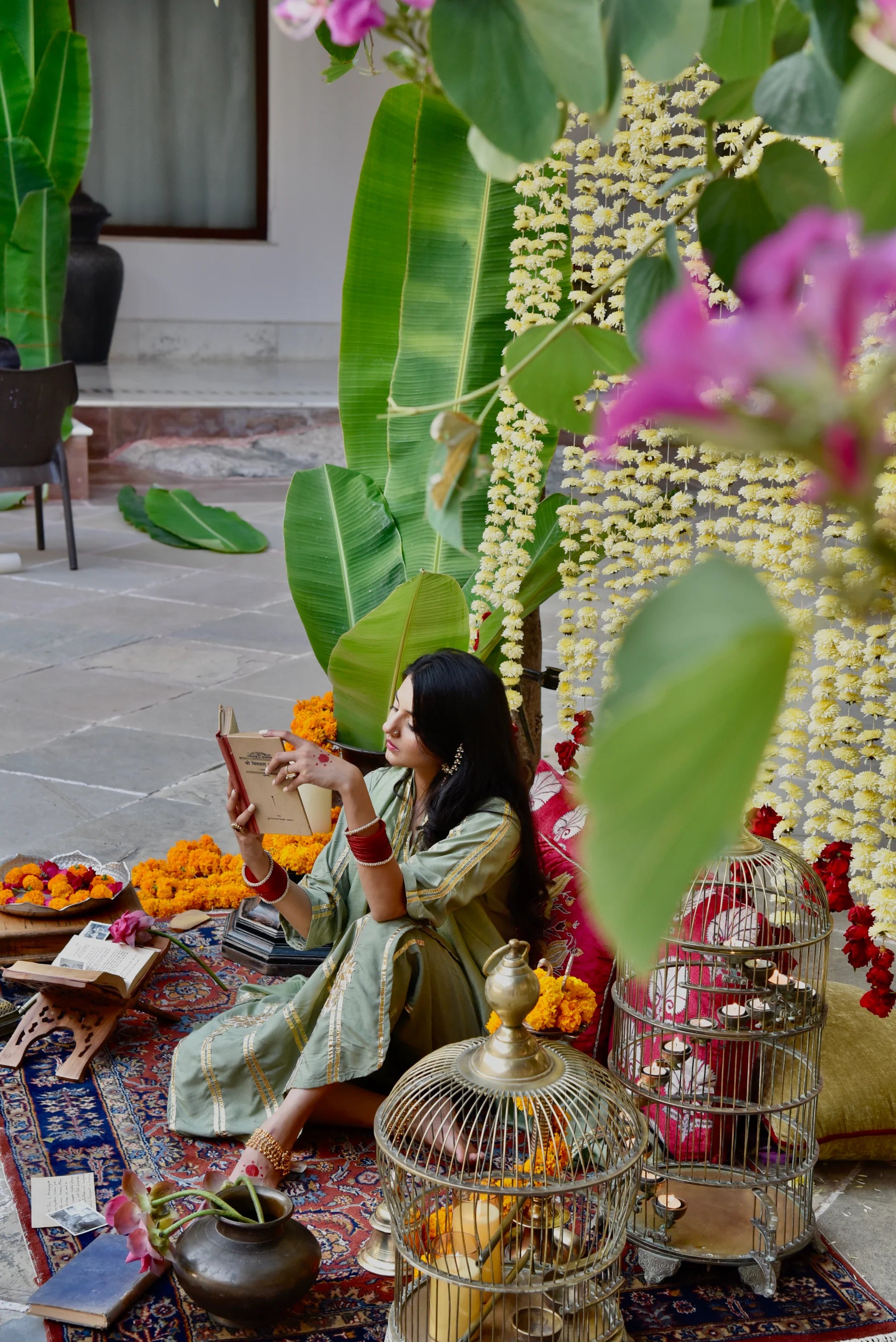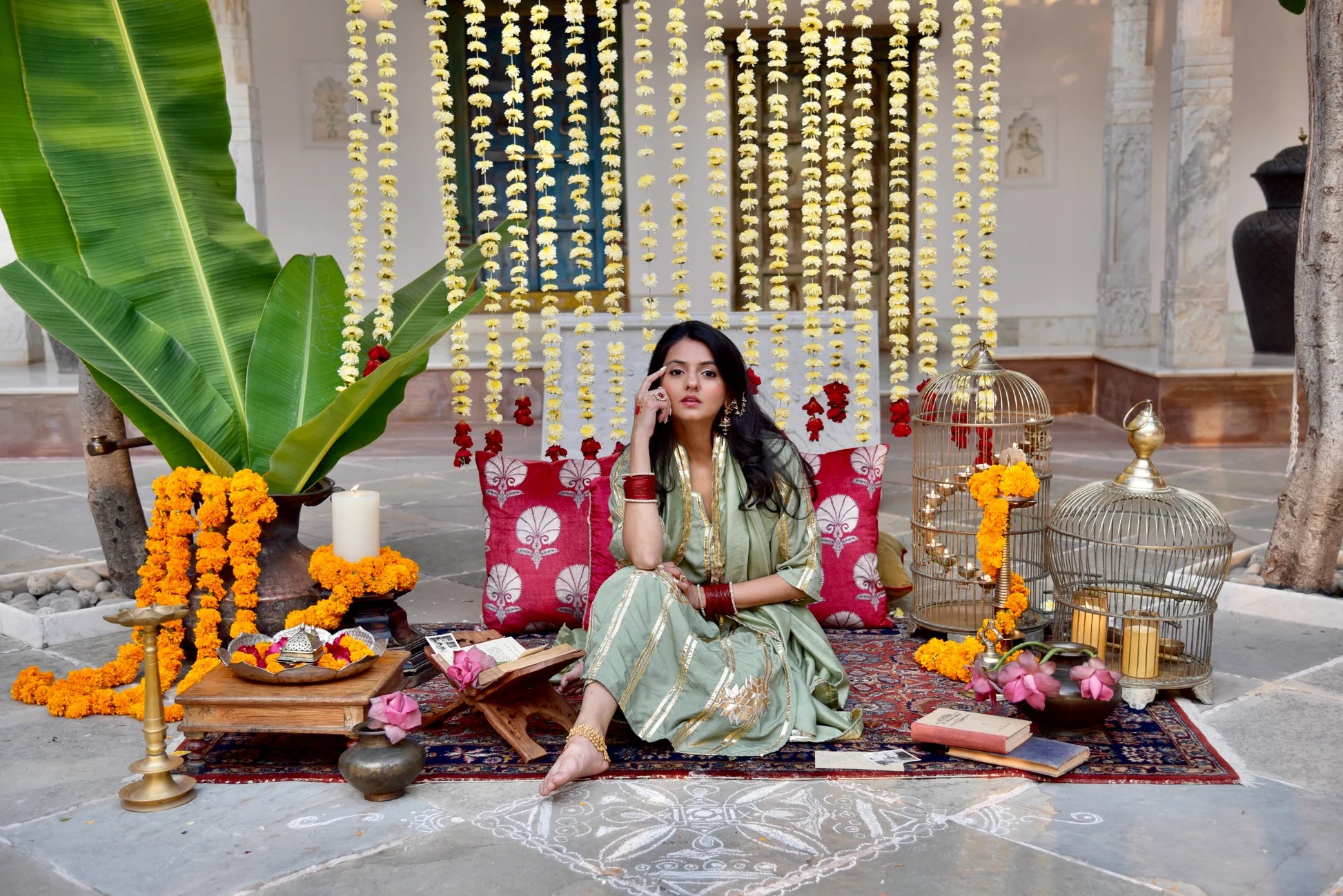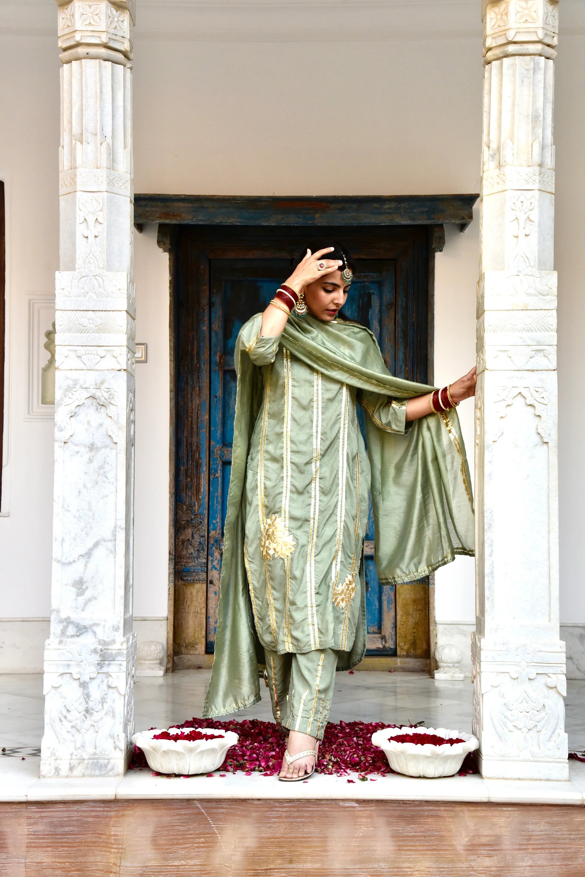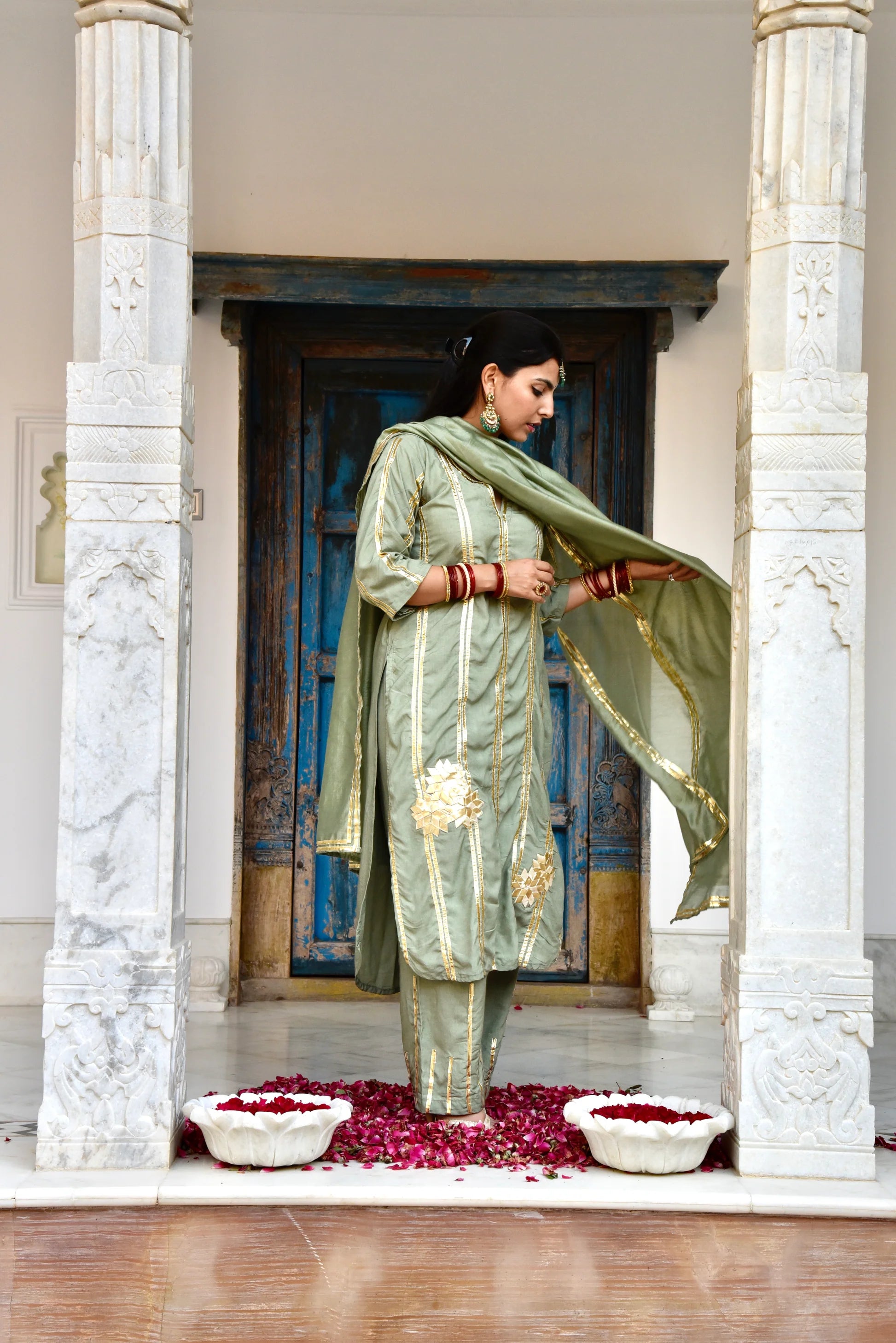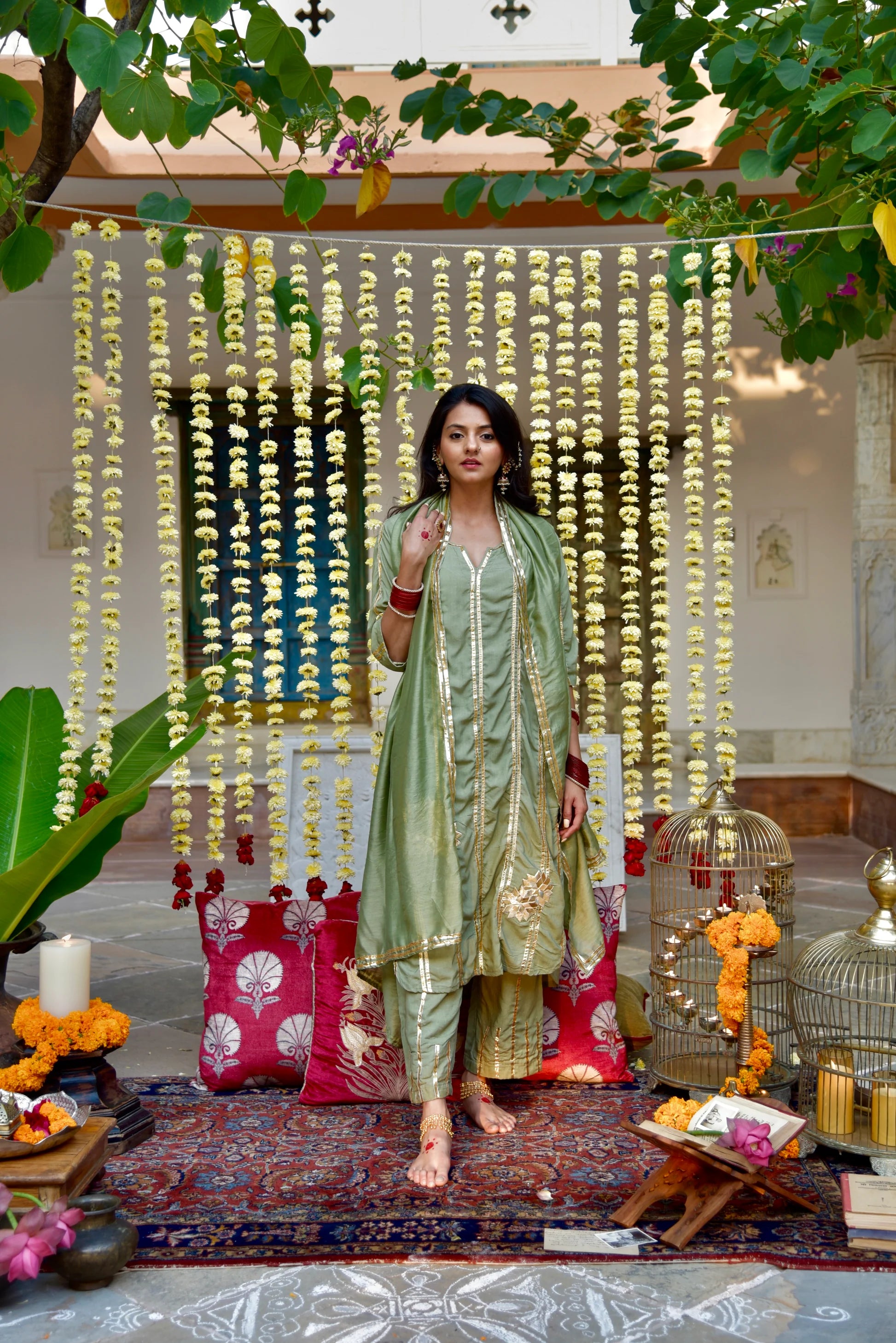 Discover elegance with the Angoori Set, a stunning 3-piece kurta set in green. The straight kurta features intricate gota lines on the front and sleeves, with a unique curved hem. The kurta is adorned with a big gota flower, adding a touch of sparkle. The modal fabric pants are designed with gota lines all around. The Chanderi dupatta complements the set with two gota lines running along its edges.