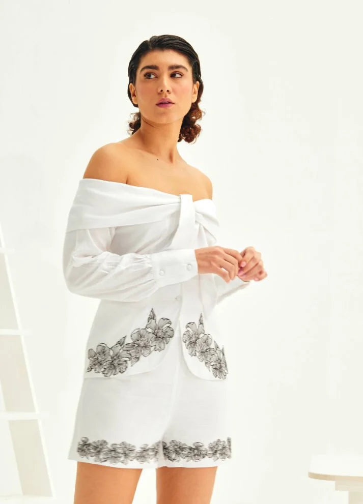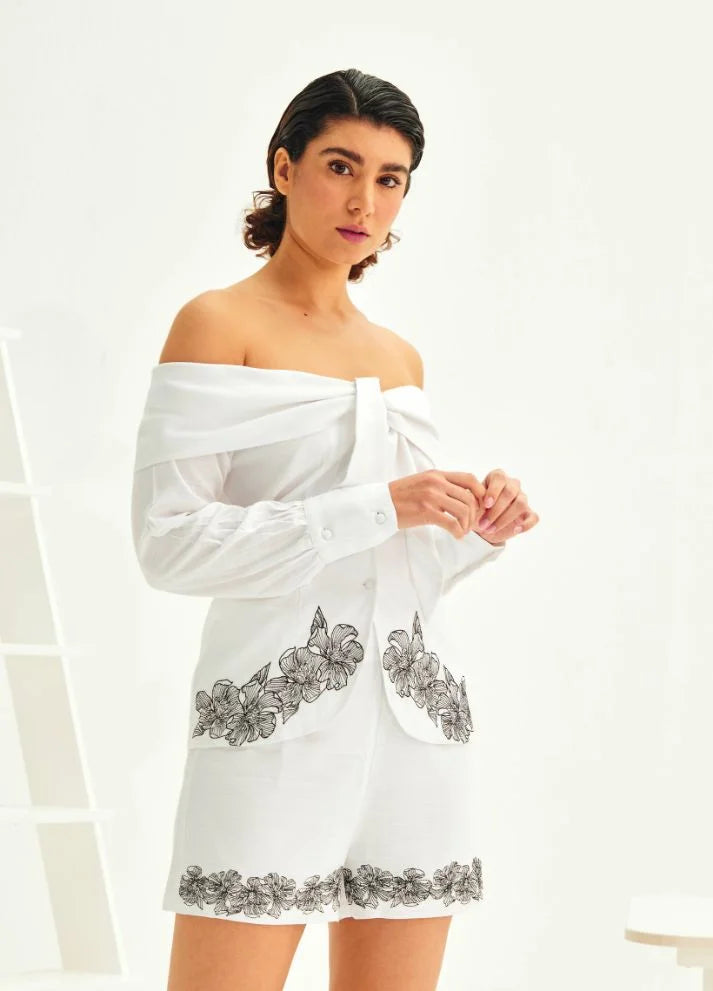 The Ariana Top showcases an off-shoulder fold-over neckline with long sleeves and an uneven hem, creating a graceful and relaxed silhouette. The intricate sketched floral embroidery adds an artistic touch, inspired by the beauty of nature. Crafted from a breathable linen blend, this top is lightweight, stylish, and comfortable for all-day wear.