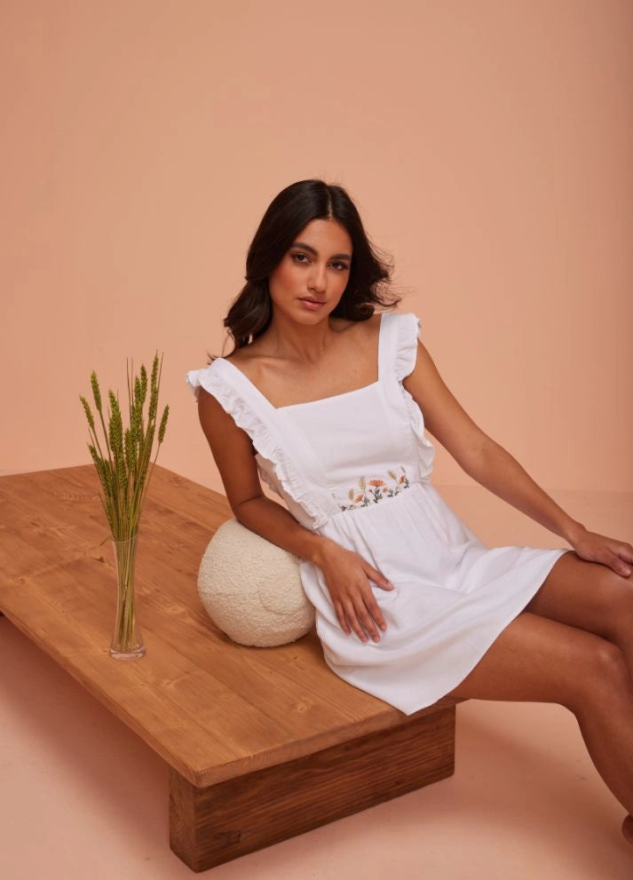 This oh-so-sweet white linen dress is the perfect choice for any day or night occasion, featuring a super-flirty short hem and ruffled sleeveless top, making it easy to mix and match with your favorite bomber or denim jacket for cooler temps. Look and feel good wearing this pretty design crafted with eco-friendly materials.
