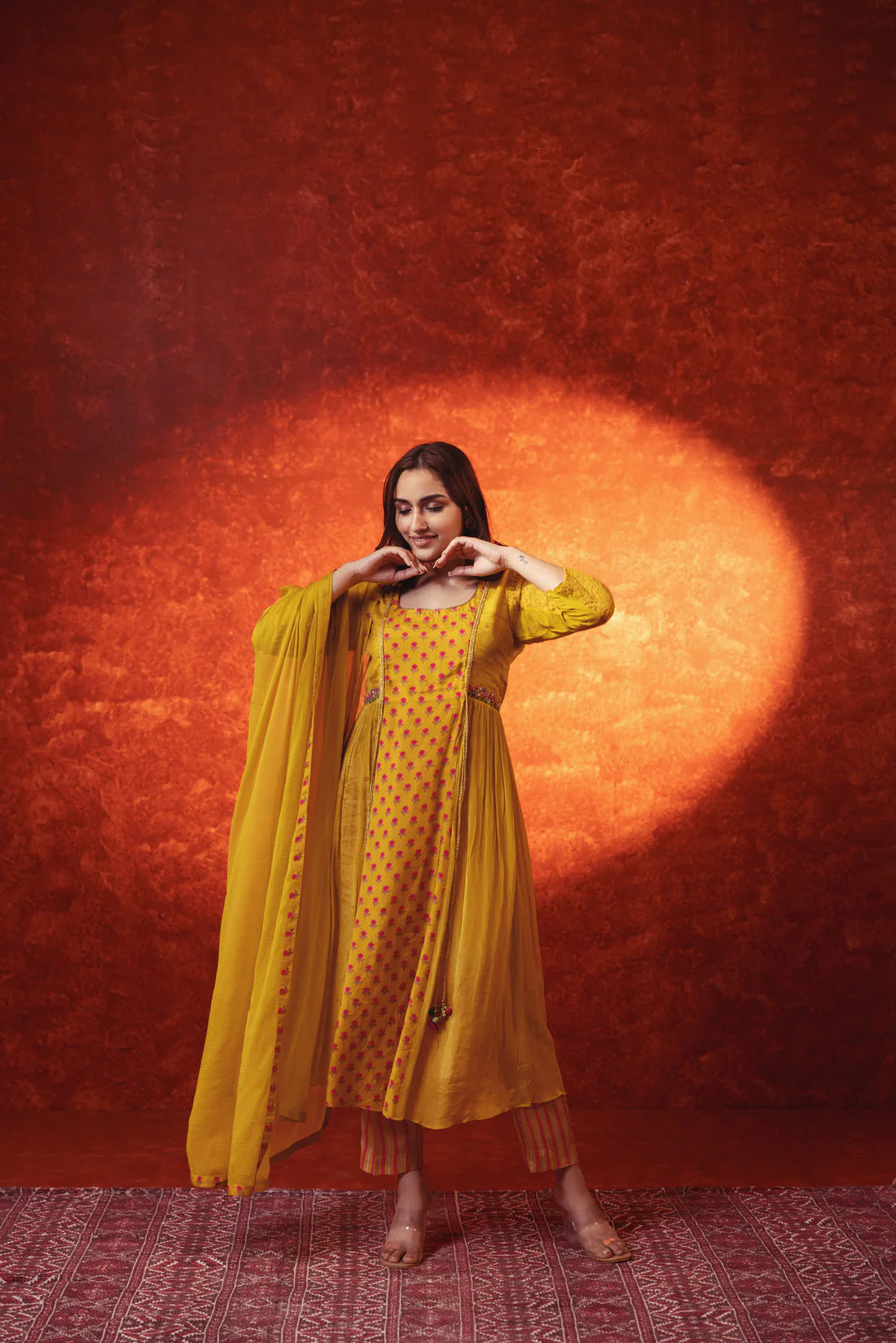 Embrace versatility with this sculpted suit that beautifully combines prints, plain fabric, and intricate embroidery. A contemporary masterpiece perfect for any occasion.
