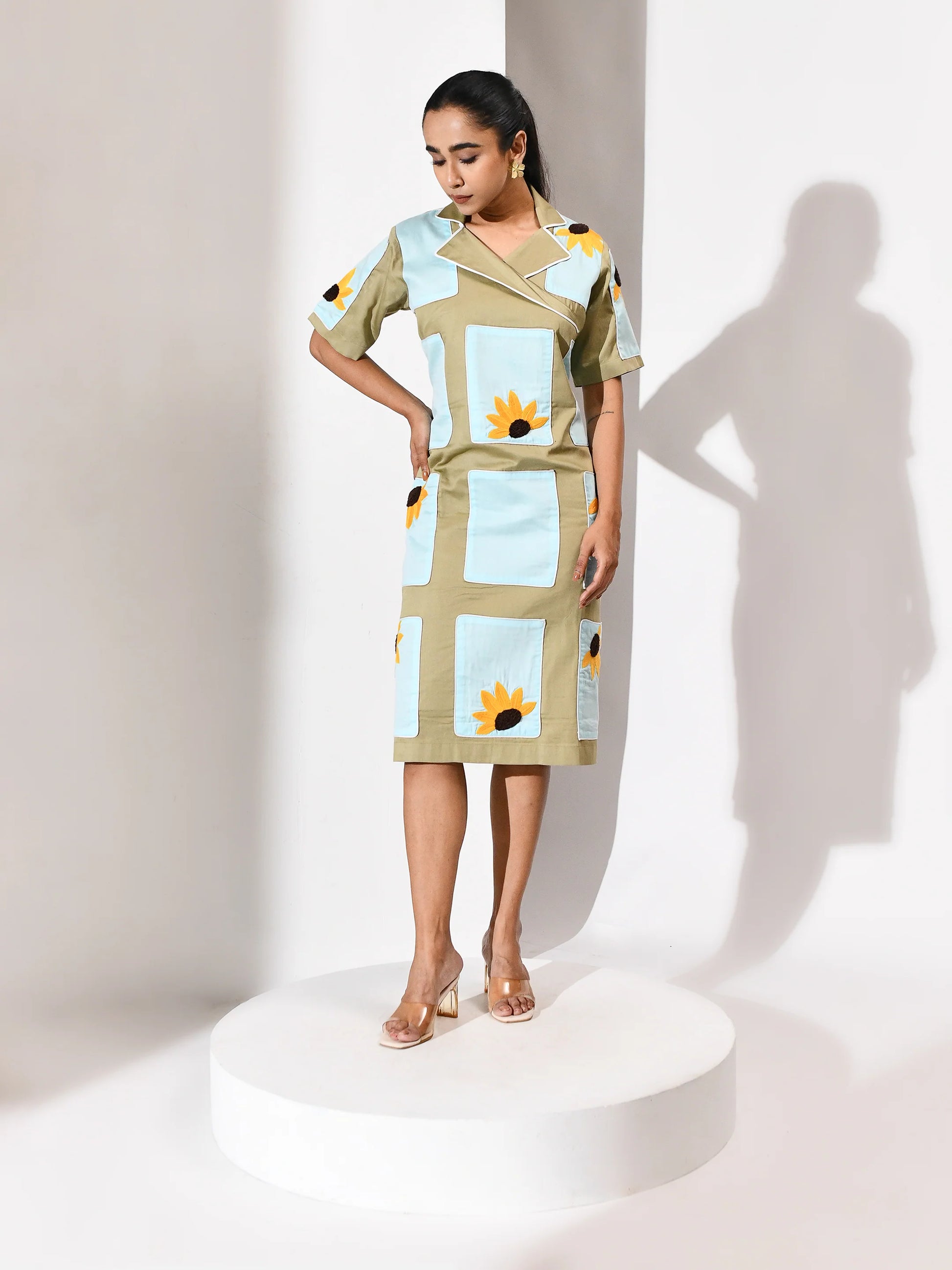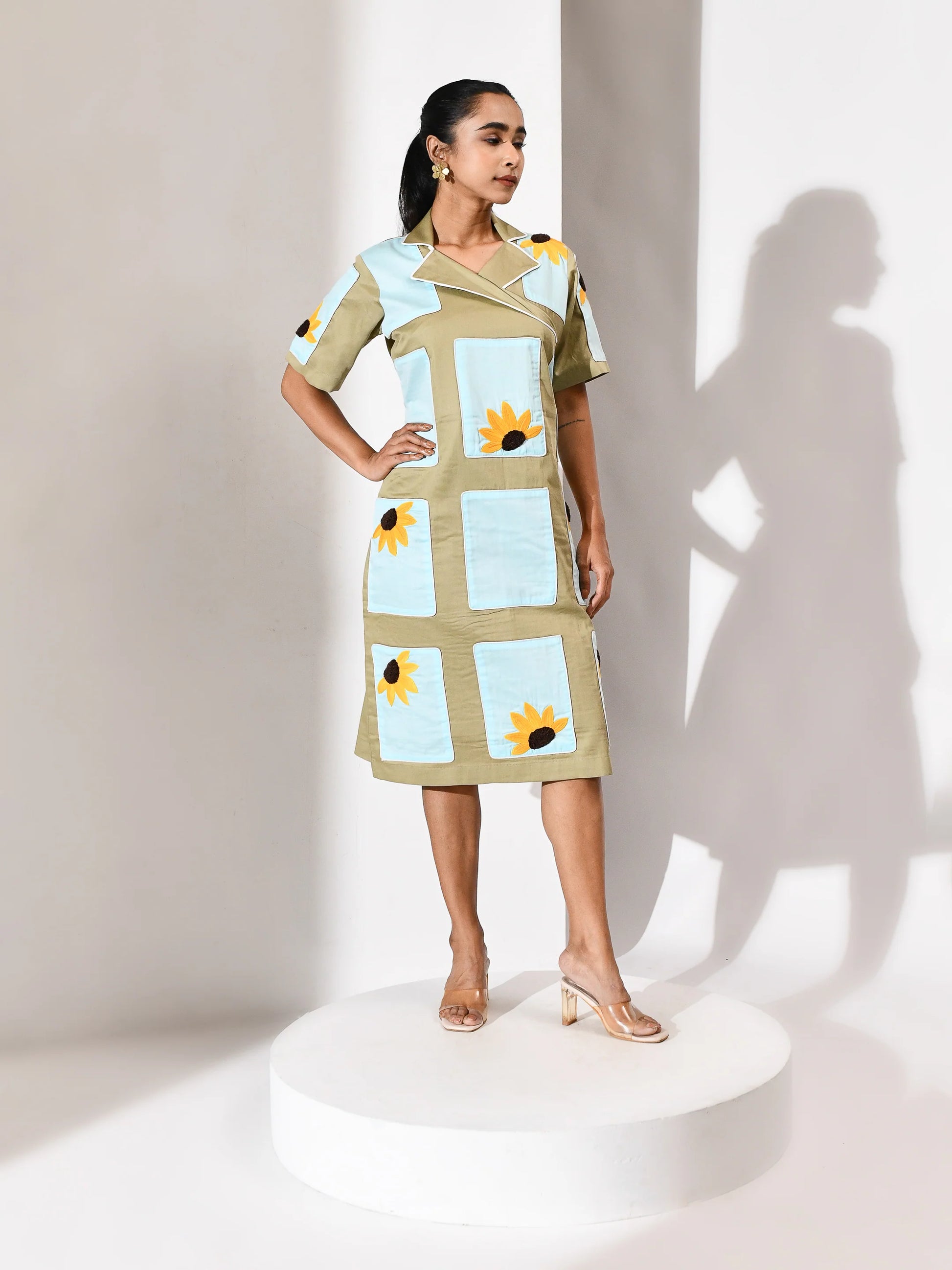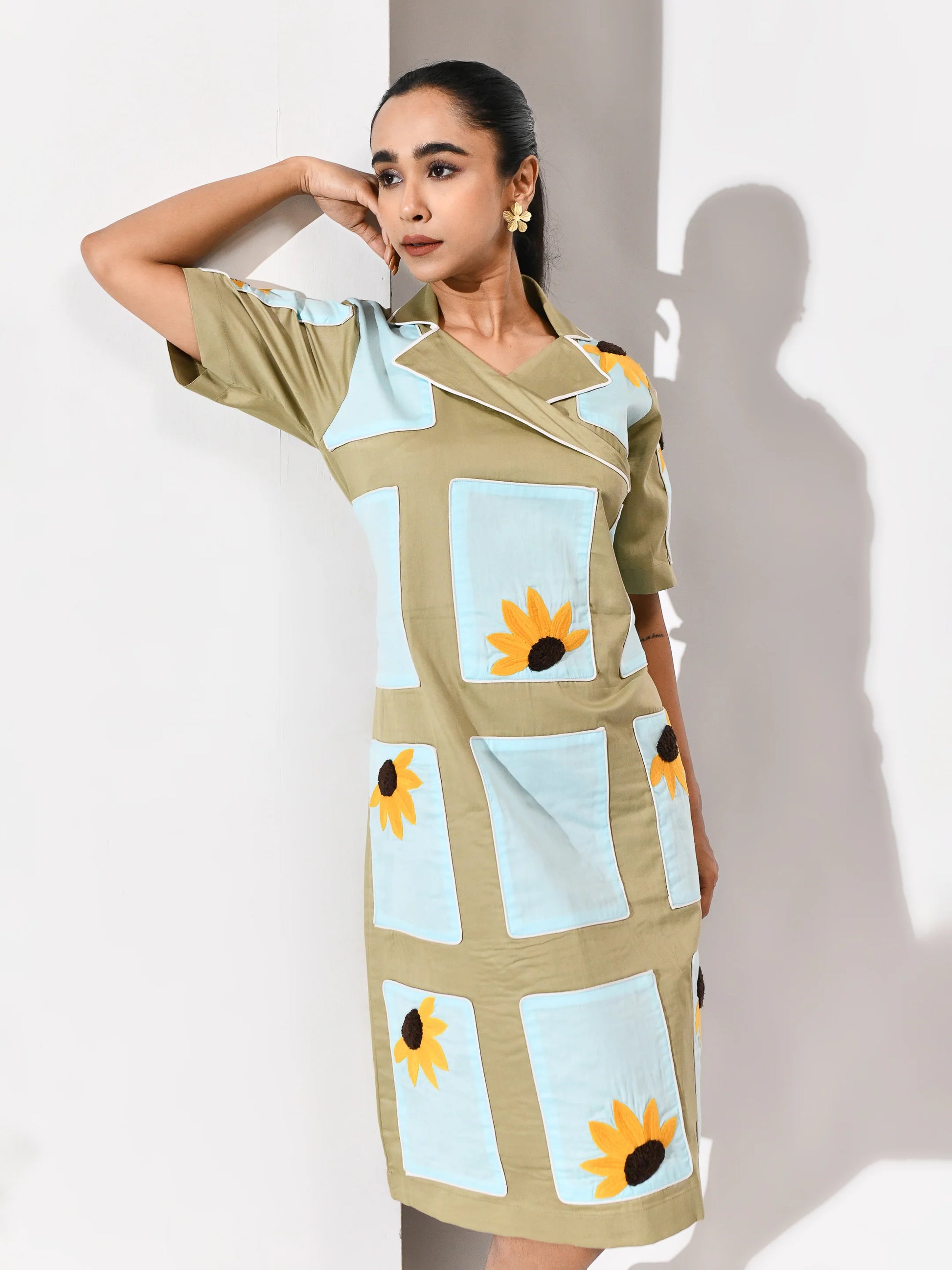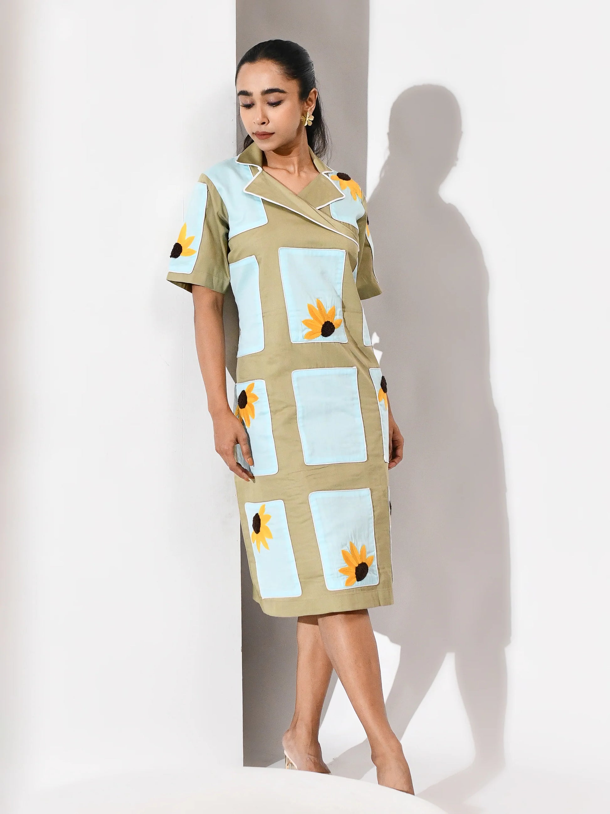 A quiet bloom beneath a clear sky. This beige and ice blue dress is a gentle interplay of earth and air—grounded in softness, lifted by light. Sunflower embroidery unfurls across the silhouette like golden memory, each petal stitched with intention. Beisun is a moment of stillness touched by warmth, crafted for the woman who carries sunlight in her stride and serenity in her soul.