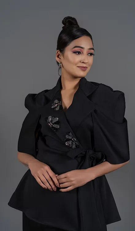 • Batsleeve jacket with embellished lapel paired up with side slit pants.