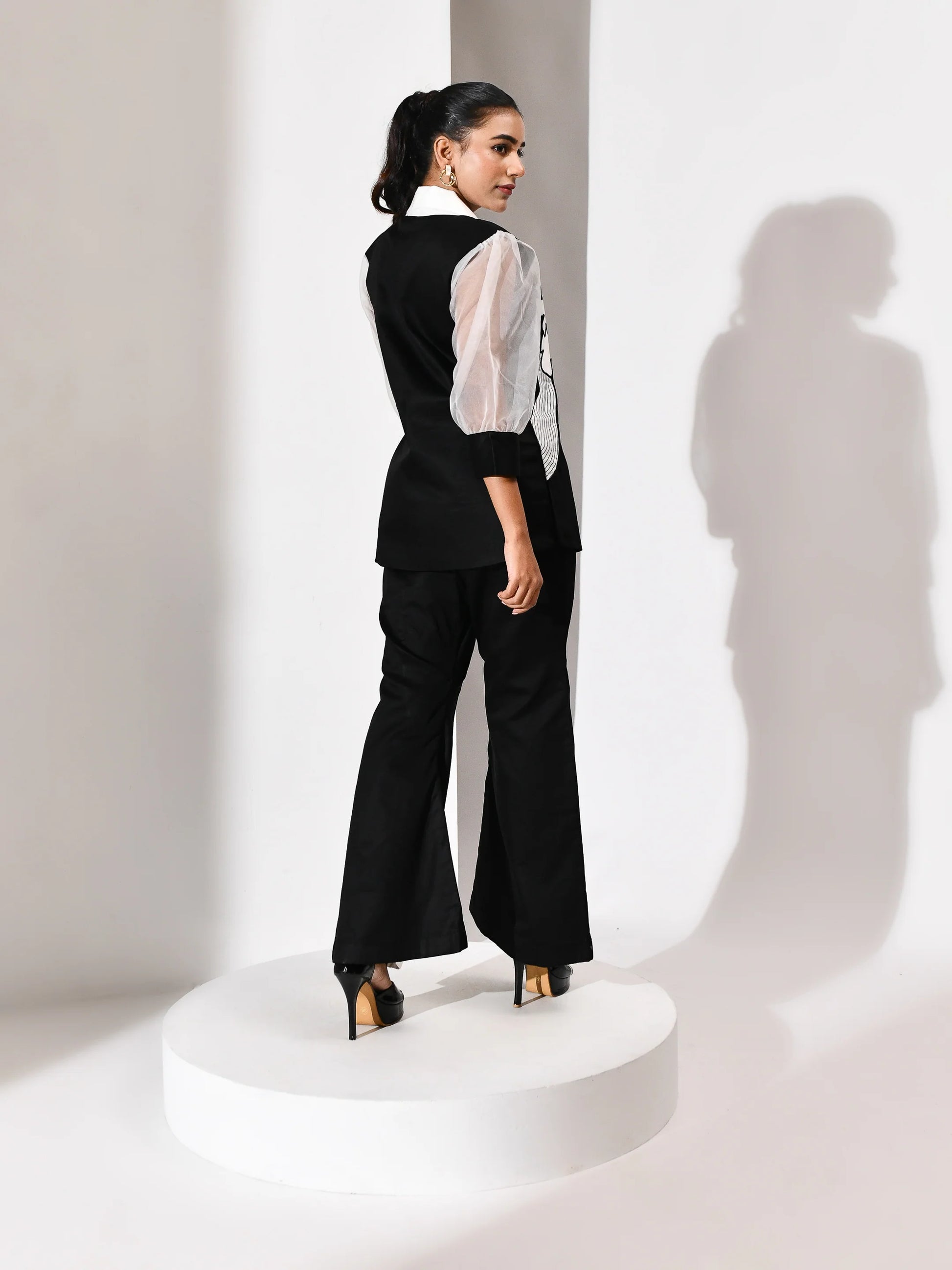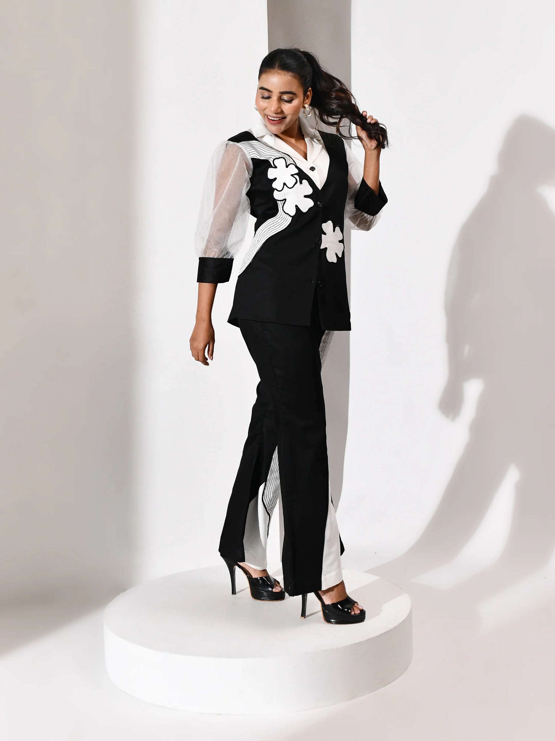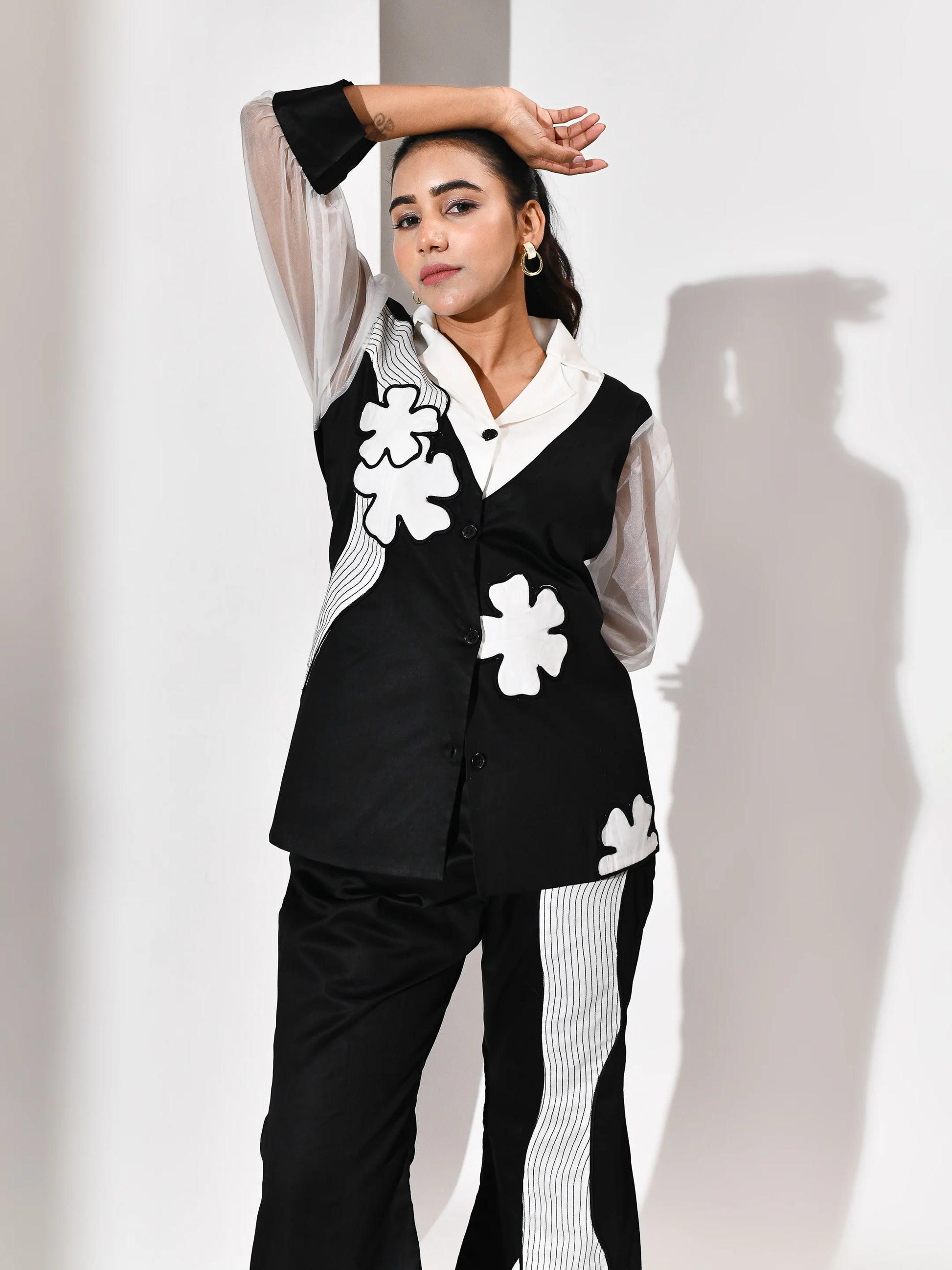 A monochrome reverie in motion. This black and white ensemble pairs architectural precision with poetic softness. The top features delicate white floral patchwork and intricate threadwork that bloom like moonlit petals across a midnight canvas. Paired with panelled leg pants that elongate the silhouette, the set balances structure and fluidity with quiet drama. Each stitch whispers craftsmanship; each panel speaks of movement. Designed for the woman who commands elegance with ease.