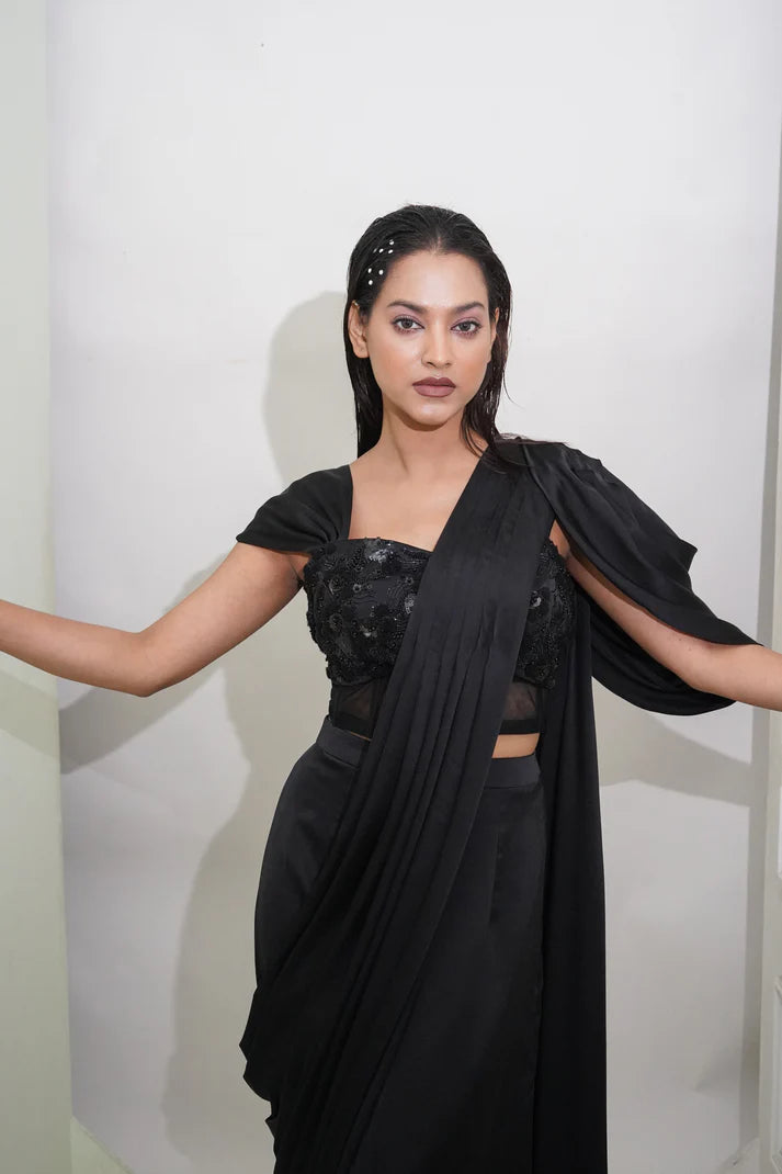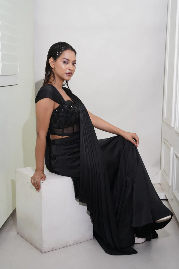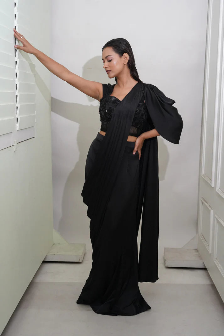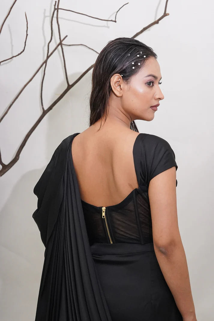 A modern all-black draped saree with a corseted blouse, sheer panels, and tonal floral accents. Features soft pleats, a deep-cut back, and a sleek zip closure for a bold yet elegant look.