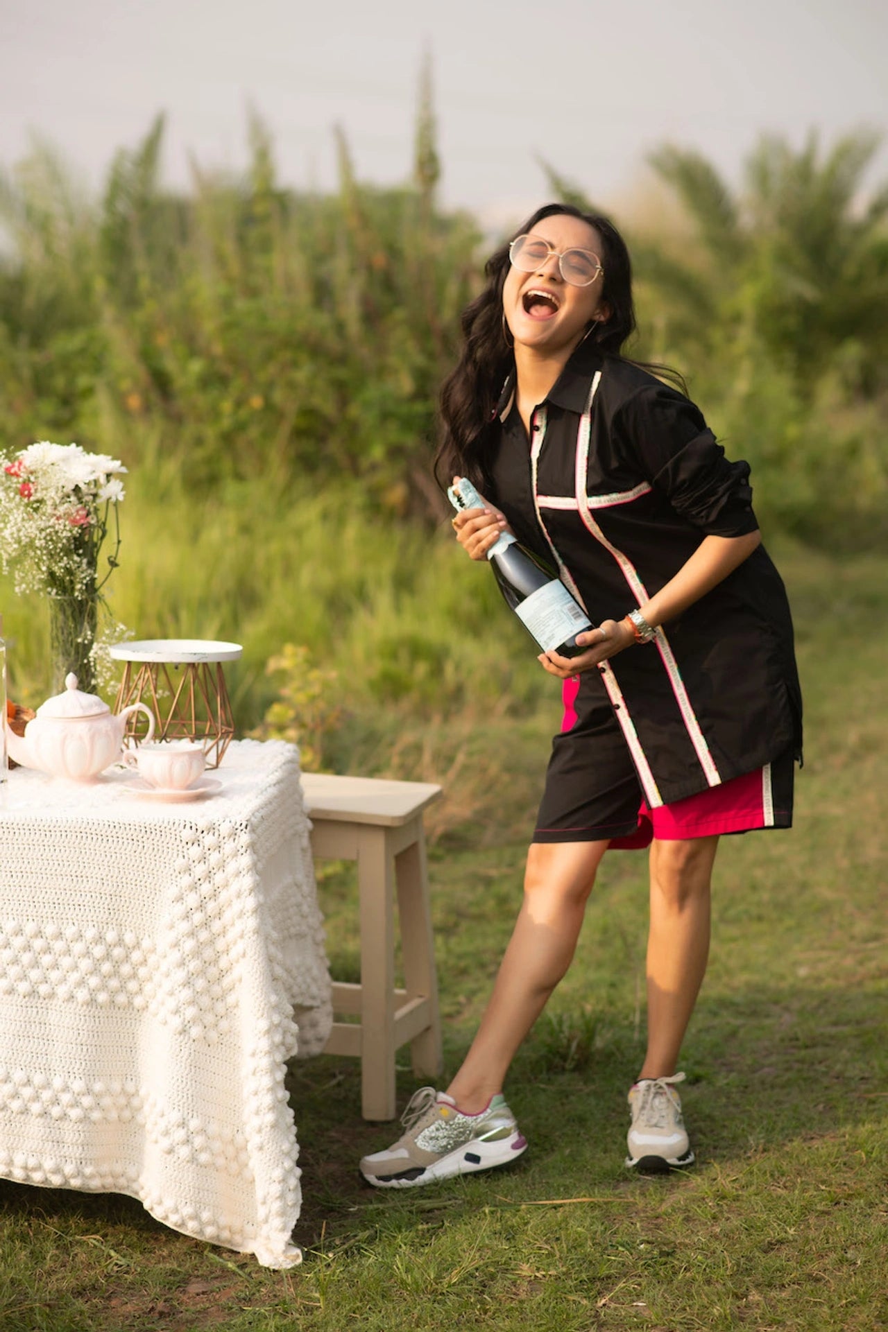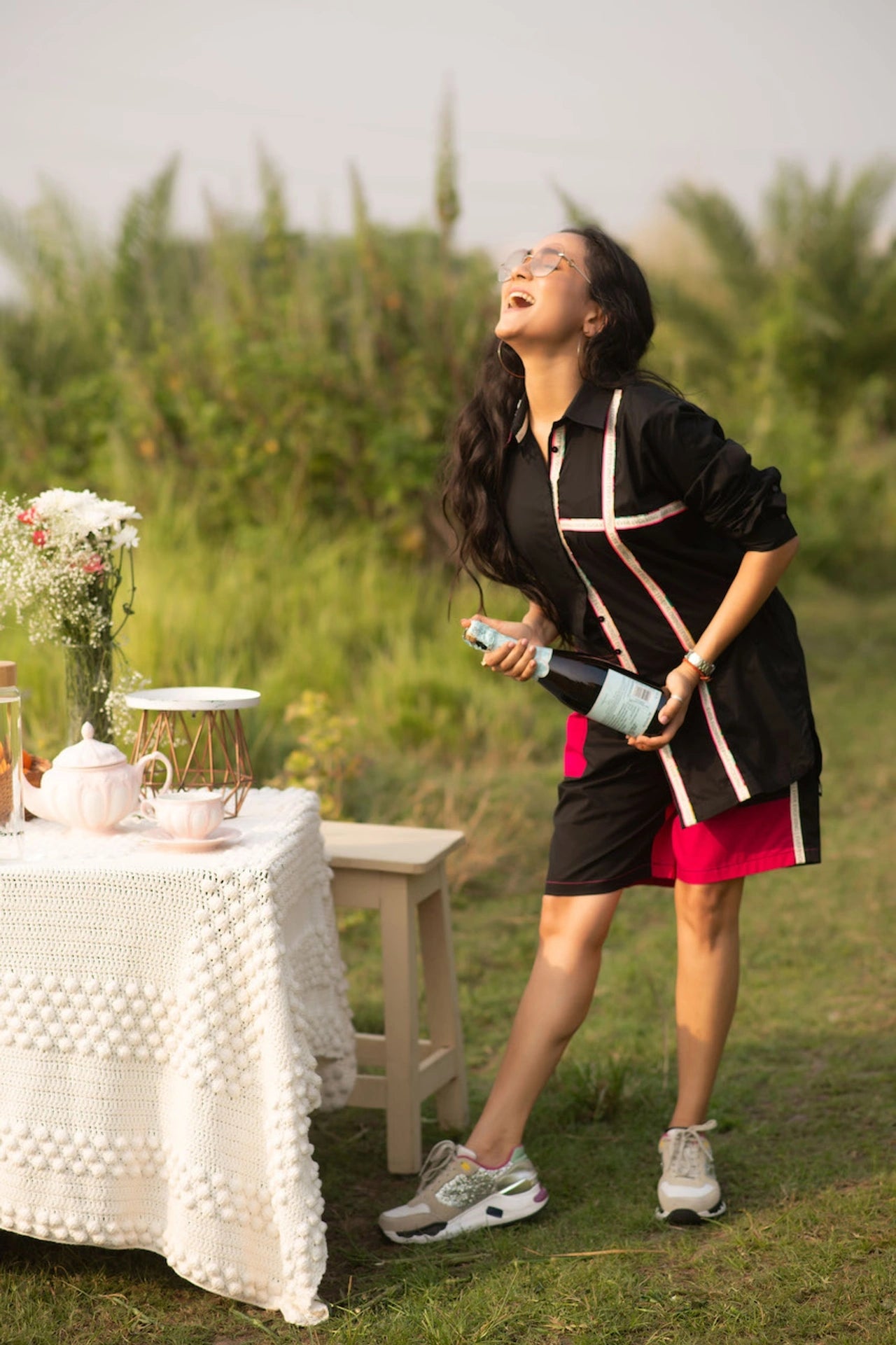 Introducing a casual shirt & short set in black & pink solids. A perfect outfit choice when you head out for coffee or lunch in the summer. This ensemble is also lined with our motto on a lace reading "Ever Flowing..Ever Evolving !