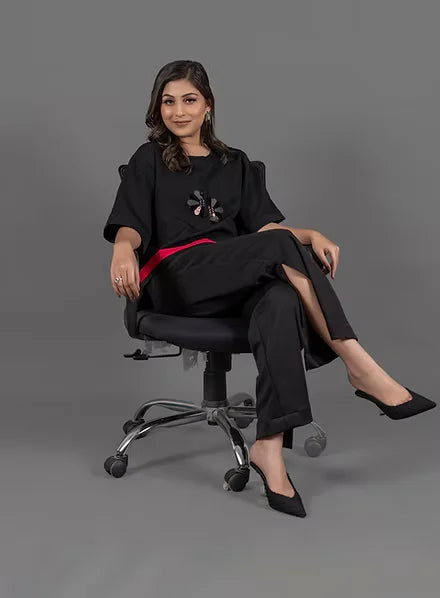 • Black embellished t-shirt cord set with minimal pink details. Chic and comfortable.