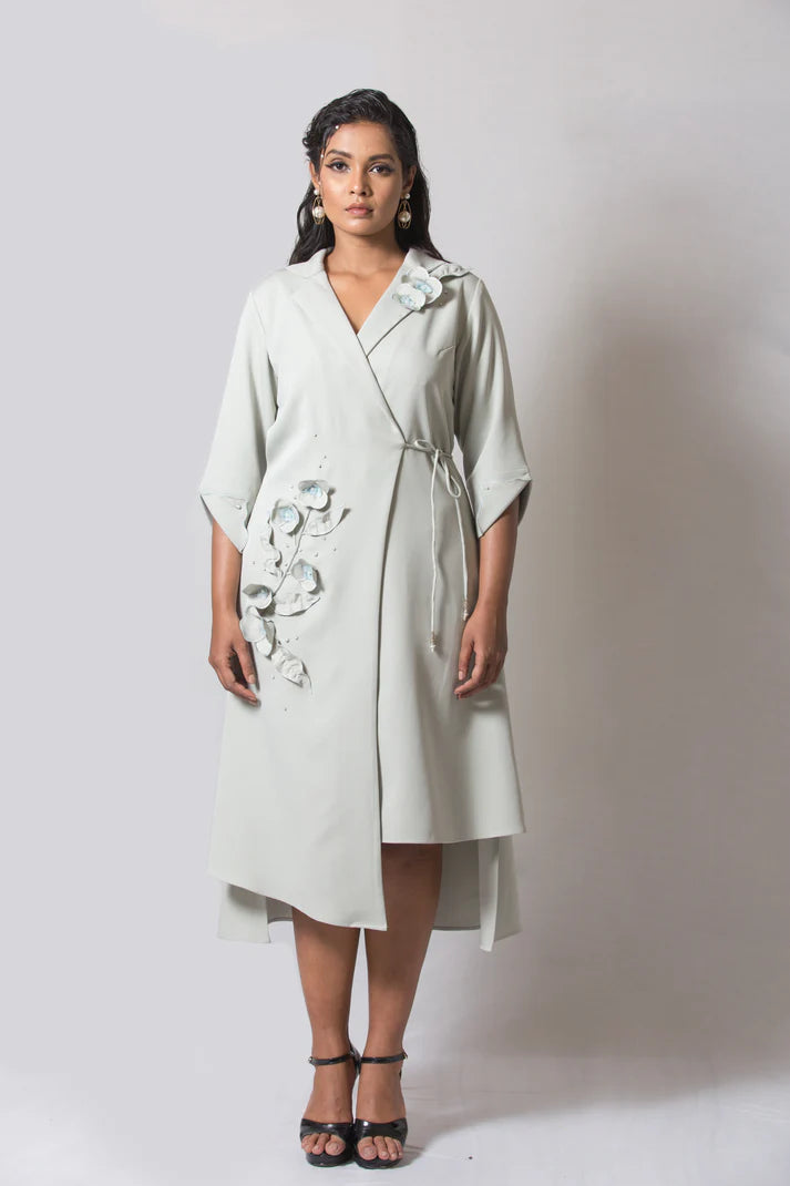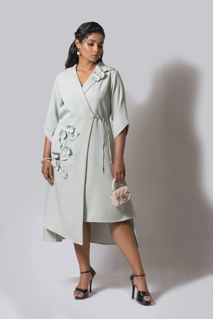 Blazer-style wrap dress , featuring a sharp V-neckline, side tie-up closure, and asymmetric hem. Detailed with 3D floral embroidery for a refined yet contemporary look — a perfect blend of power dressing and feminine elegance.