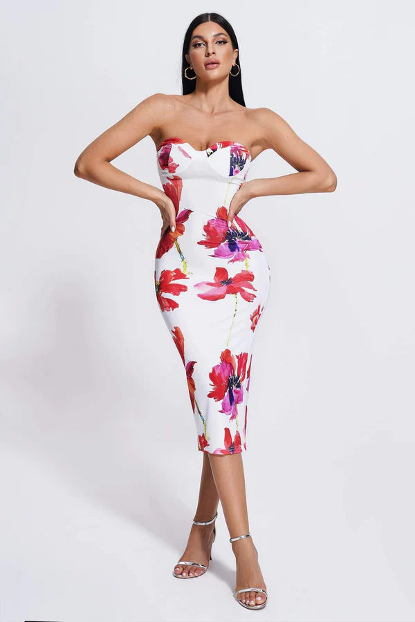 The Blossom Printed Midi Dress, a beautiful and elegant piece that combines romance and sophistication with its stunning print design! This dress is crafted from a stretchy bandage material that provides both comfort and support, and features a flattering sweetheart neckline and off-shoulder sleeves that showcase your shoulders. The fitted waistline accentuates your curves before flowing into a chic and graceful midi length, complete with a stylish slit at the back.Pair it with delicate earrings and high heels for a polished and sophisticated look. Don't miss out on the chance to add the Danni Printed Midi Dress to your wardrobe today!