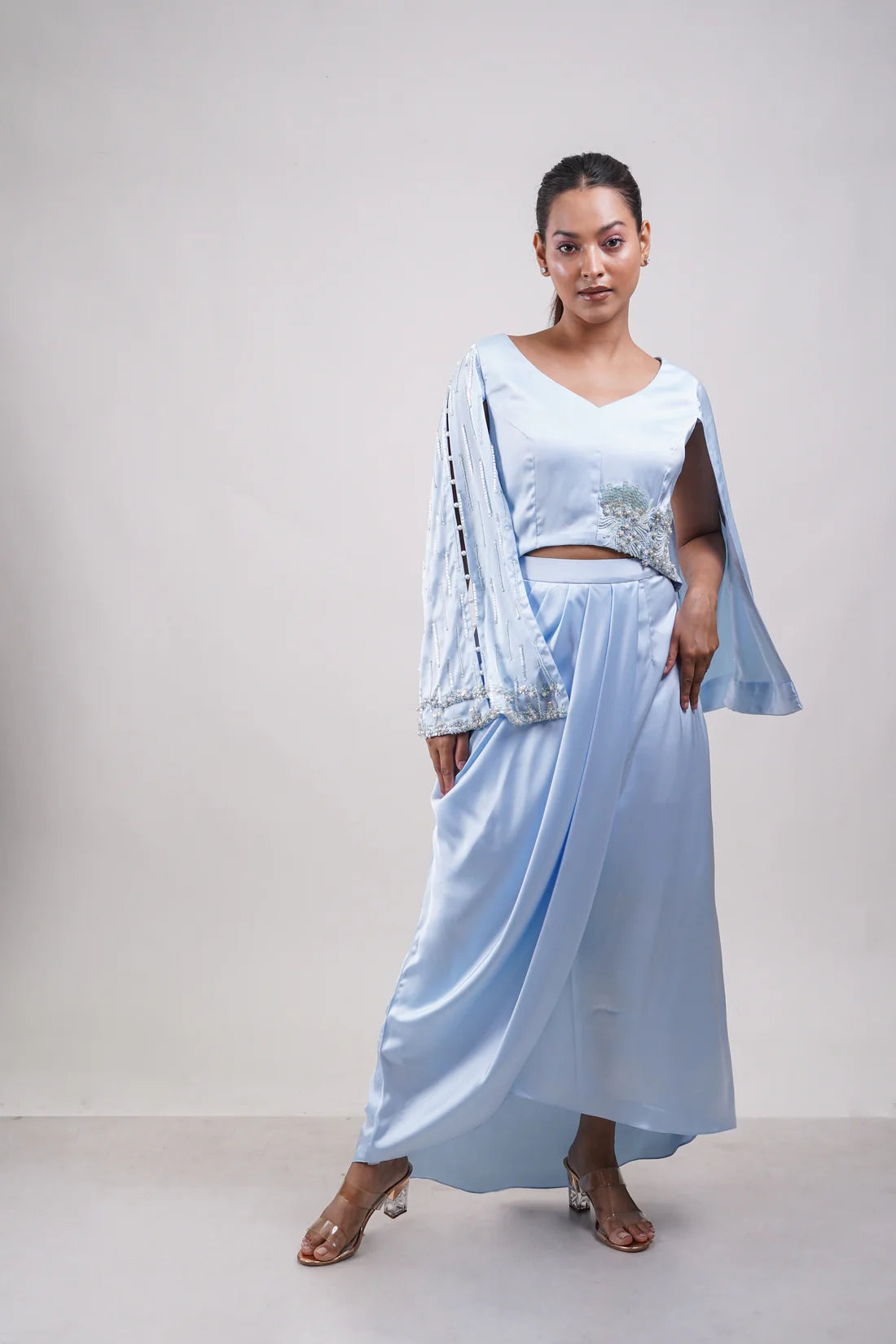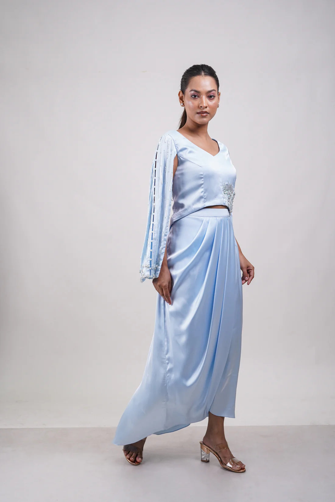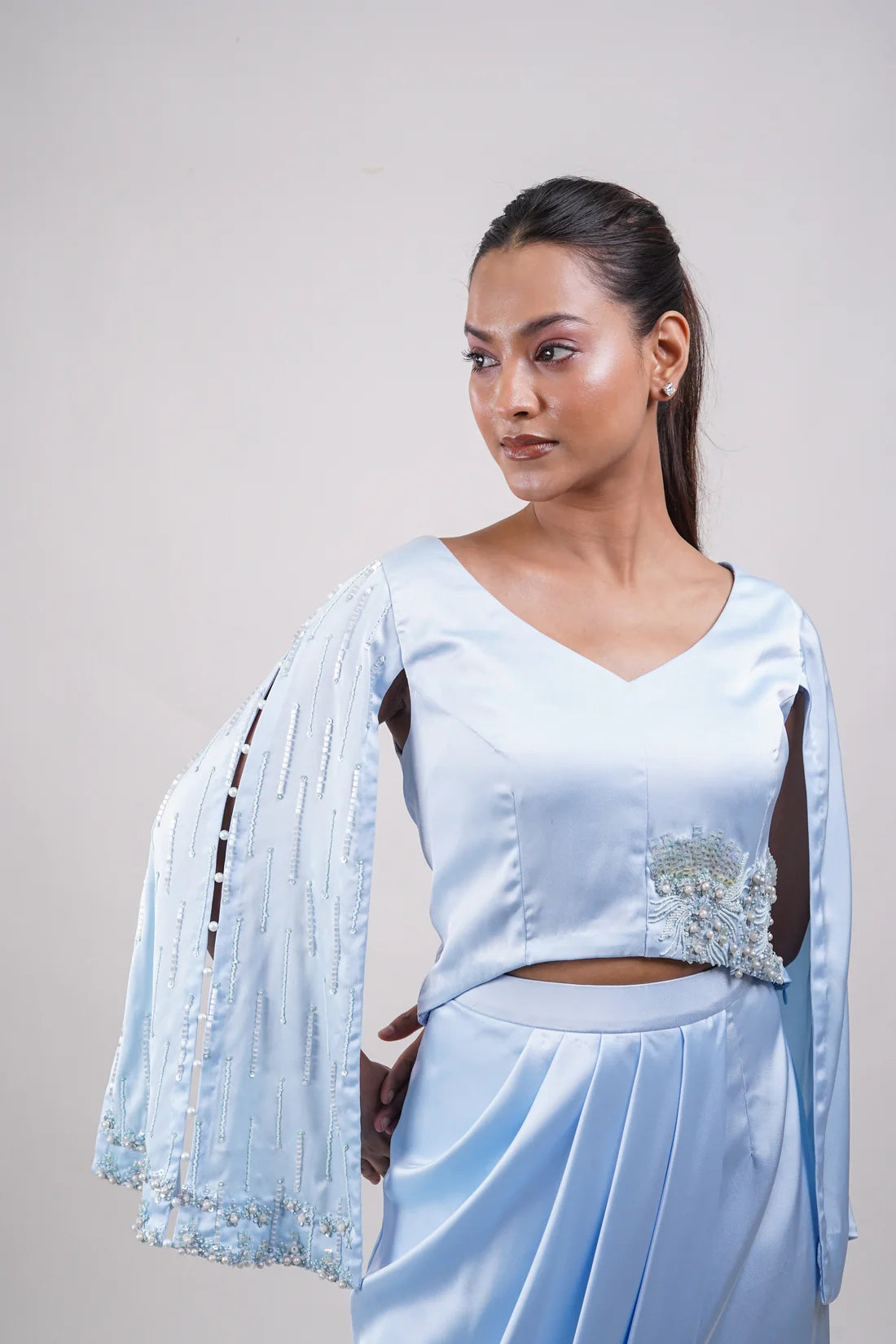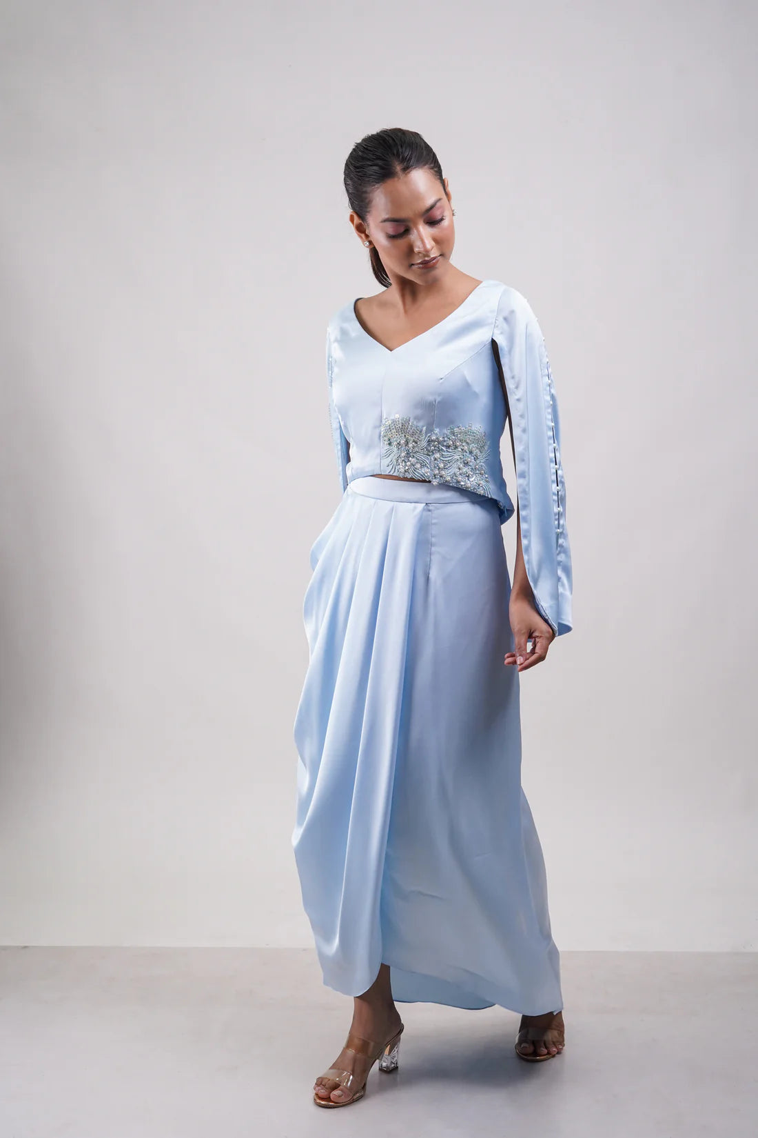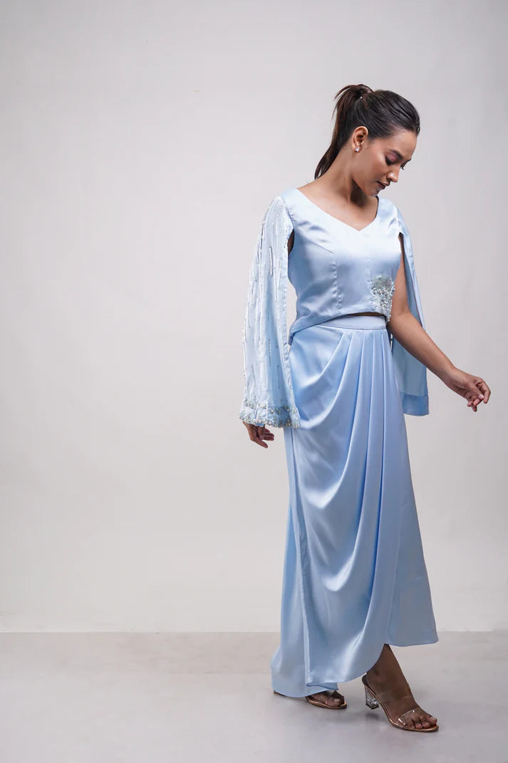 Powder blue set with slit-sleeve embellished blouse and a sculpted drape skirt. Delicate beadwork adds a touch of whimsy and elegance.