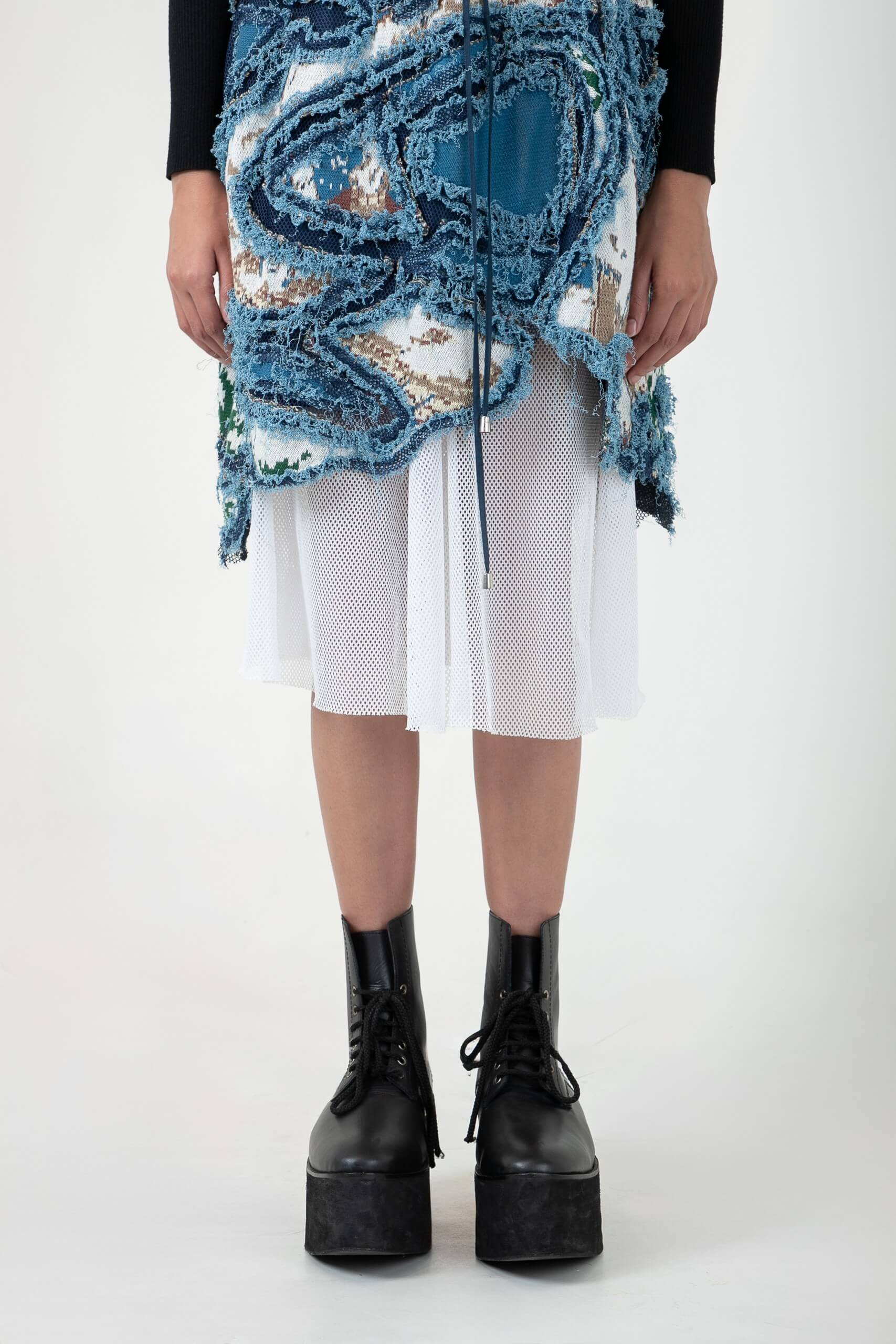 Jacquard knitted sleeveless short dress with skirt inspired by Hokusai artwork with applique work in a deconstructed look, comes with scallop design at the hem along with functional pockets, zipper opening at the neck and adjustable waist channel for effortless comfort and style.