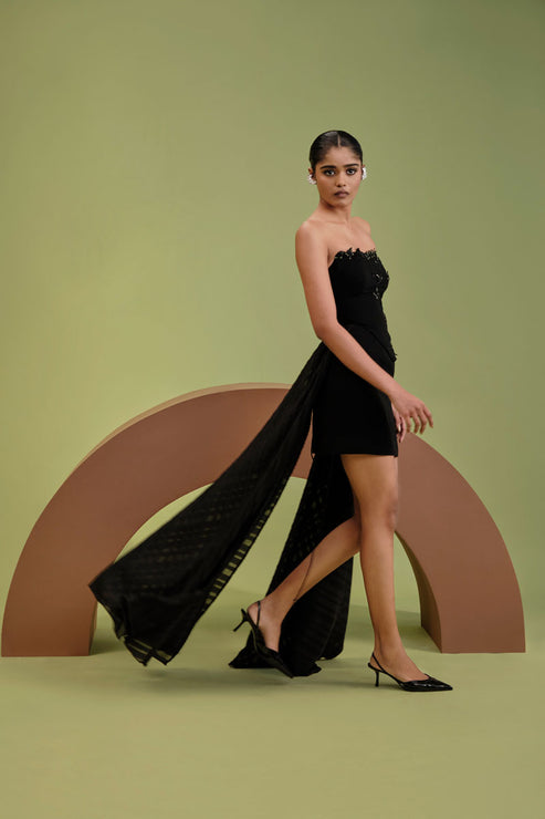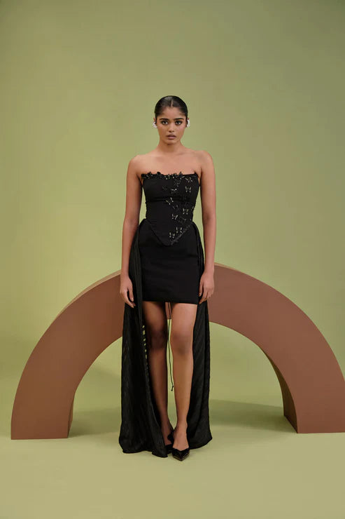 This dramatic black ensemble is a fusion of structure and fluid elegance. The top is a sculpted corset crafted from honeycomb fabric, featuring rich hand-embroidered butterflies for a textured, ethereal look. A sweeping attached drape is seamlessly integrated into the corset, ensuring high-drama movement. This statement top is paired with a sleek pencil mini skirt, creating a commanding, modern silhouette.
