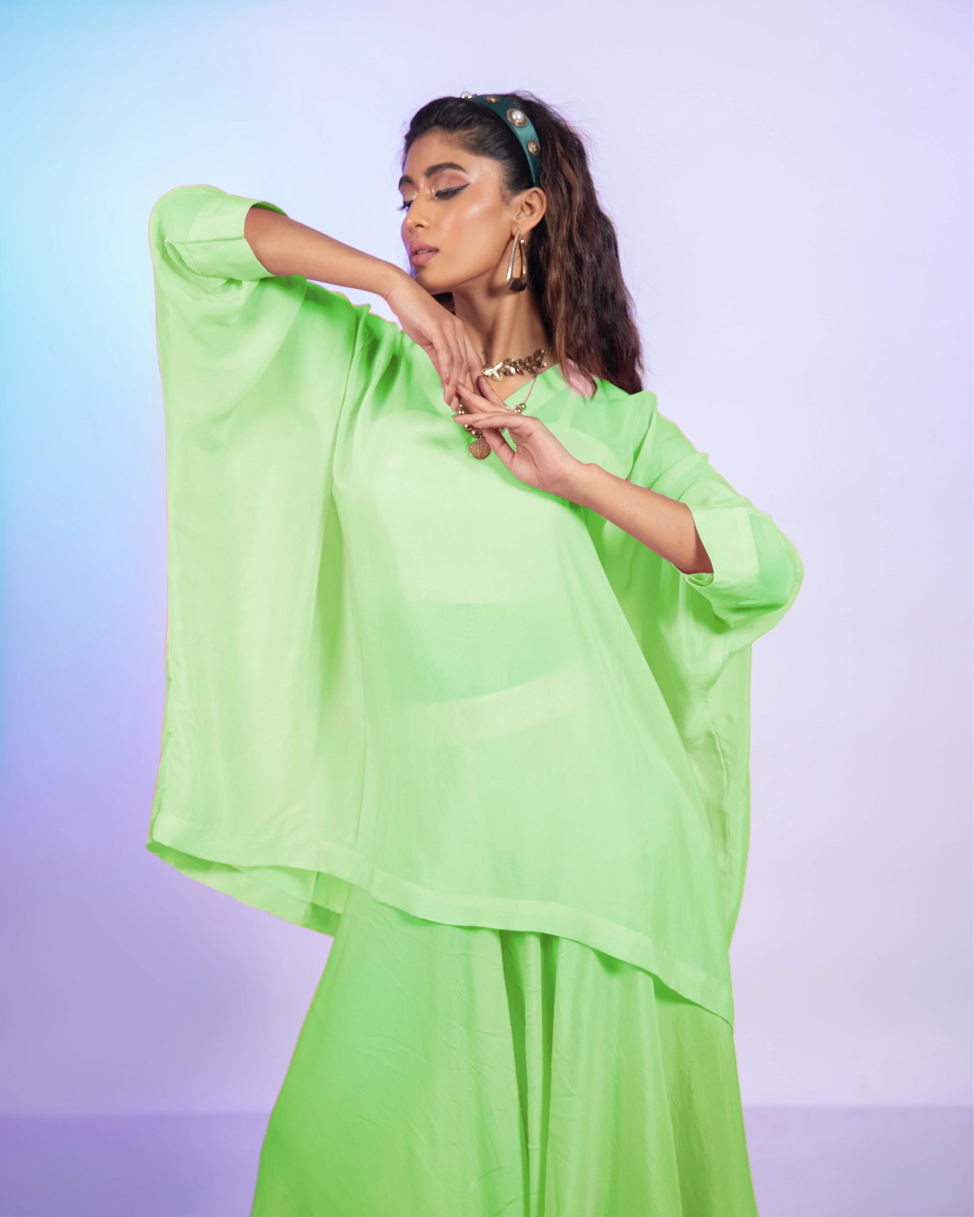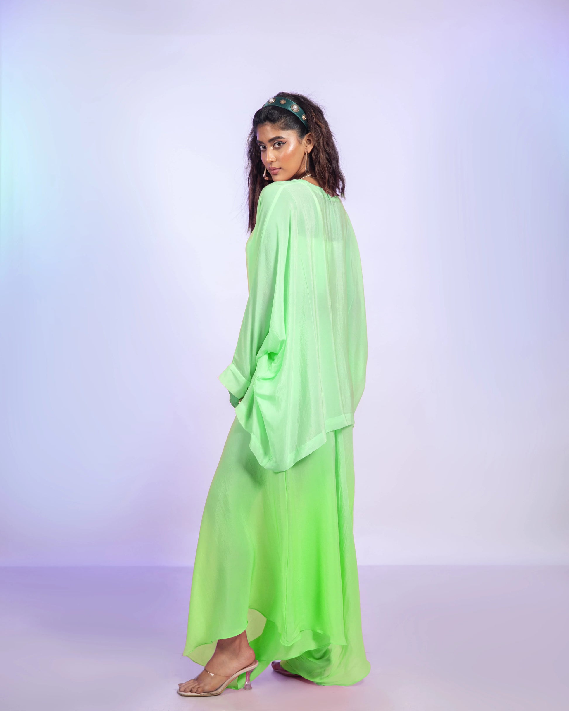 Get ready to turn heads in this vibrant green ombre draped pants and comfy green kaftan top set! The pants feature a gorgeous ombre effect that flows effortlessly, giving you a relaxed yet stylish look, while the kaftan top adds the ultimate comfort with style. Whether you’re out for a casual brunch, beach day, shopping run, or just lounging in style, this set is all about easy-going vibes and fun, colorful fashion. Perfect for those days when you want to feel fabulous and comfy at the same time!