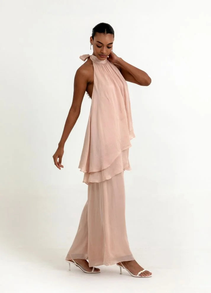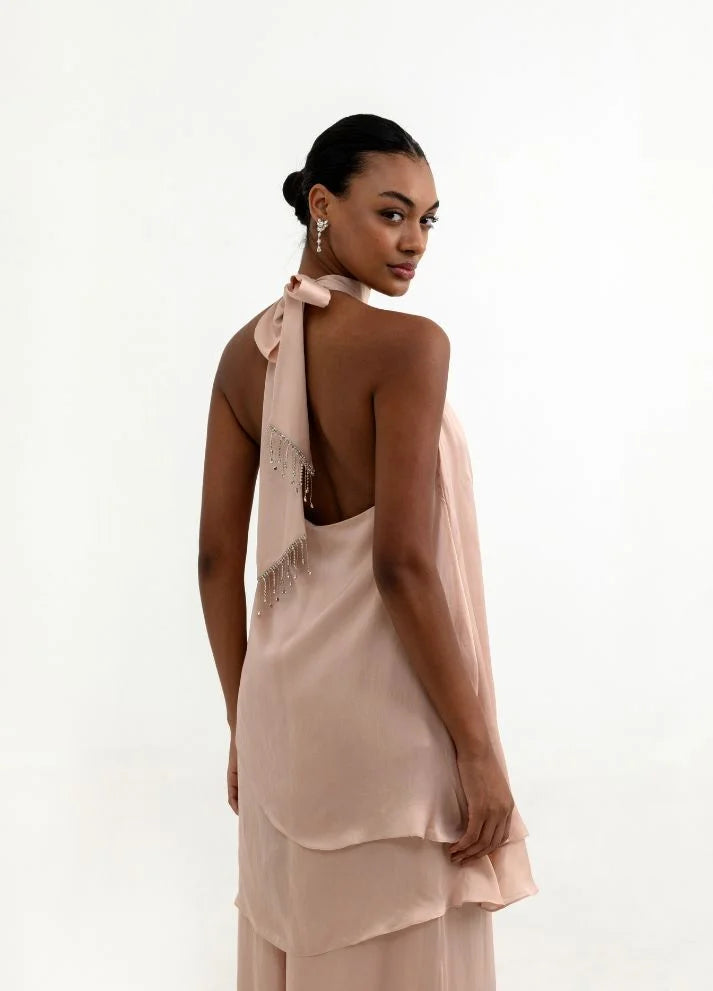 Soft as a whisper, the Claire co-ord set exudes grace and fluidity. The halter top cascades in layered drapes, tied at the nape with a languid bow accented by delicate crystal fringe, catching the light with every step. Flowing wide-leg trousers mirror the top’s ethereal movement, creating a harmonious silhouette that celebrates freedom and femininity. From evening soirees to summer galas, this look invites elegance without effort.