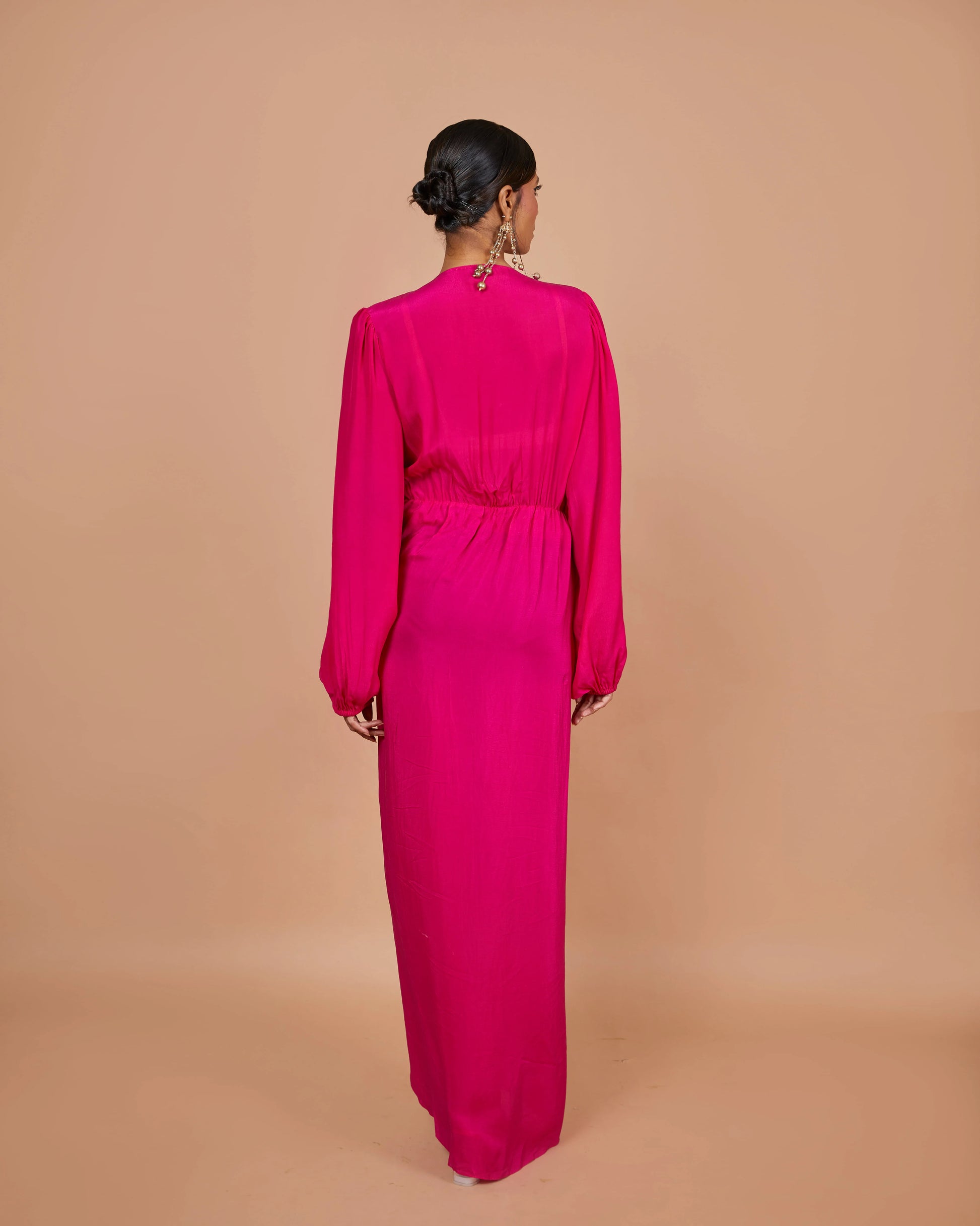 Make a statement in this pink high-slit formal dress, designed with a romantic draped silhouette that flows beautifully with every step. Perfect as an evening gown, wedding guest dress, or modern bridesmaid dress, it blends feminine charm with effortless style for any special occasion.