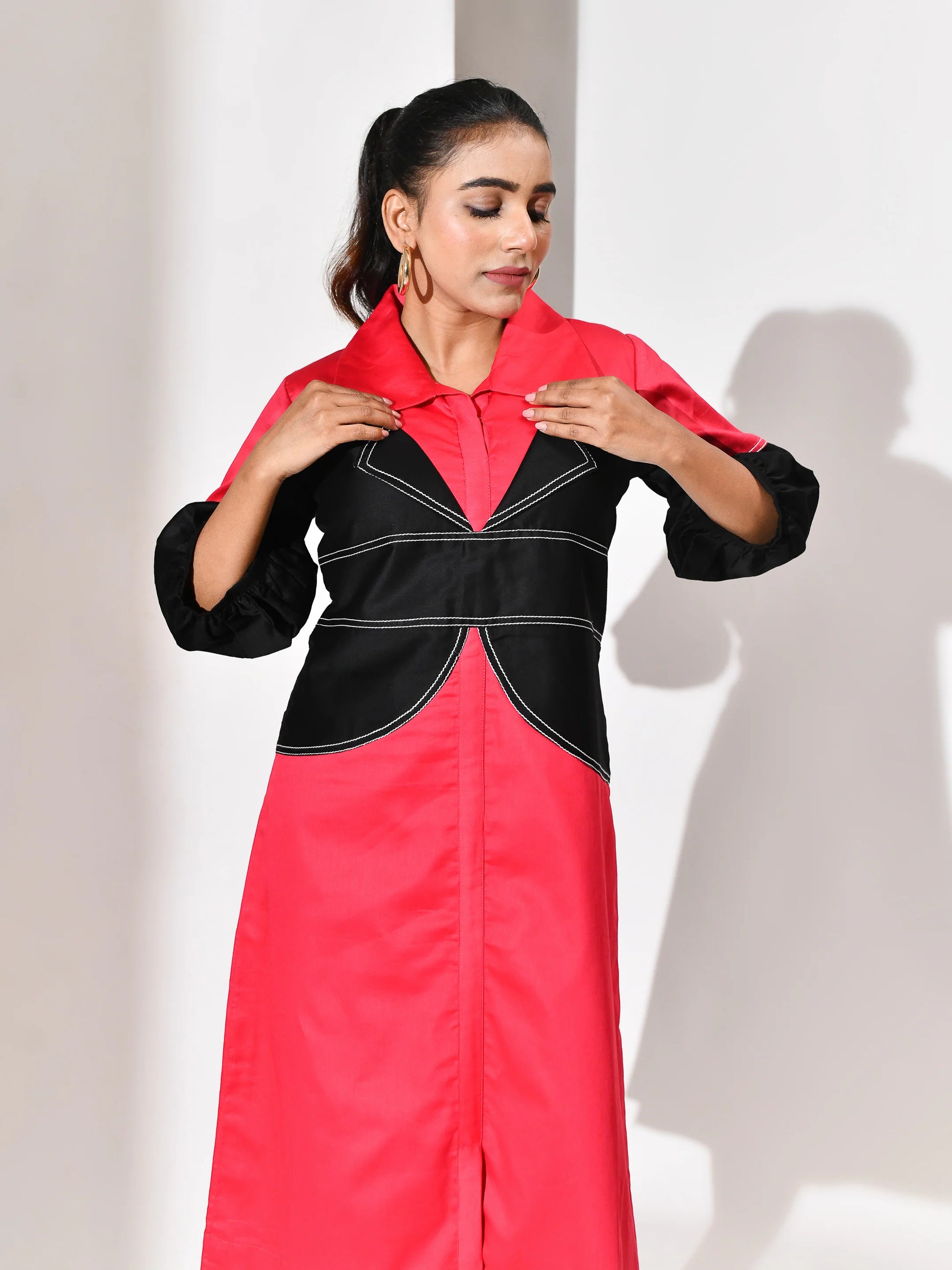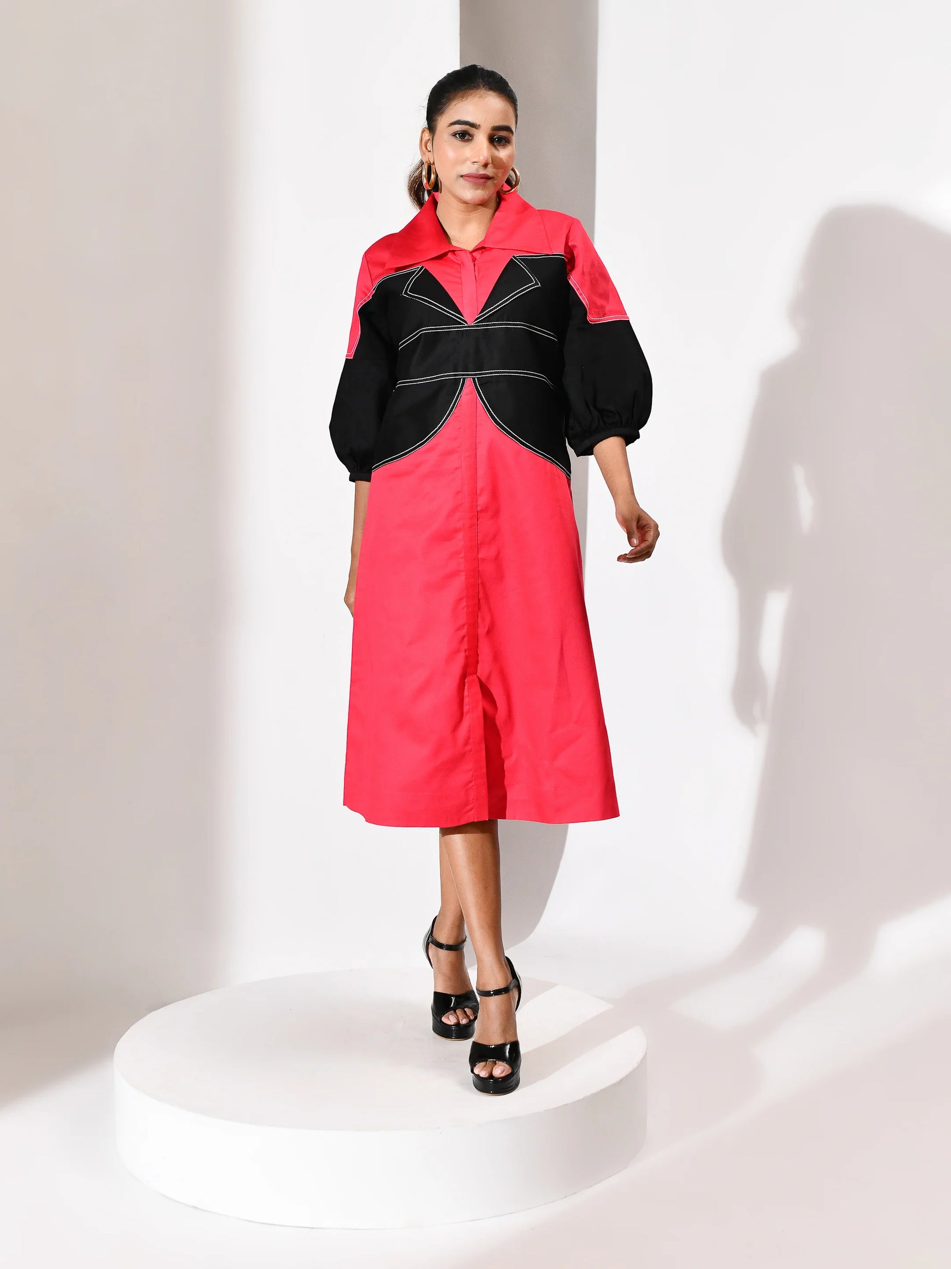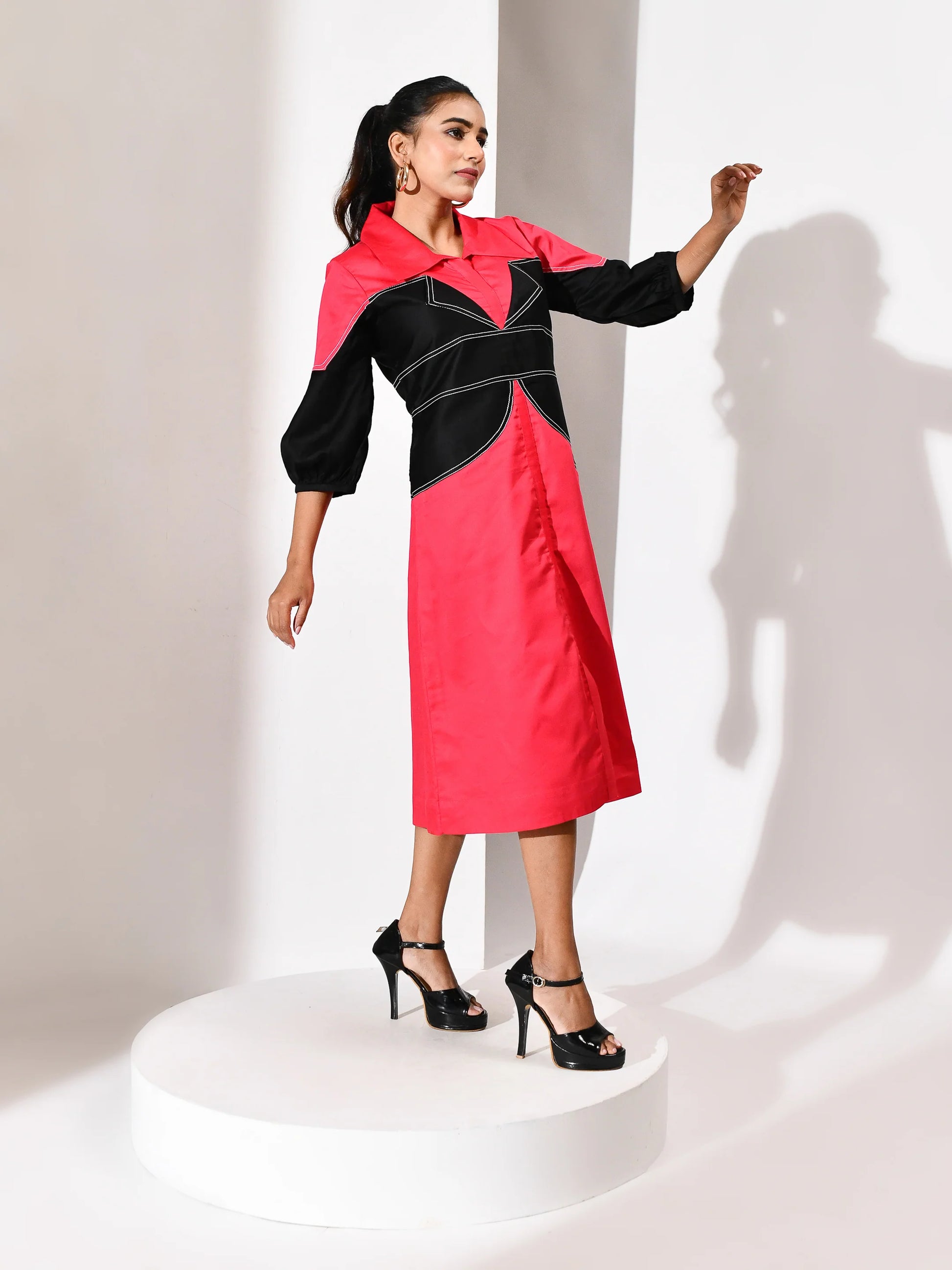 A gesture of duality. This pink dress is softened by hue, yet sharpened by design—its black collar a bold punctuation against blush. The silhouette is fluid, but the neckline holds intention. Collara is a study in balance: where sweetness meets structure, and every detail speaks in quiet contrast.
