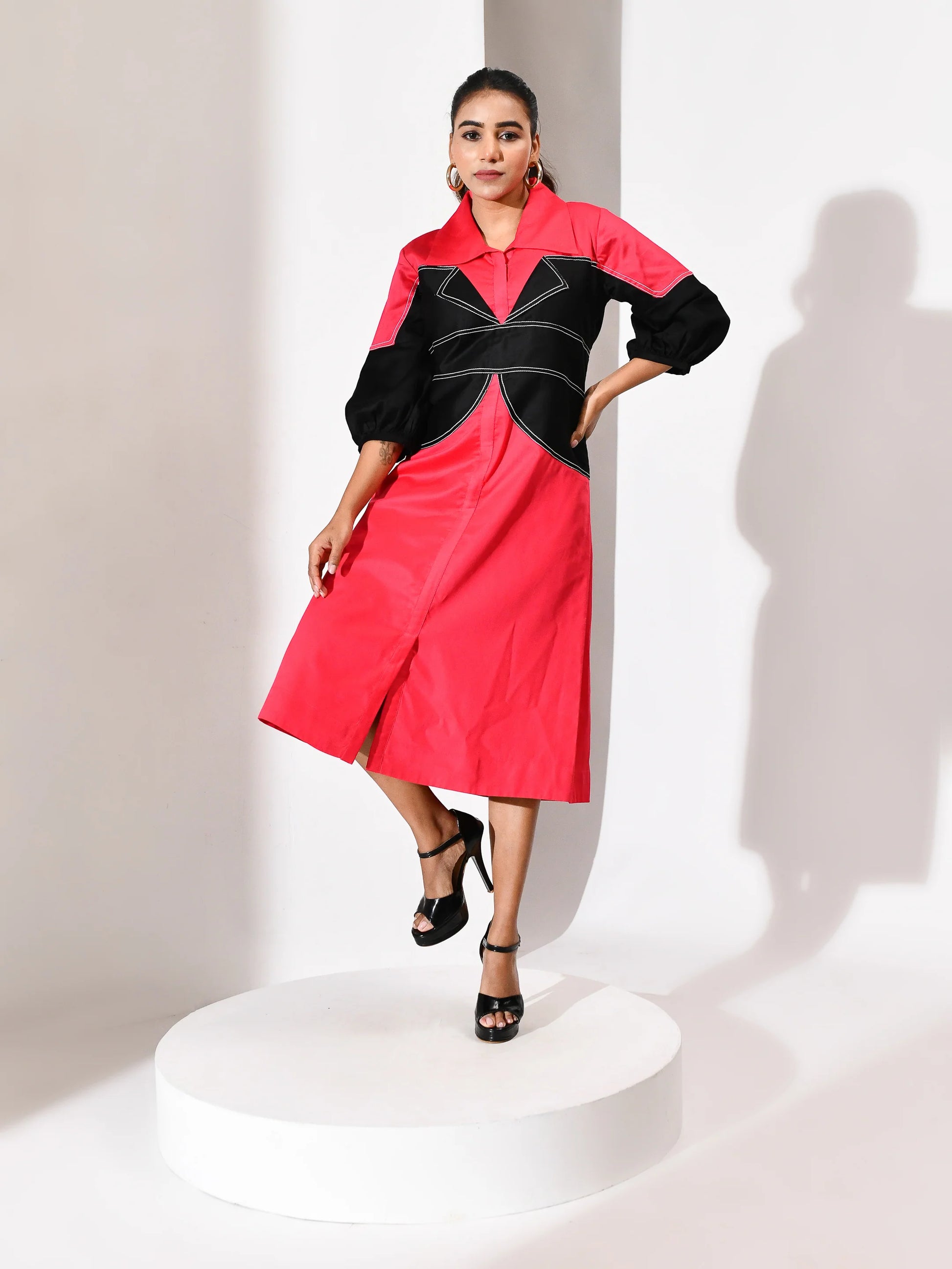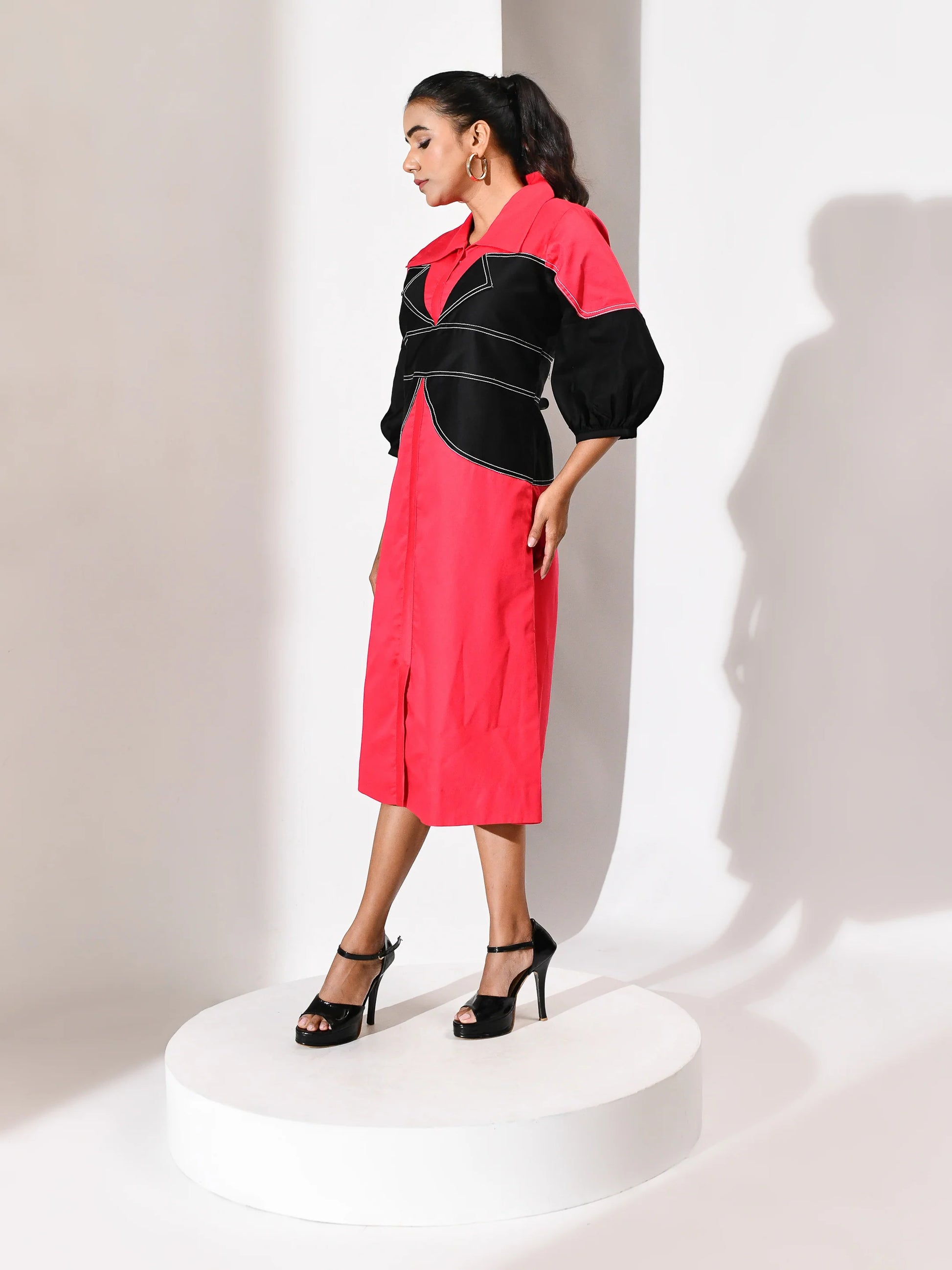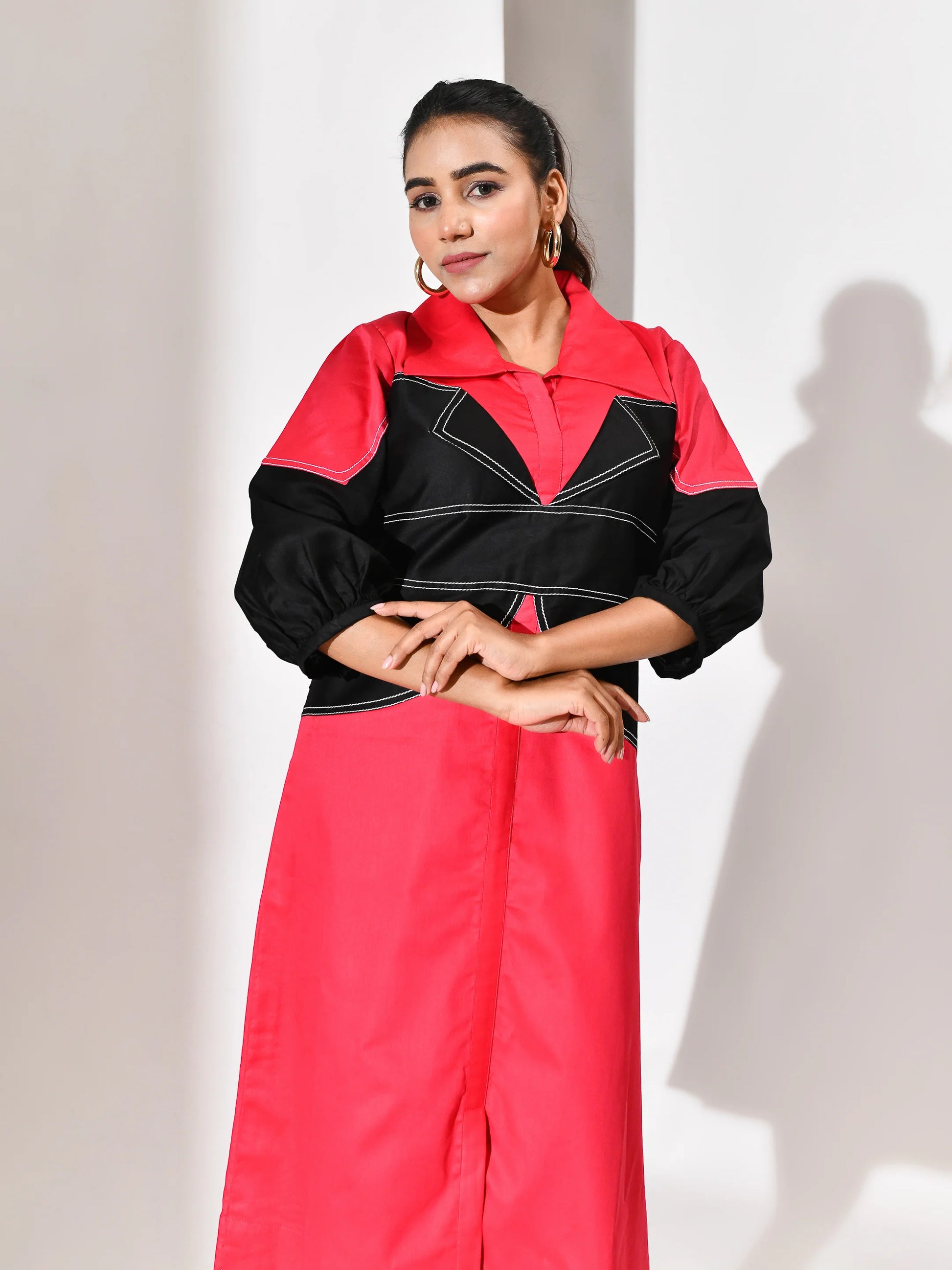 A gesture of duality. This pink dress is softened by hue, yet sharpened by design—its black collar a bold punctuation against blush. The silhouette is fluid, but the neckline holds intention. Collara is a study in balance: where sweetness meets structure, and every detail speaks in quiet contrast.