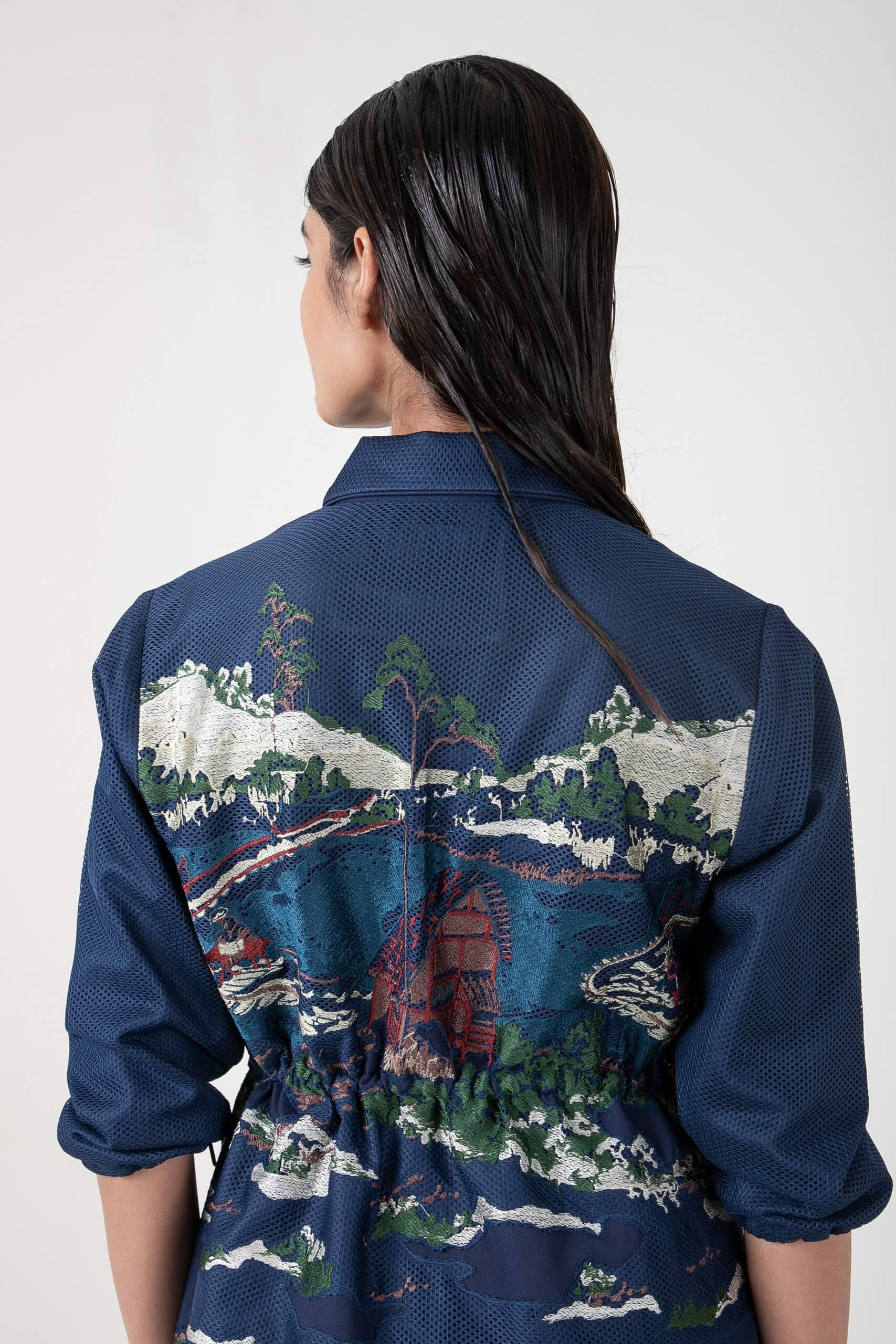 Embroidered short dress inspired by Hokusai artwork with intricate appliqué design, featuring functional pockets and adjustable waist and sleeve channels for effortless comfort and style.
