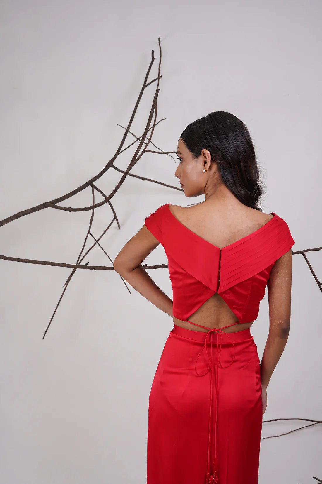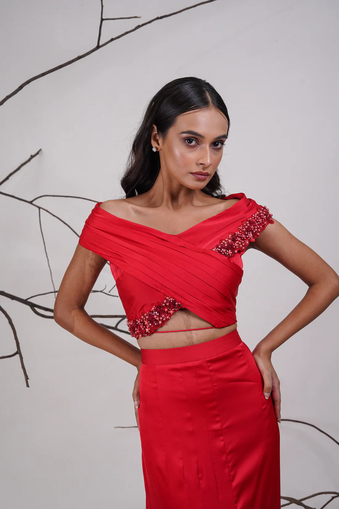 A bold red off-shoulder co-ord set with pleated detailing, beaded accents, and a front-slit skirt — sleek, structured, and striking.