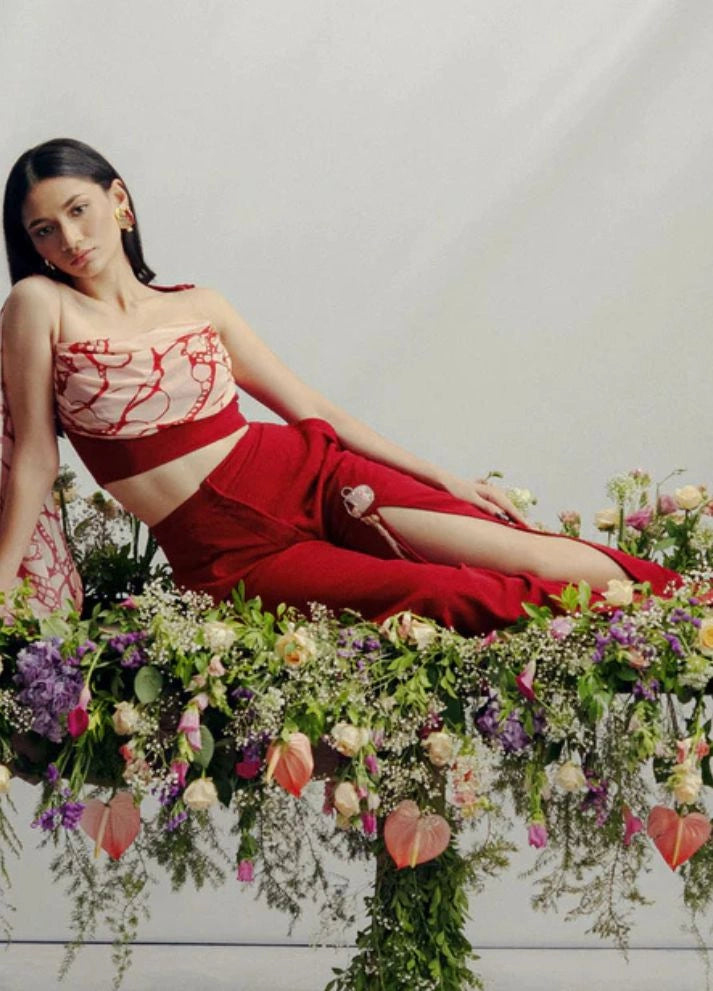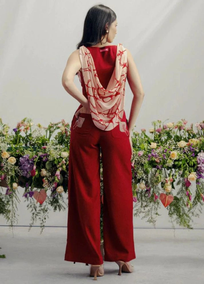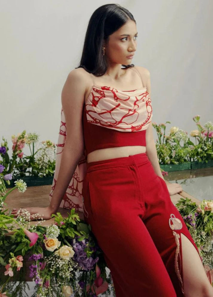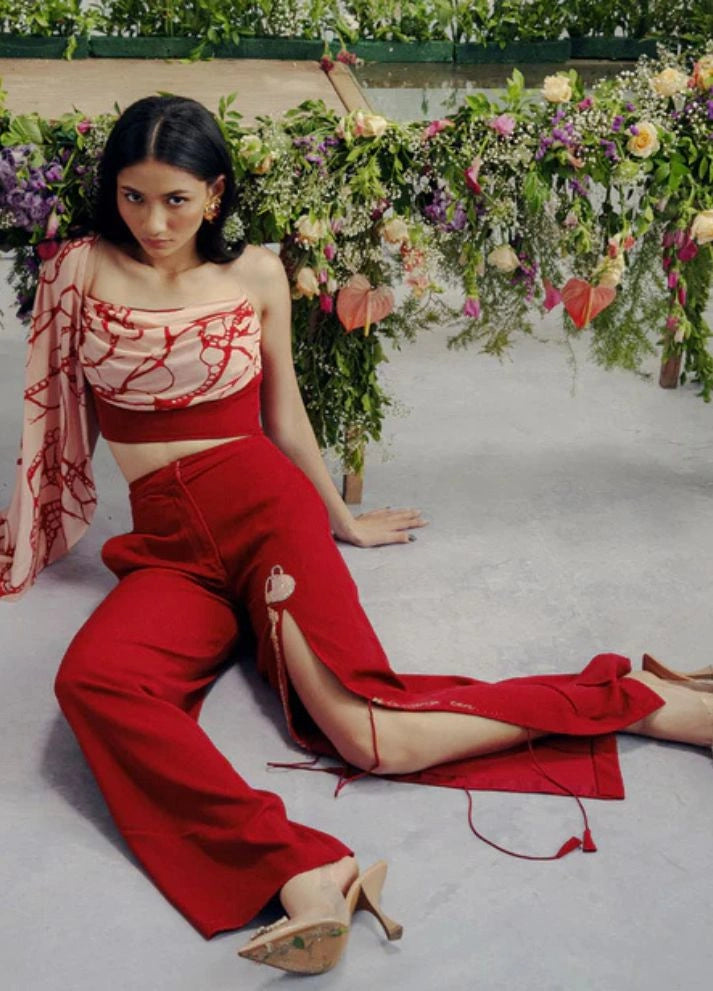 Spilling the Tea Tie-Up Slit Pants: One-legged cutout trousers showcasing intricate 100% hand embroidery, depicting a playful chai spill motif. The tie-up slit detail adds a dynamic edge to this standout silhouette.
