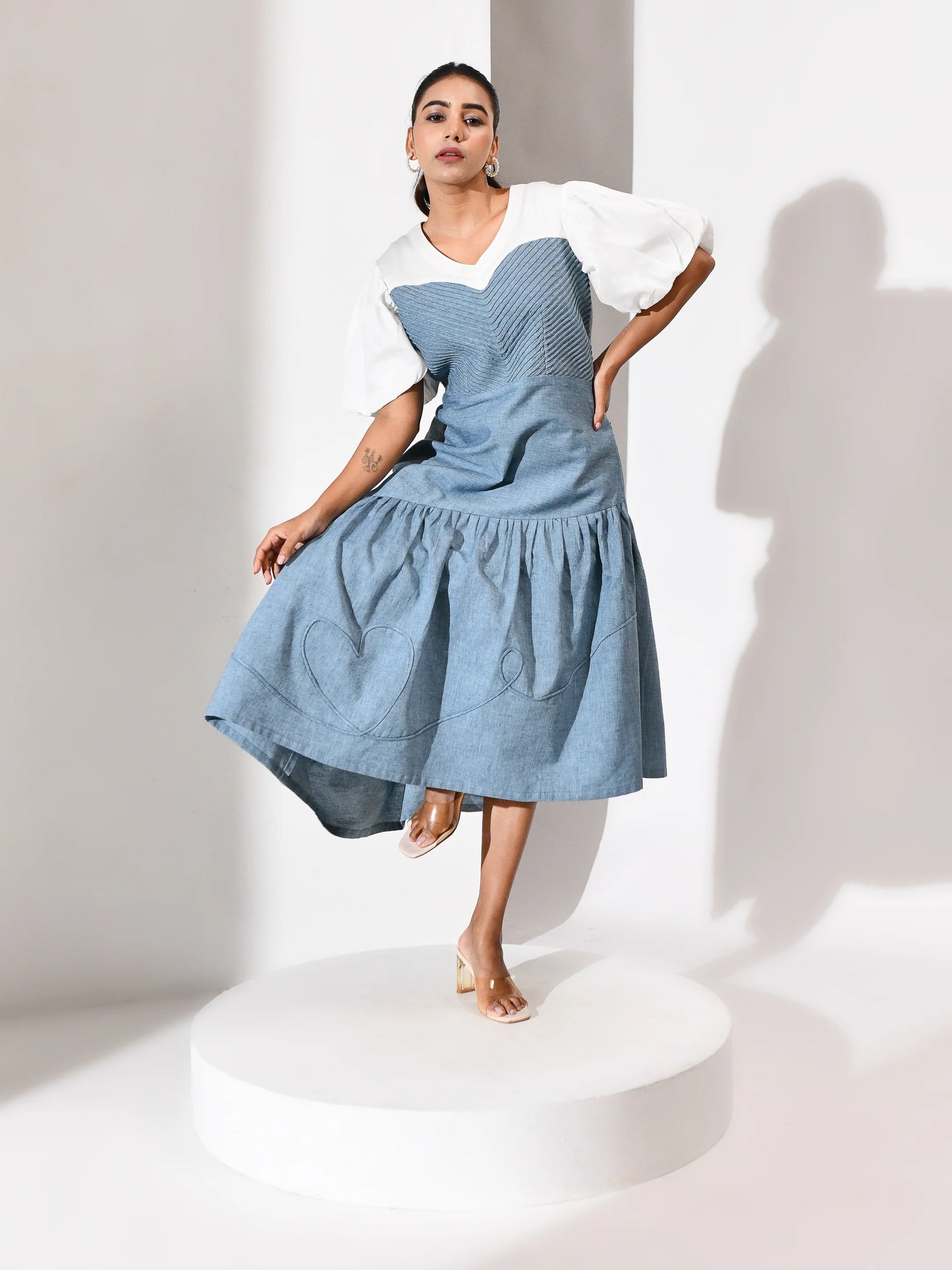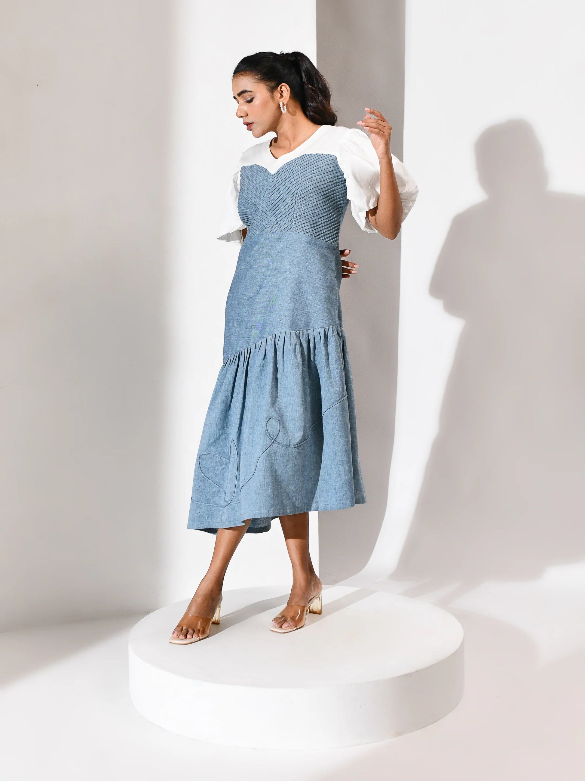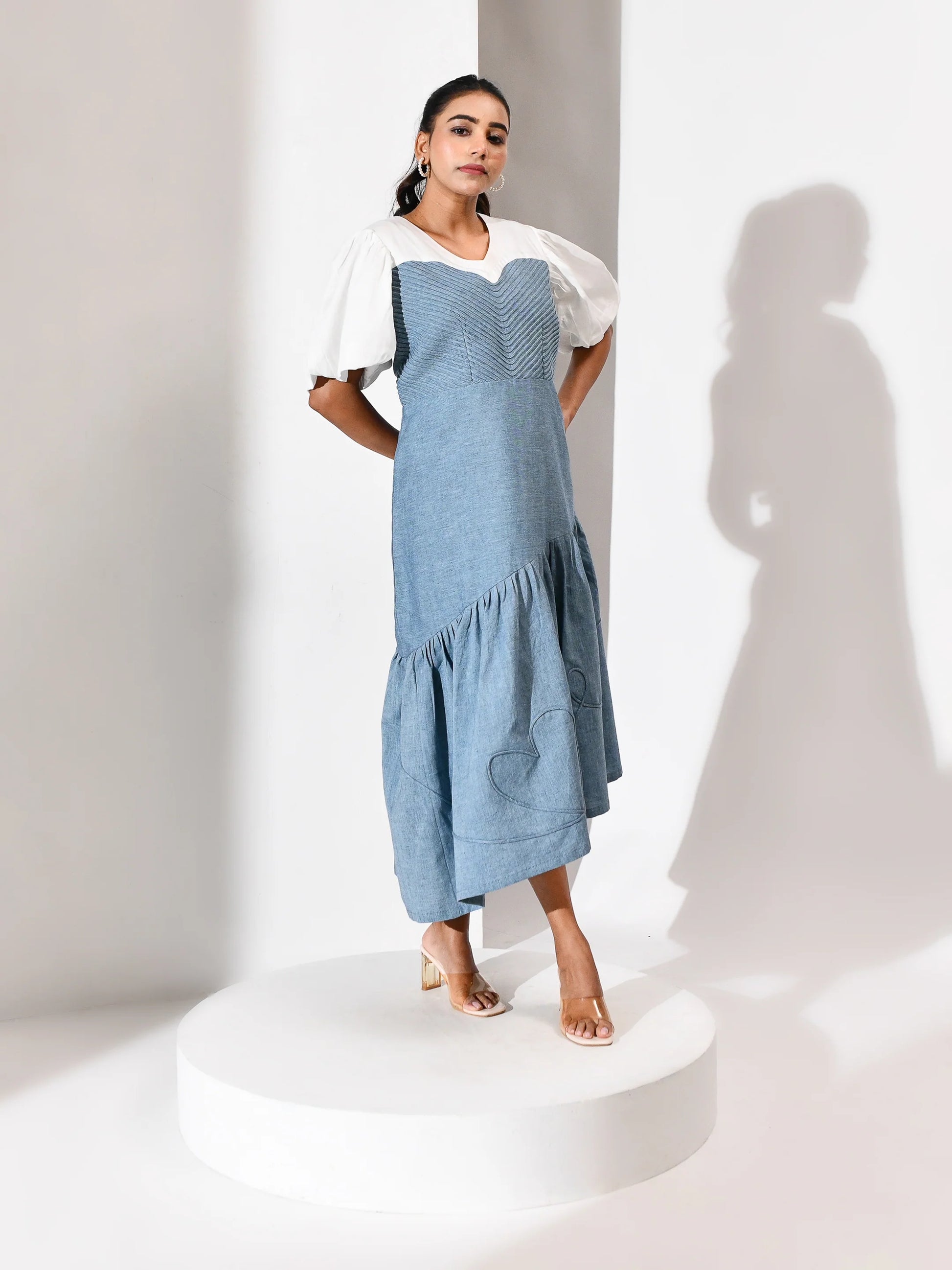 A study in contrast and quiet power. This dress pairs the depth of denim with the purity of white, creating a silhouette that feels both grounded and ethereal. Intricate detailing—like whispered stitches and sculpted seams—adds texture without excess, inviting the eye to linger. Denivory moves between strength and softness, structure and surrender. It’s not just a garment—it’s a mood, a memory, a moment suspended in light.