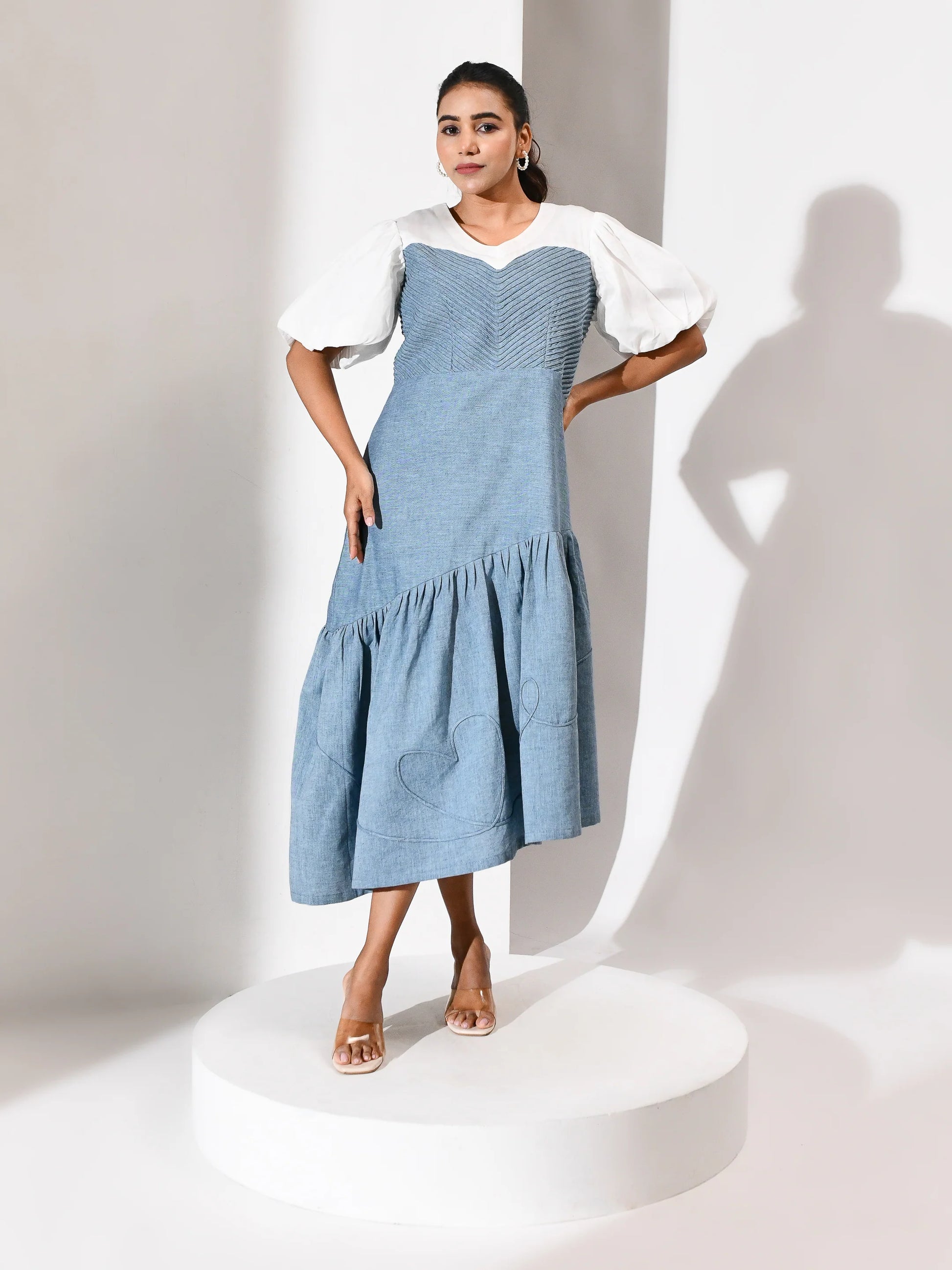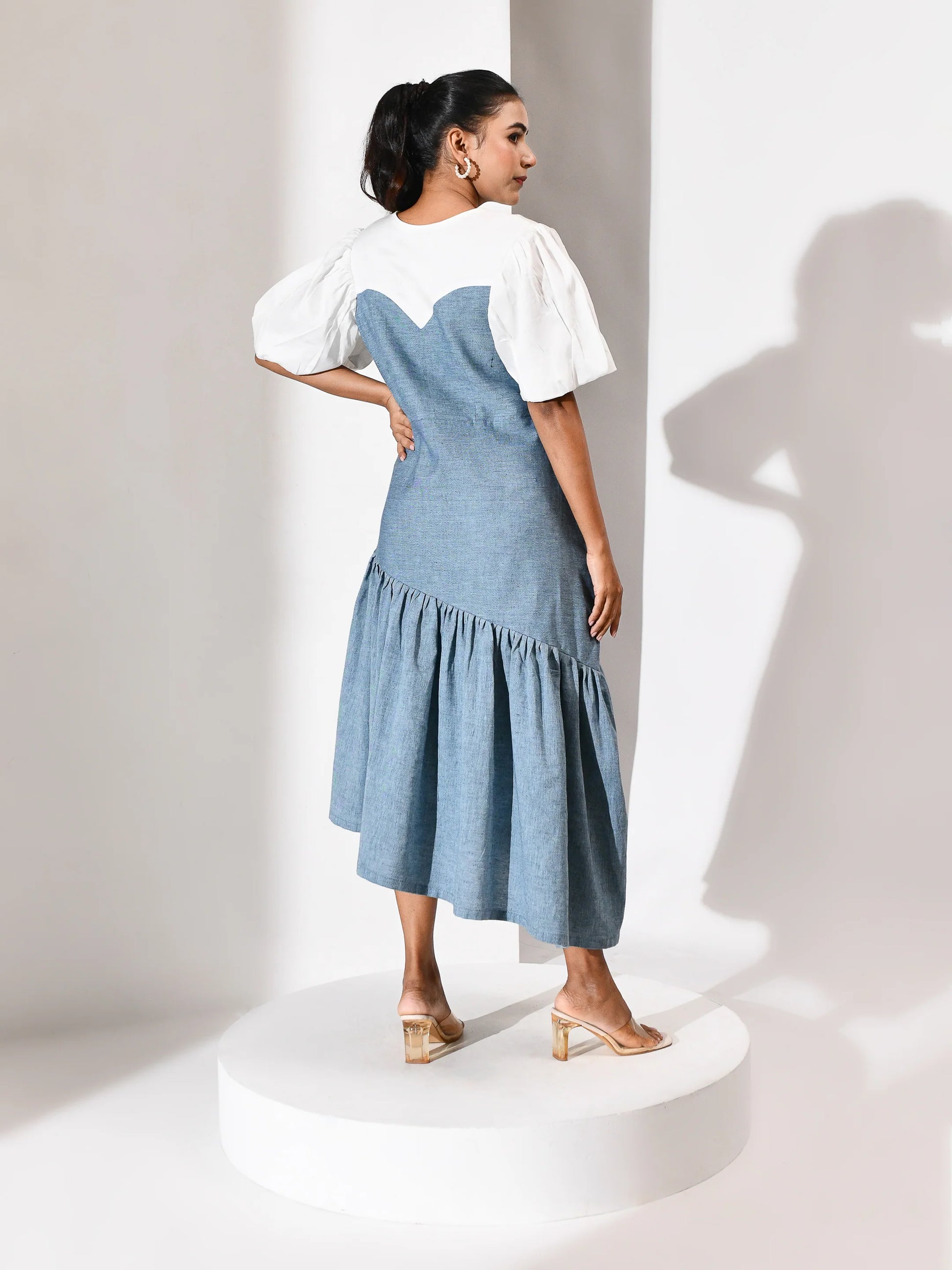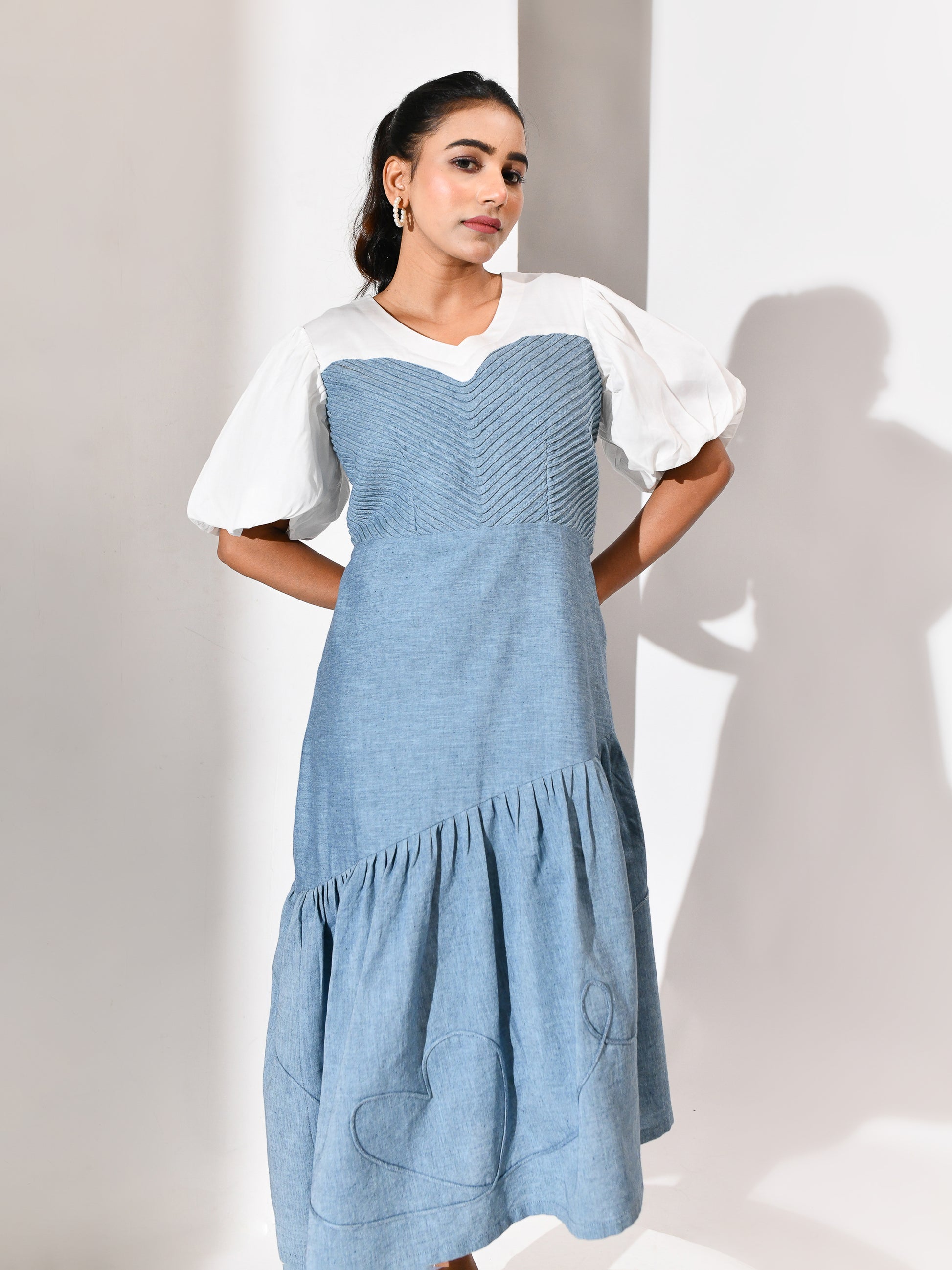 A study in contrast and quiet power. This dress pairs the depth of denim with the purity of white, creating a silhouette that feels both grounded and ethereal. Intricate detailing—like whispered stitches and sculpted seams—adds texture without excess, inviting the eye to linger. Denivory moves between strength and softness, structure and surrender. It’s not just a garment—it’s a mood, a memory, a moment suspended in light.
