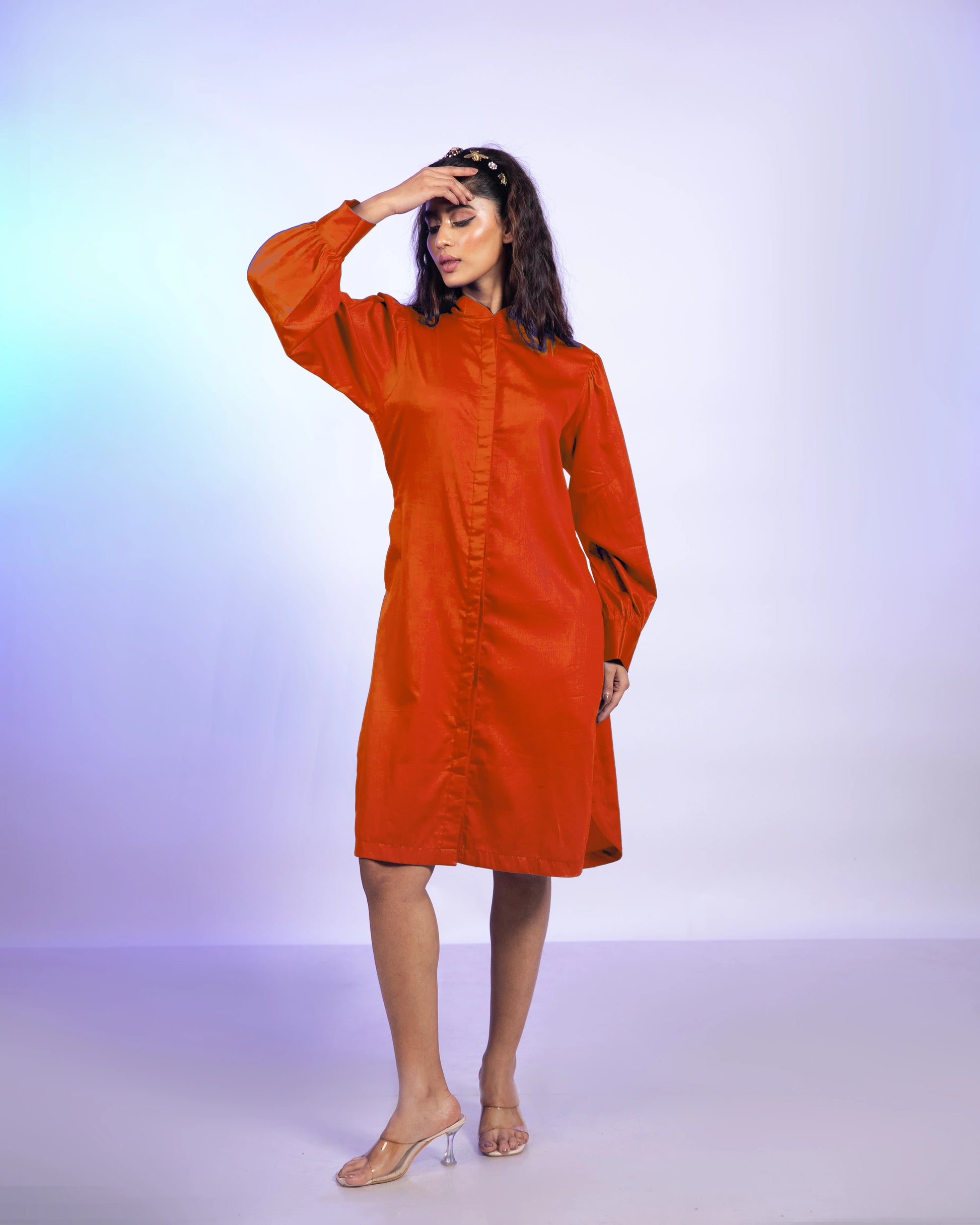 Bring uniqueness and ease to your everyday style with our dark orange cotton shirt dress, designed in a relaxed fit for ultimate comfort. Crafted from soft, breathable cotton, this full-sleeve dress pairs laid-back charm with rich, earthy tones. Whether you're heading to brunch, running errands, or working from home, this versatile piece adds effortless polish to any look.