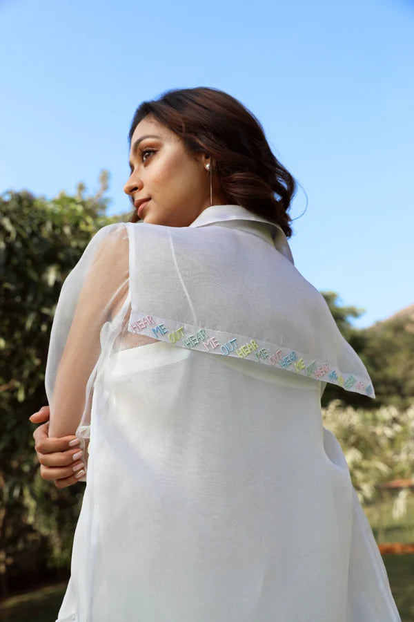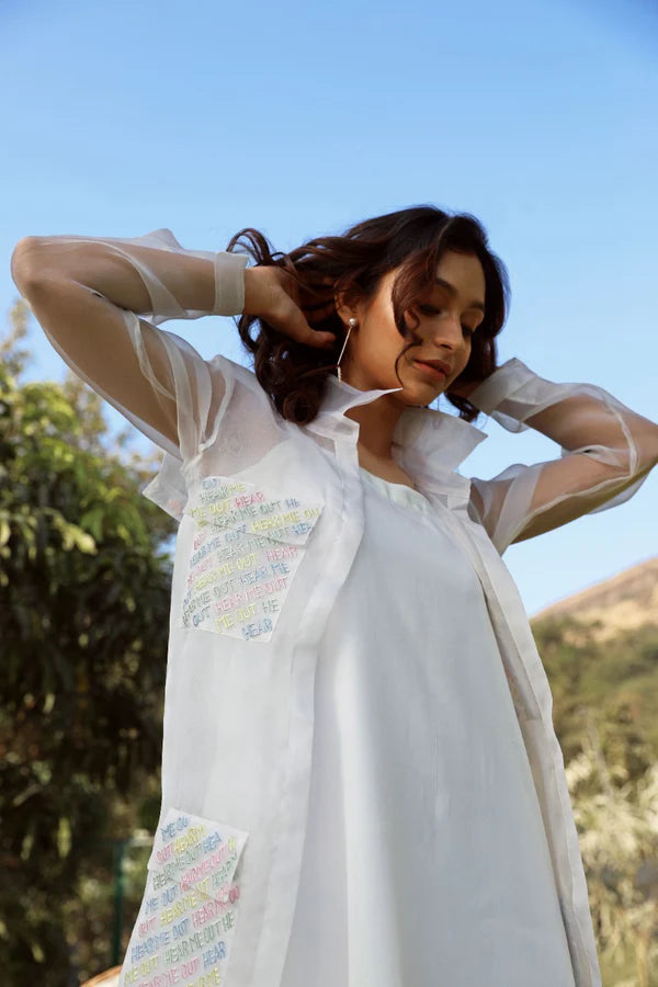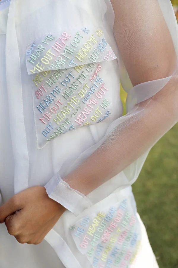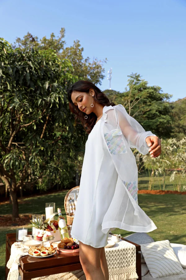Refine your summer wardrobe with this elegant organza trench coat. Detailed with pastel machine embroidery on the pockets and back flap.