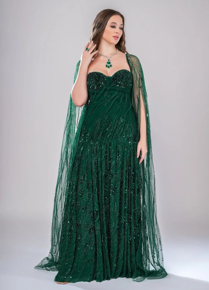 An emerald green gown featuring a sweetheart neckline and long, flowing detachable sleeves that cascade to the floor, evoking a sense of mystical elegance. The fitted bodice with intricate pleating elongates the silhouette while the emerald hue gives it an overall grace.