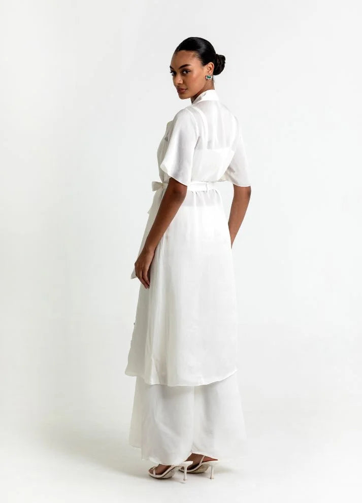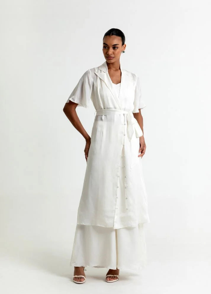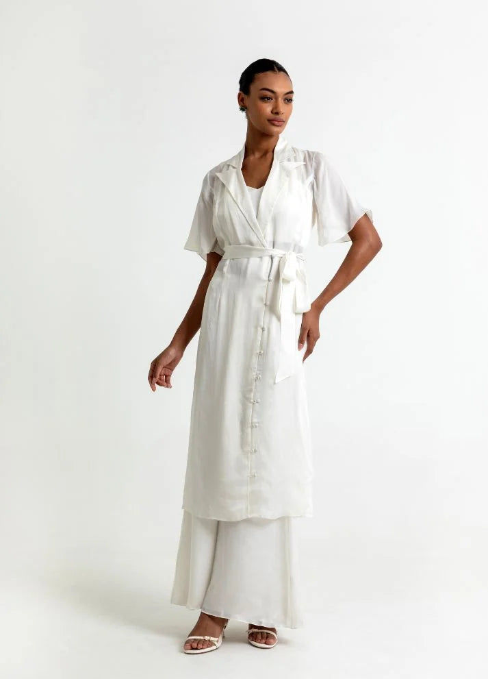 Breezy elegance at its best. The Esther set features a cropped top and flared trousers in soft organza, paired with a sheer, knee-length jacket. The jacket, detailed with fabric-covered buttons,a belt, adds an ethereal layer—ideal for day events, resort wear, or elevated casuals.