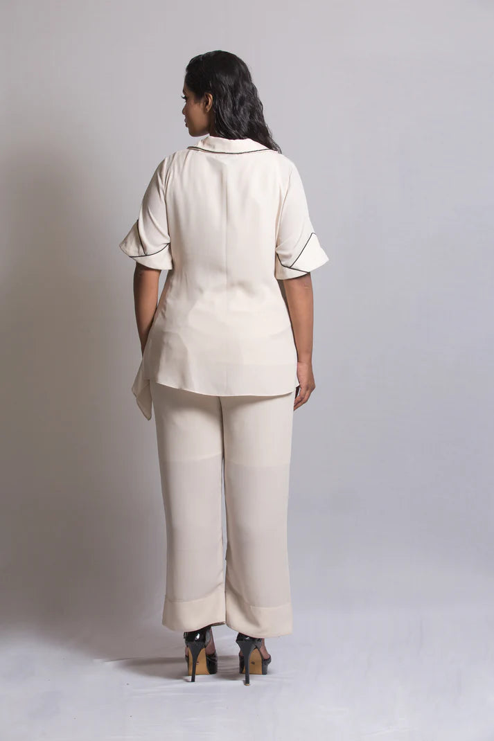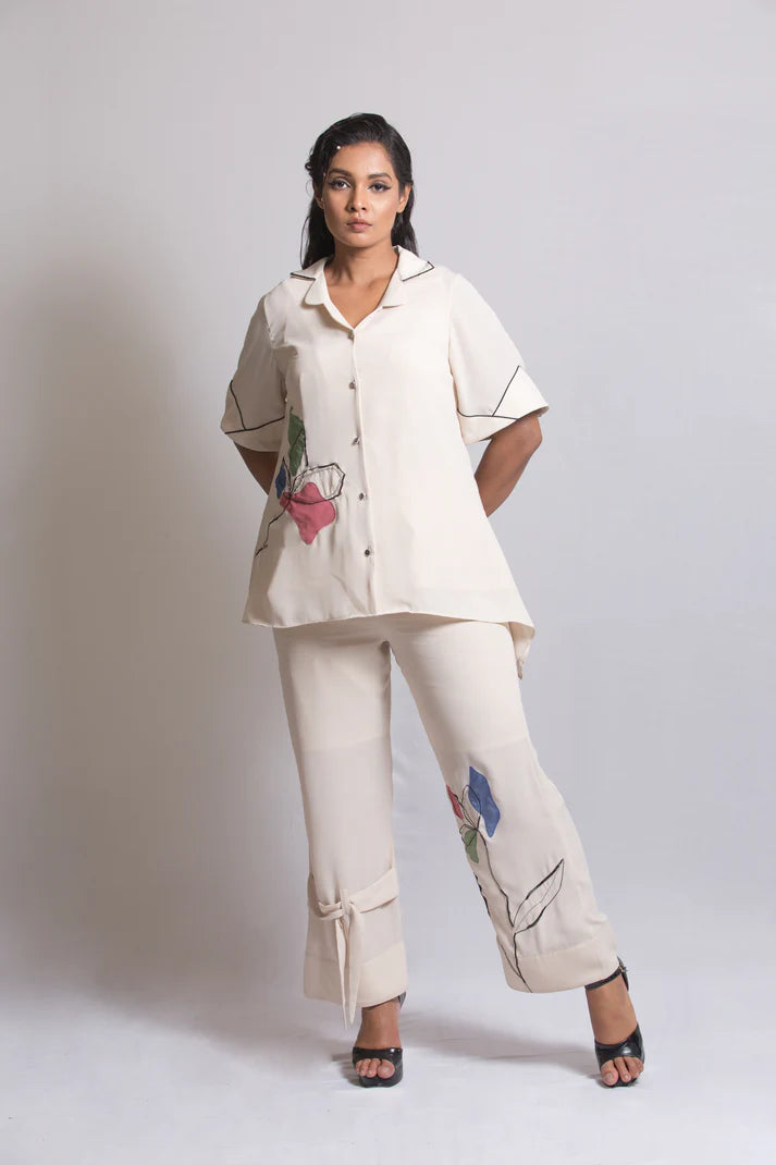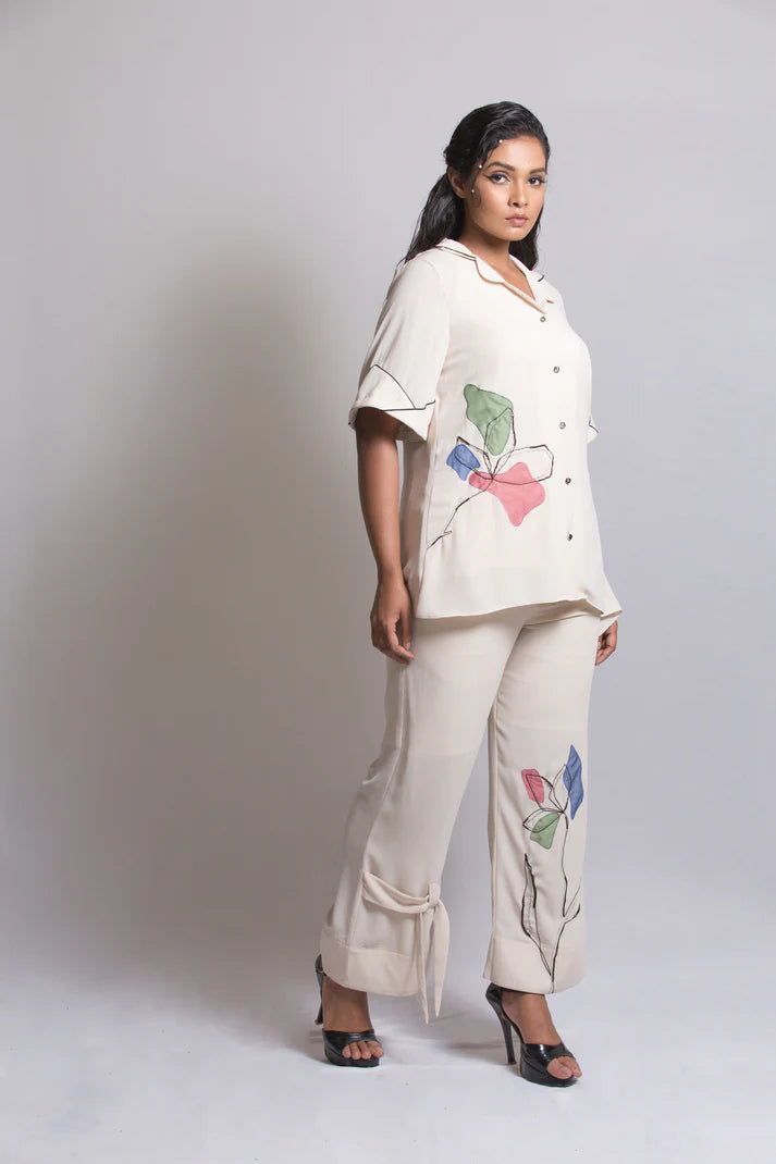 Antique white double georgette co-ord set featuring a relaxed shirt-style top with contrast piping and button-down front. Paired with straight-leg trousers detailed with tie-up hems and floral appliqué embroidery, this chic set is perfect for stylish lounge wear and easy day-to-evening dressing.