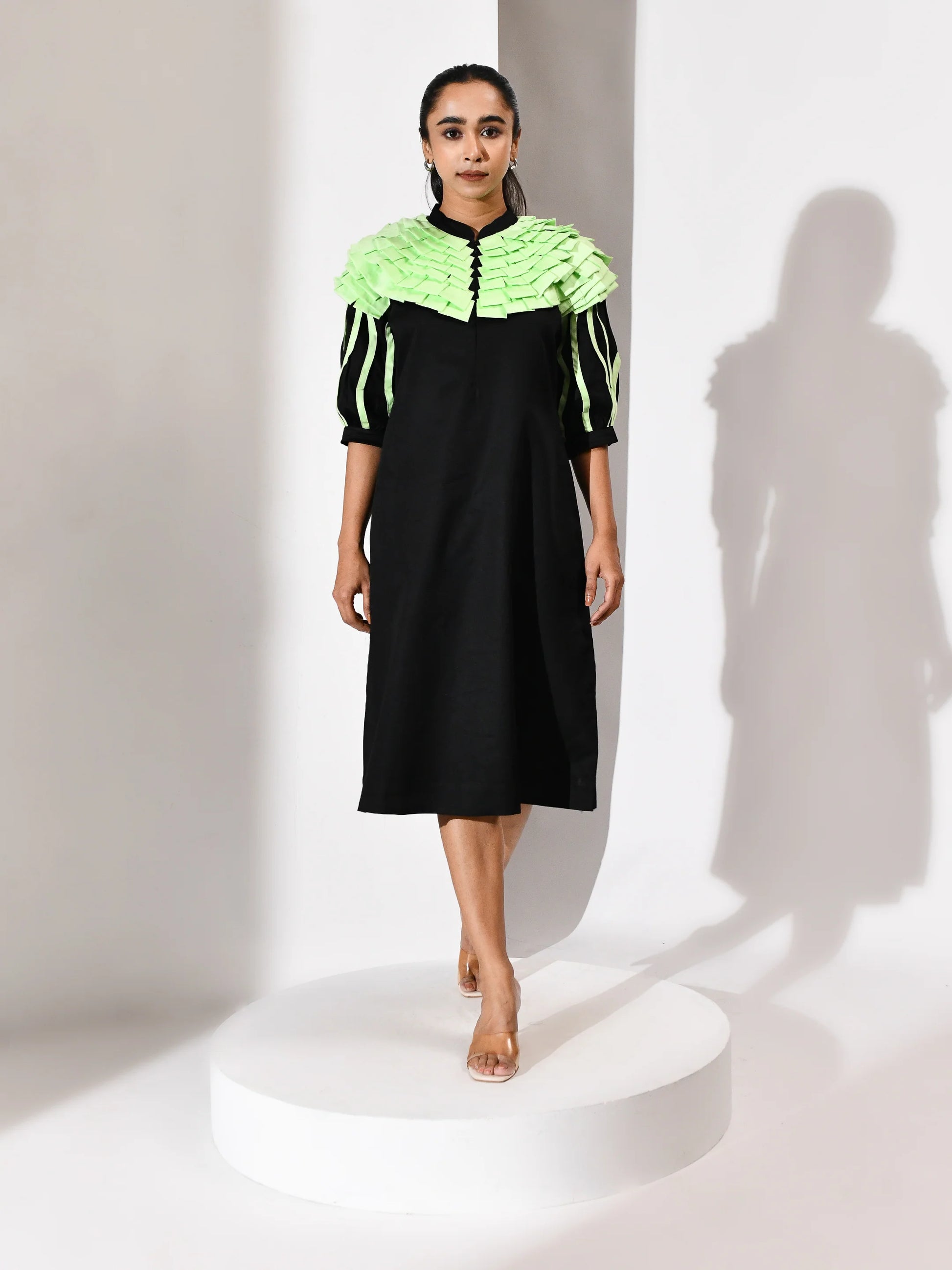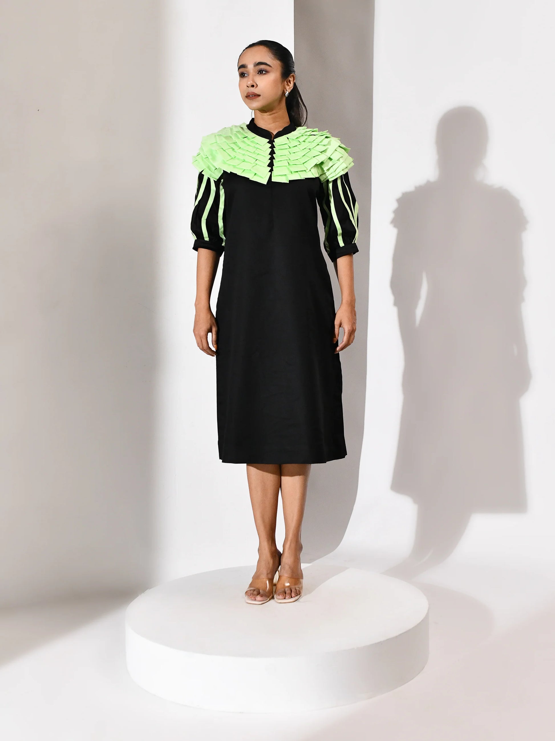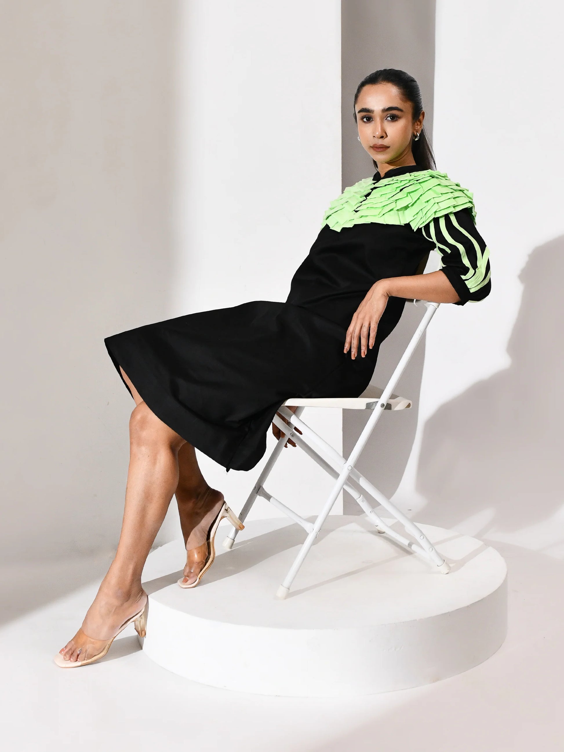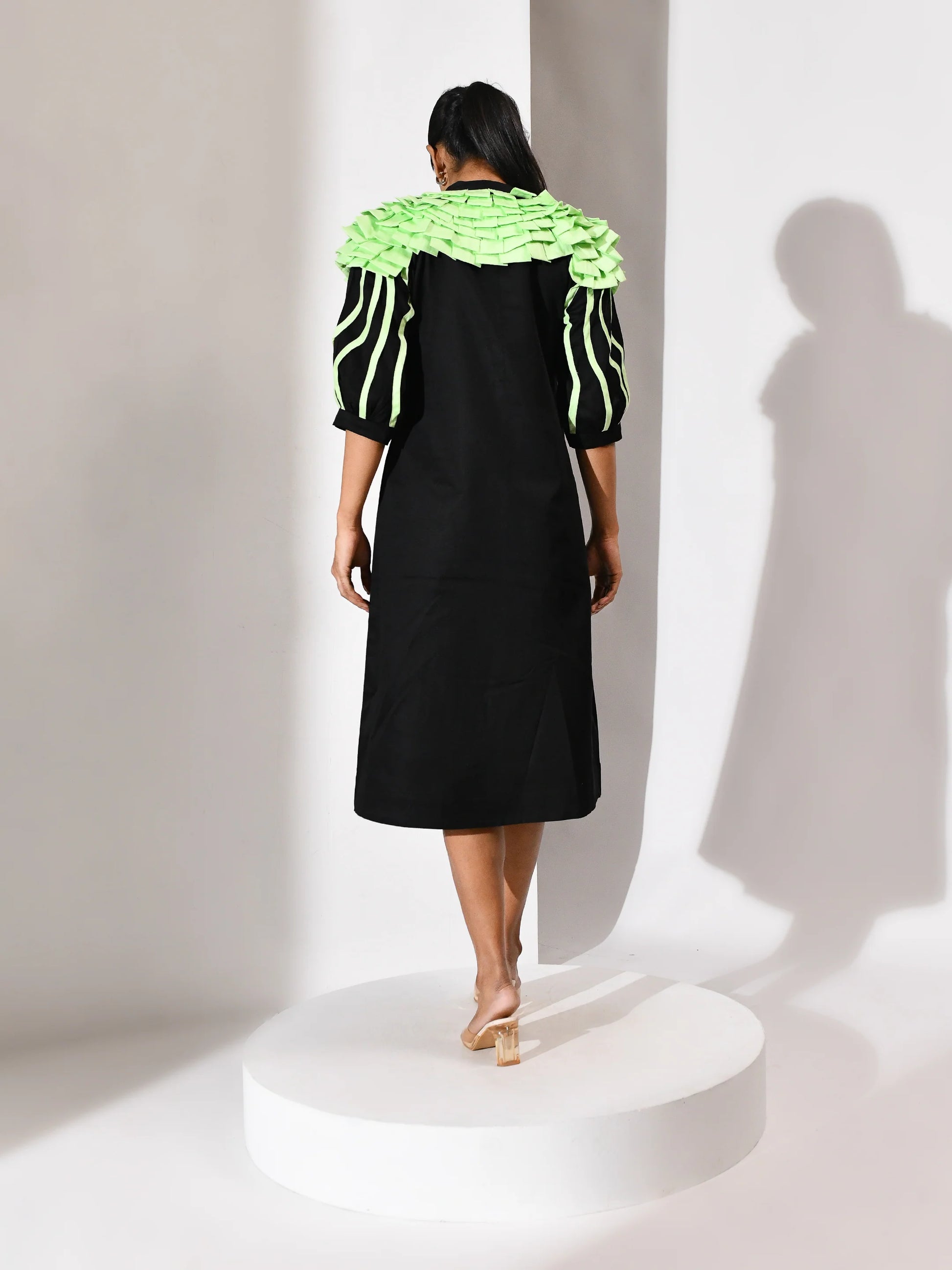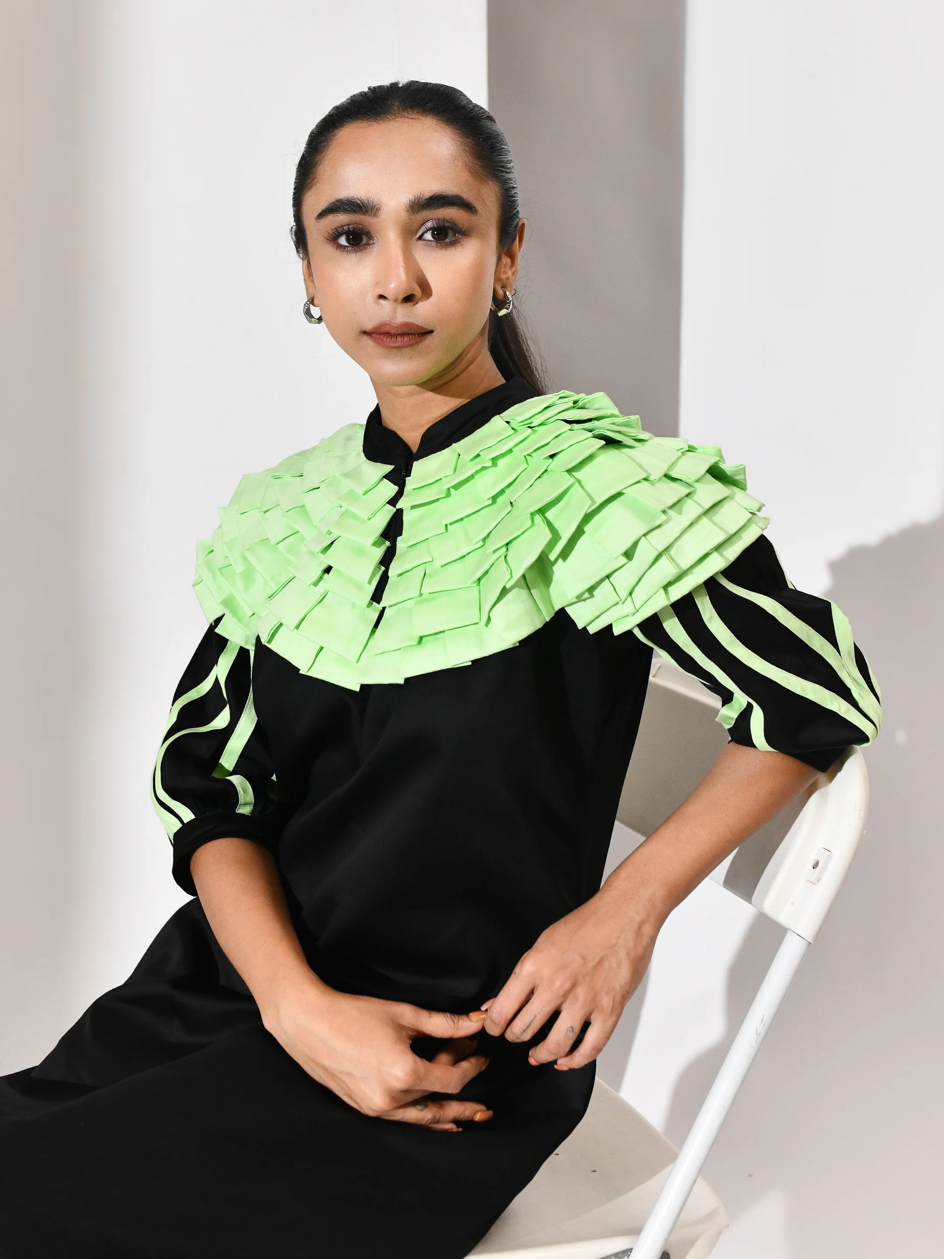 A gesture of quiet movement. This black dress is punctuated with mint green folded tassels—each one a soft ripple, a suspended breath. The contrast is deliberate yet delicate, where darkness holds light and texture becomes voice. Folded Whisper is a study in restraint and rhythm, crafted to echo emotion in motion.