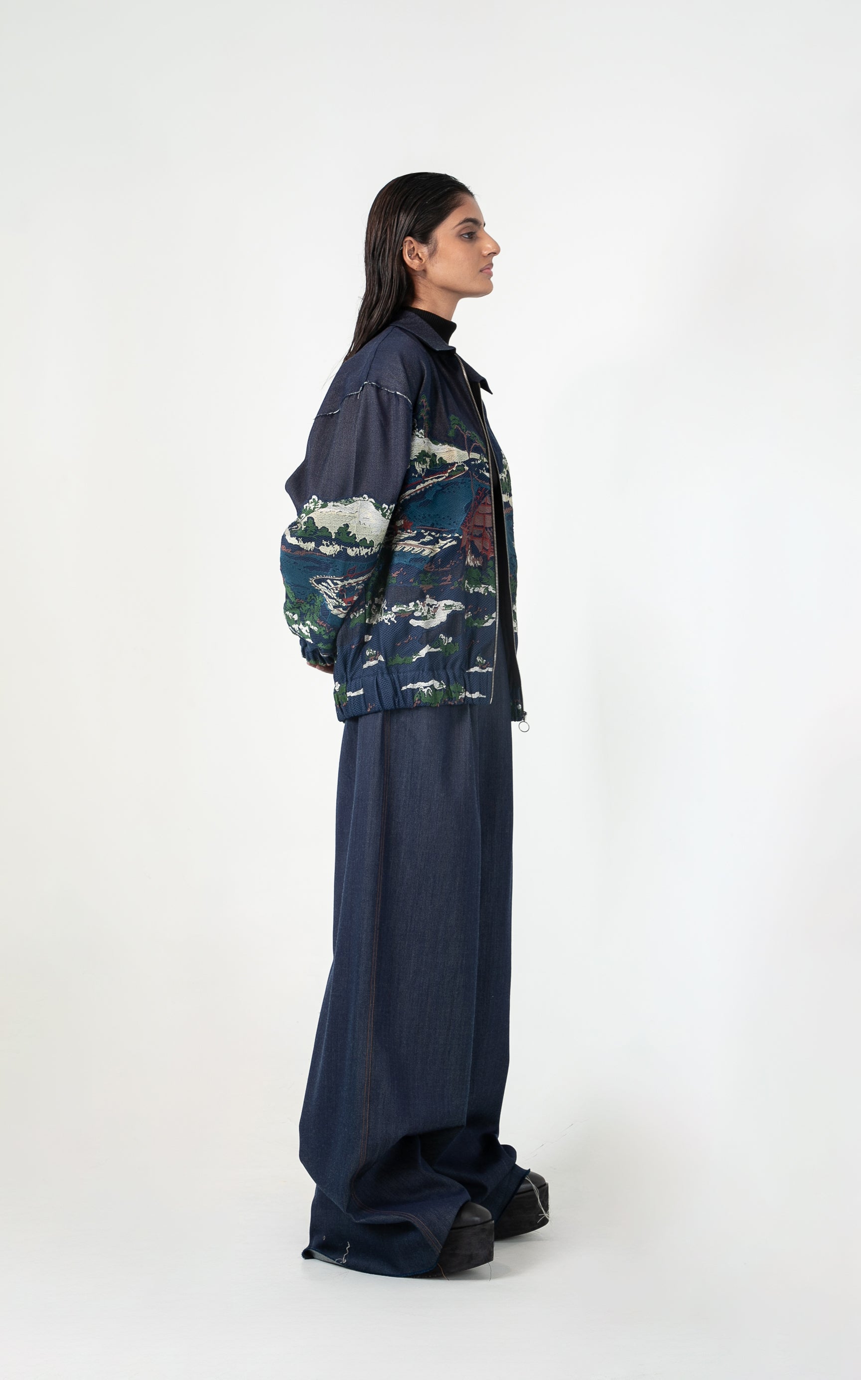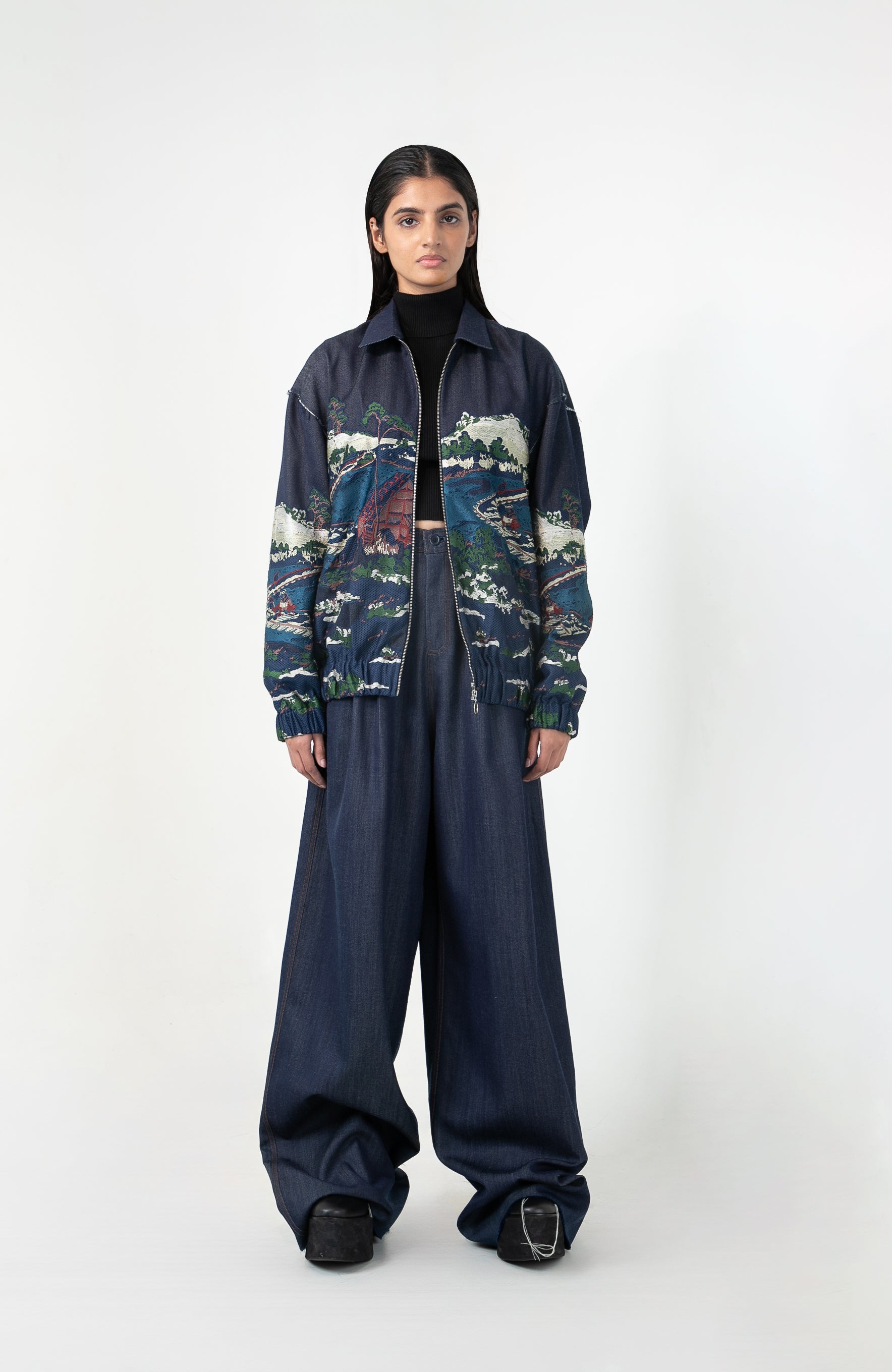 IIT Delhi's patented Cotton woolen denim Bomber. Inspired by Hokusai art with applique work, with zipper opening and stretchable hem and sleeve for effortless comfort and style. Suitable to wear for temperatures ranging between -30°C to 25°C.