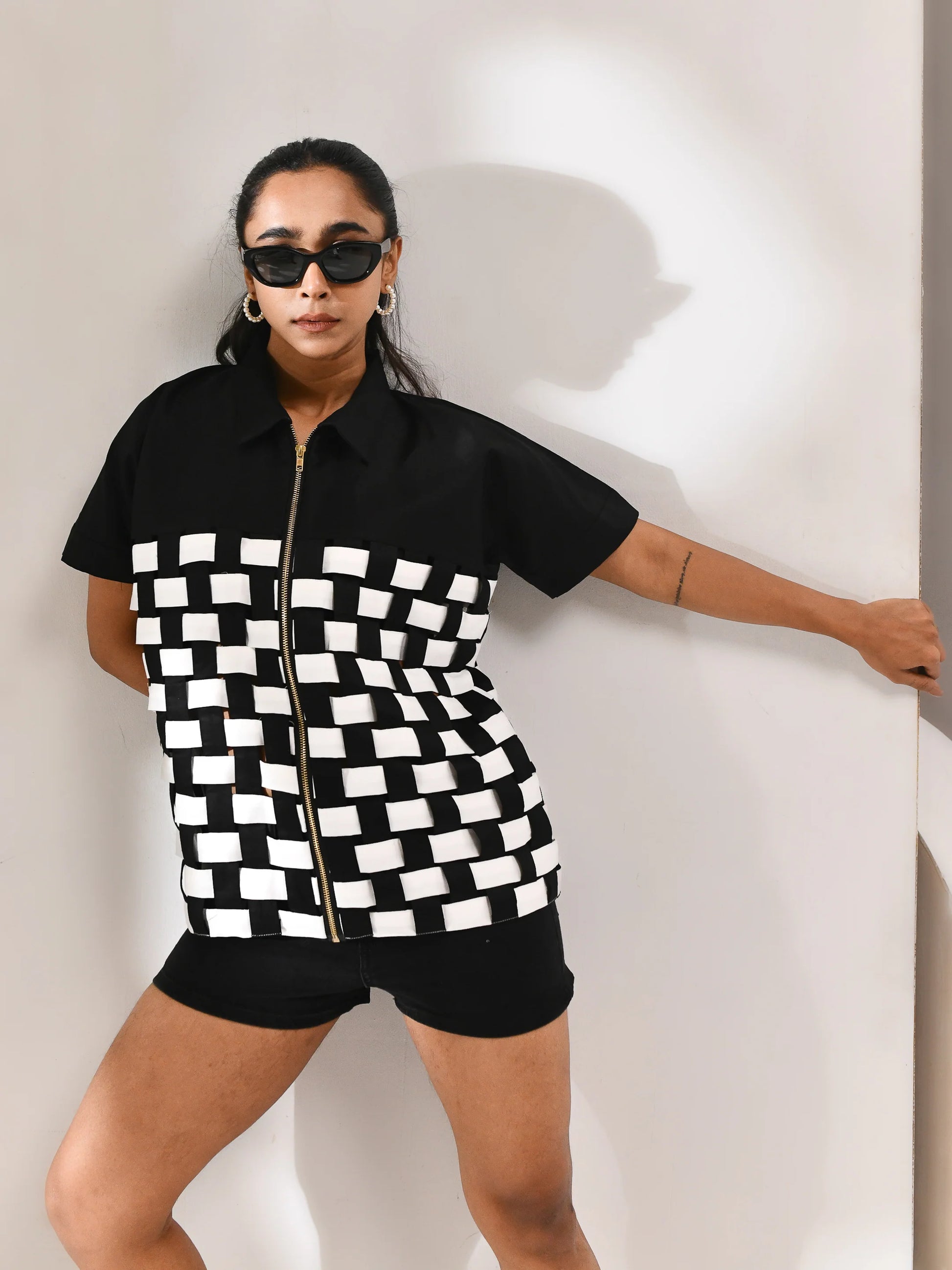 A rhythm in monochrome. This black-and-white striped jacket with inner is a study in precision—where every line is a statement, and every contrast is intentional. The stripes move like code across the body, structured yet fluid, bold yet restrained. Linecode is modern architecture in motion, designed for the woman who speaks in silhouettes and commands in quiet geometry.