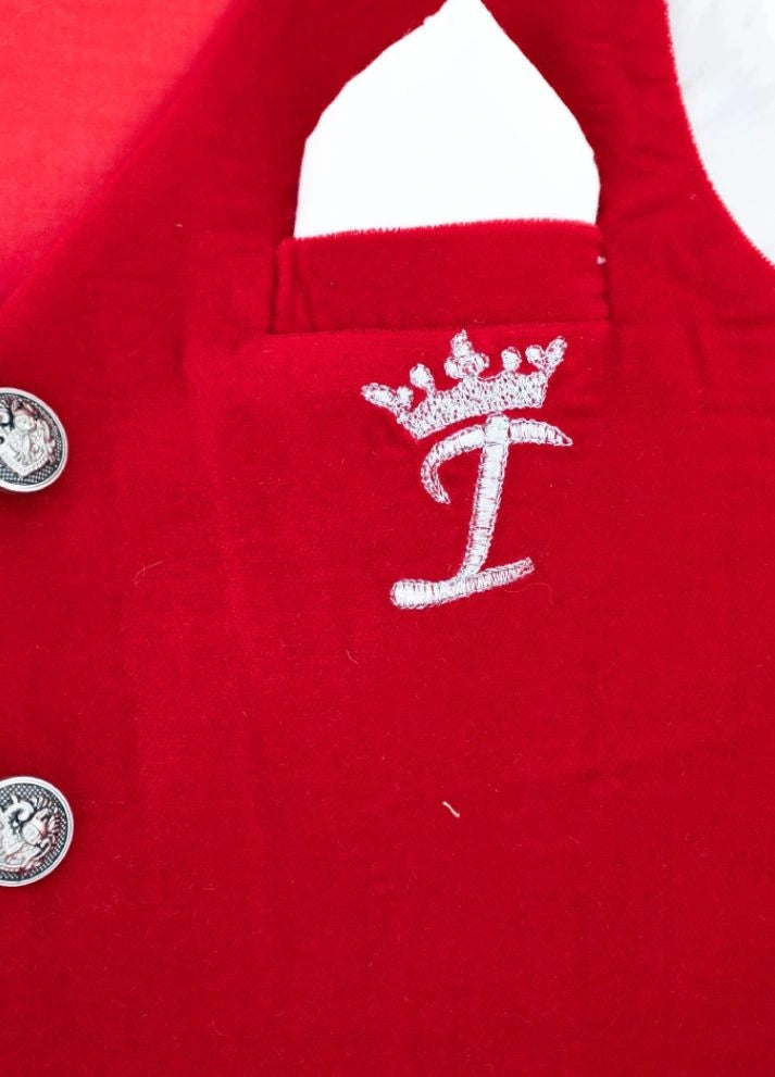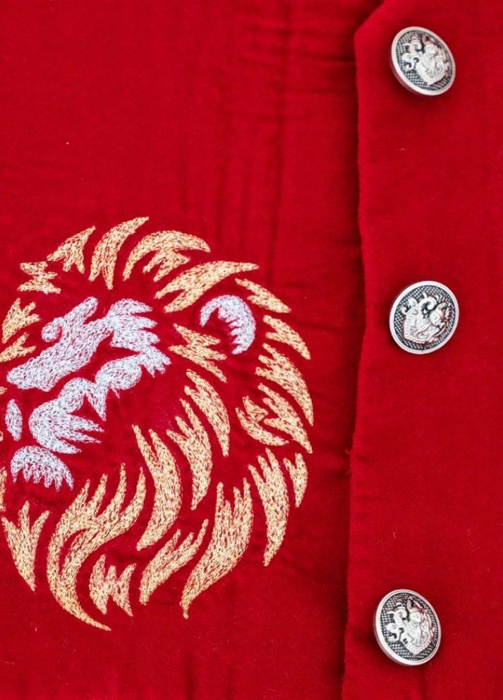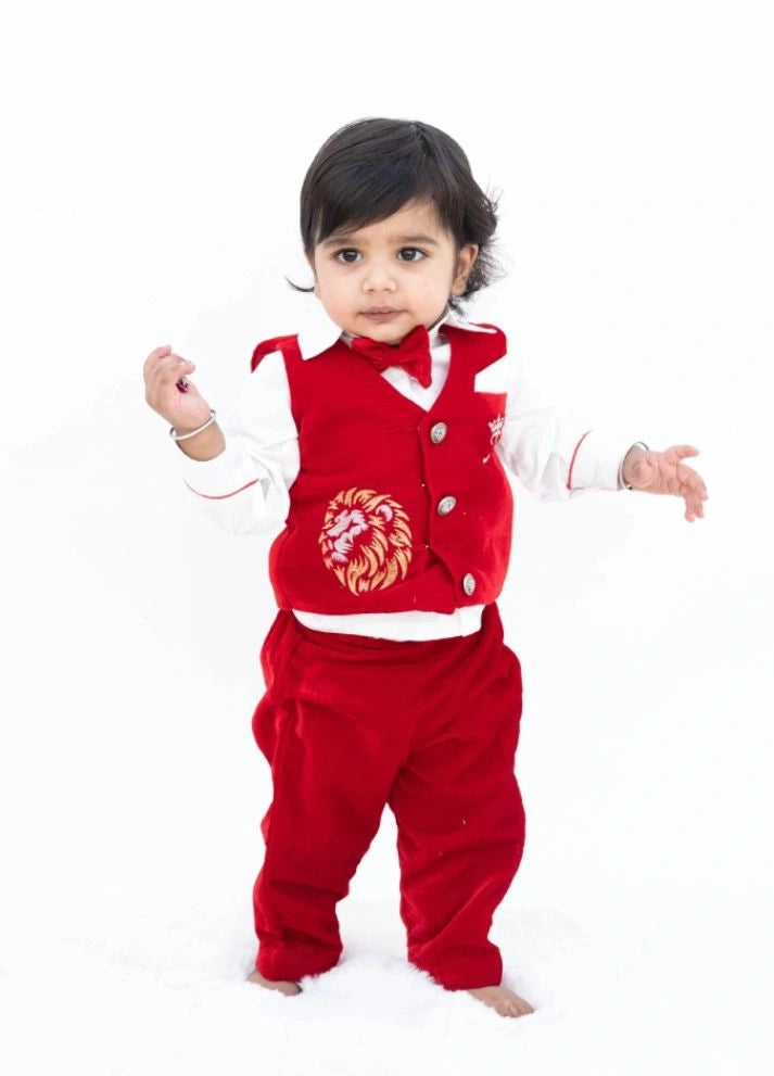 Dressed to impress, this Maroon Velvet Waistcoat Set brings together elegance and sophistication for festive occasions and celebrations. The crisp white shirt is paired with a matching bow tie, adding a classic touch to the look. The rich maroon velvet waistcoat, featuring a soft lining and an intricately embroidered lion and crown motif, exudes royalty and charm. Completing the set, the maroon velvet pants offer a coordinated finish, making this outfit a perfect pick for weddings, parties, and special events.