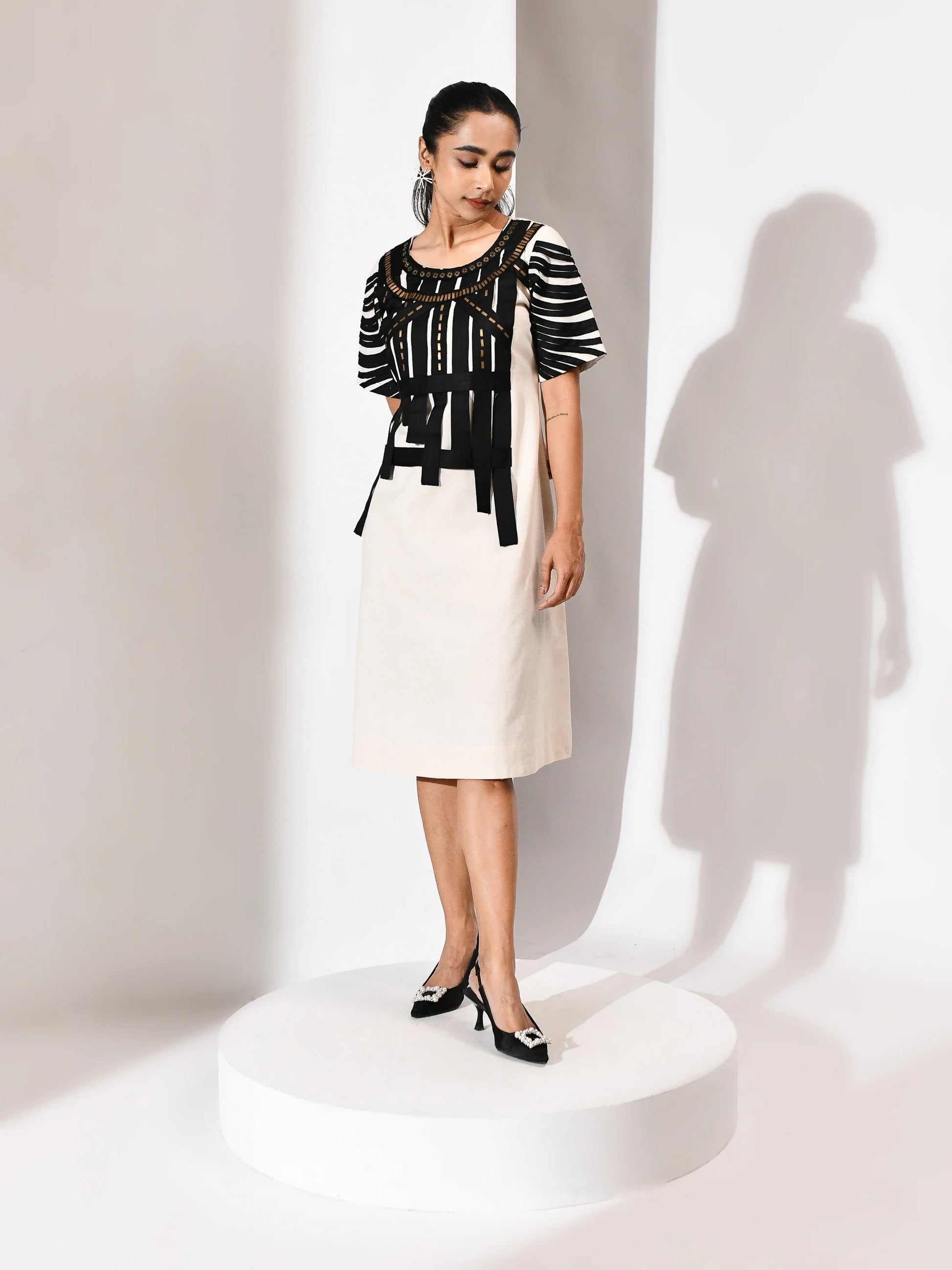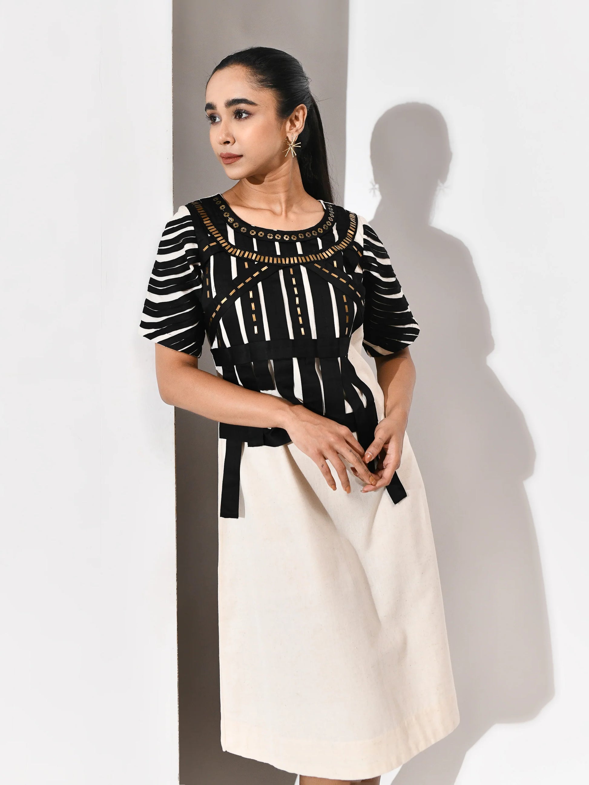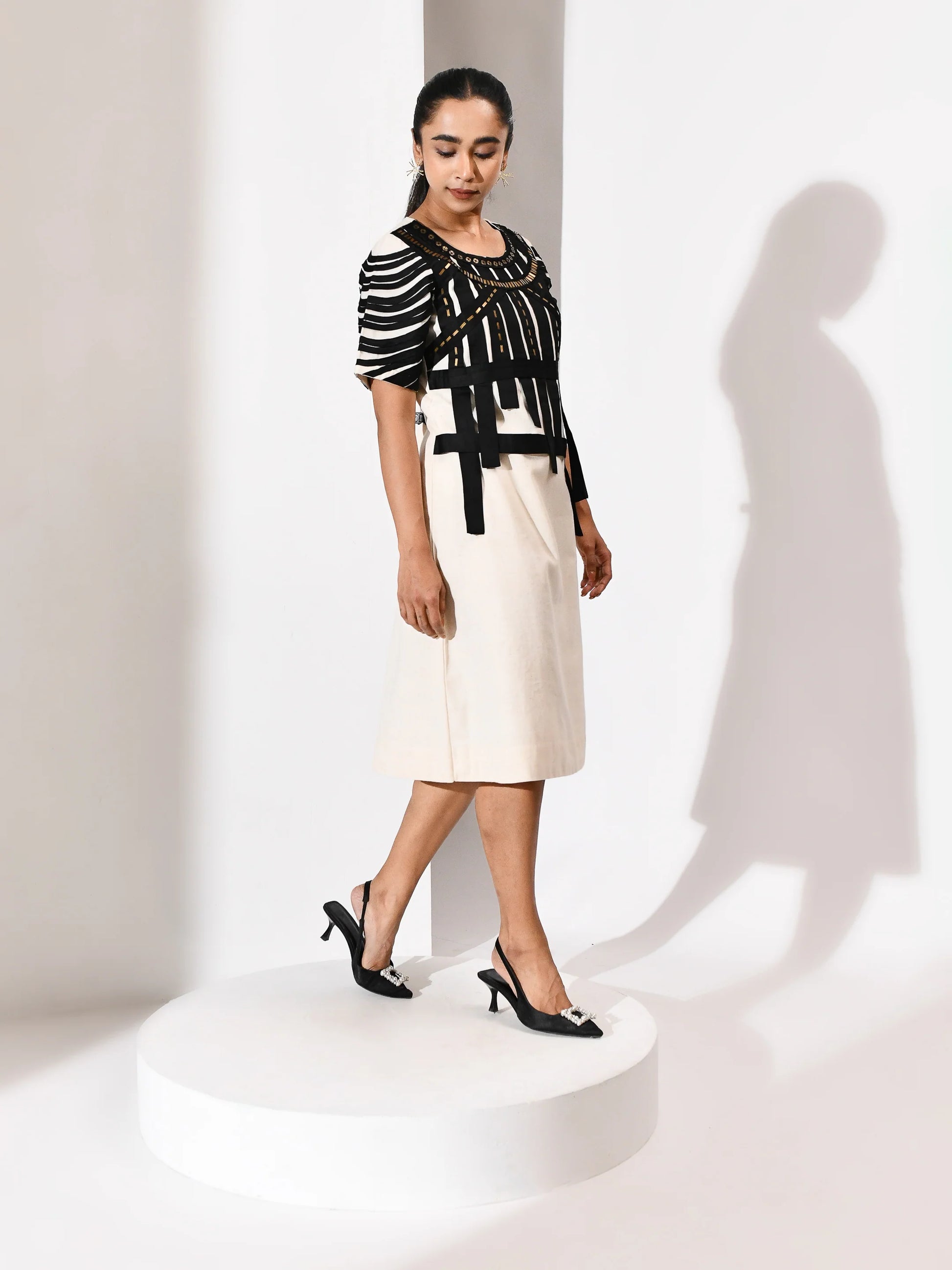 A fusion of edge and restraint. This off-white dress is defined by black patti detailing and glints of metal—each accent a deliberate interruption, each line a quiet assertion. The silhouette is minimal yet commanding, designed to hold contrast with grace. Metisse is a garment of tension and finesse, where softness is structured and strength is styled.