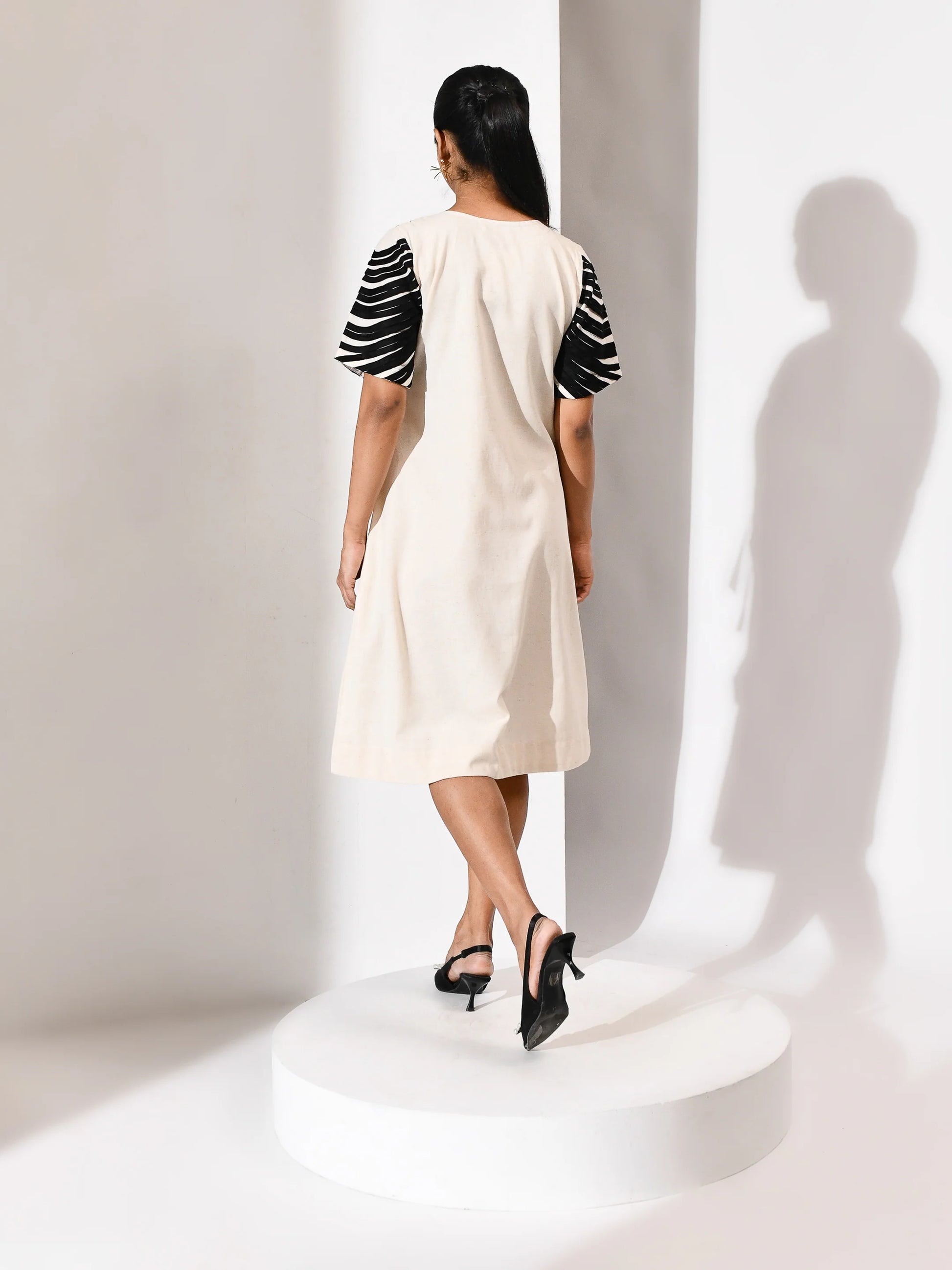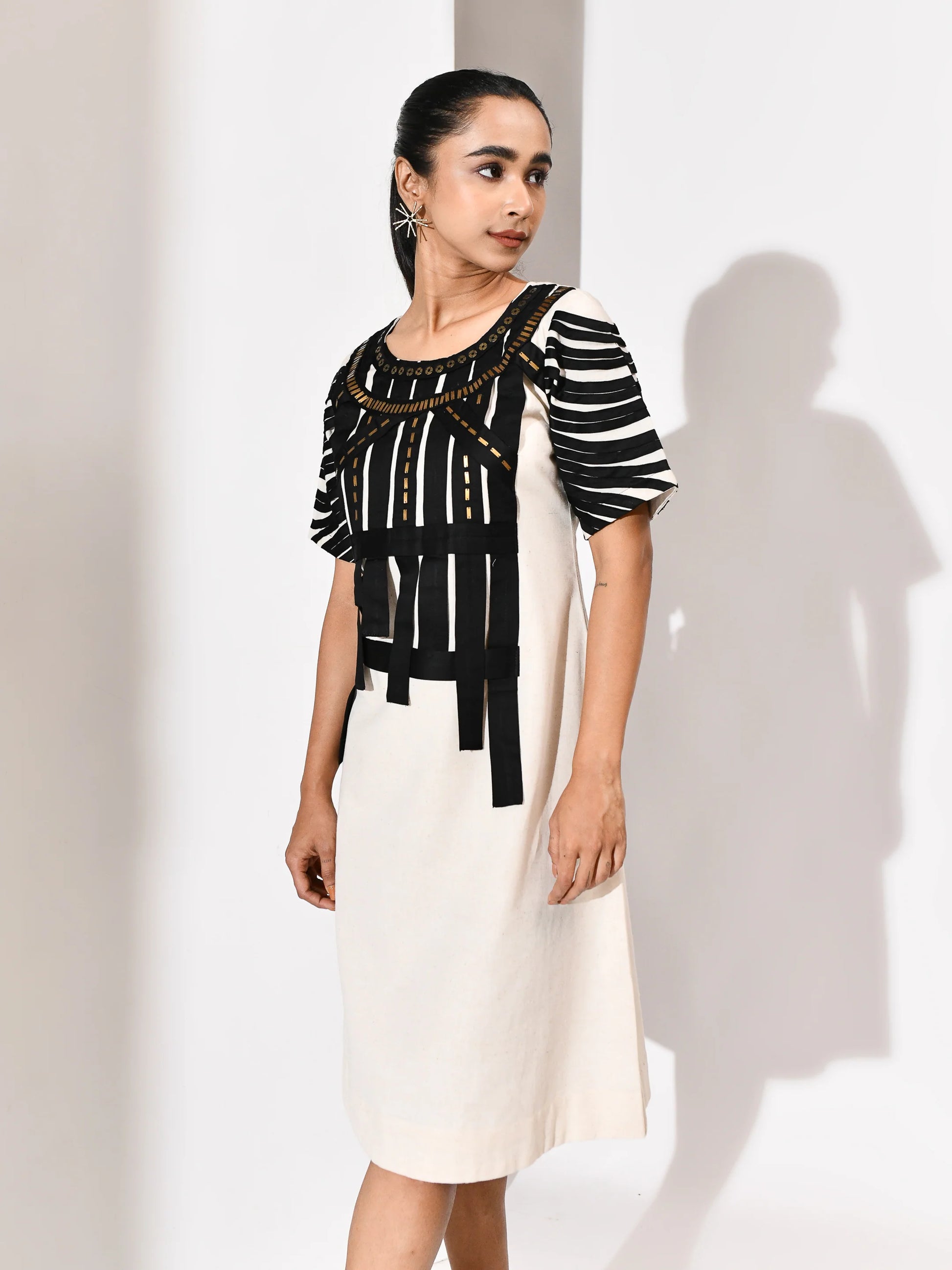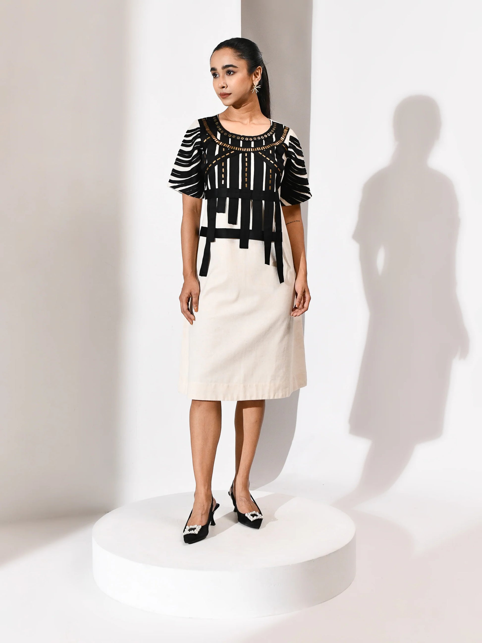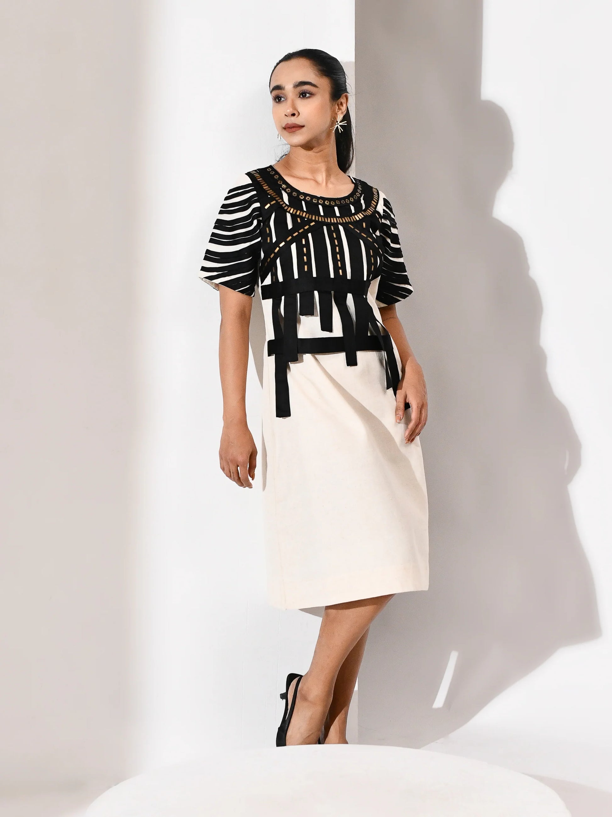 A fusion of edge and restraint. This off-white dress is defined by black patti detailing and glints of metal—each accent a deliberate interruption, each line a quiet assertion. The silhouette is minimal yet commanding, designed to hold contrast with grace. Metisse is a garment of tension and finesse, where softness is structured and strength is styled.
