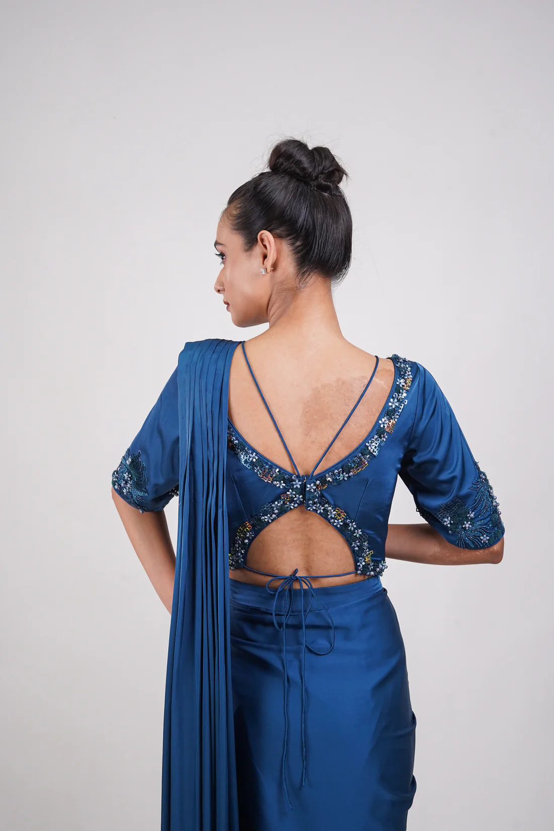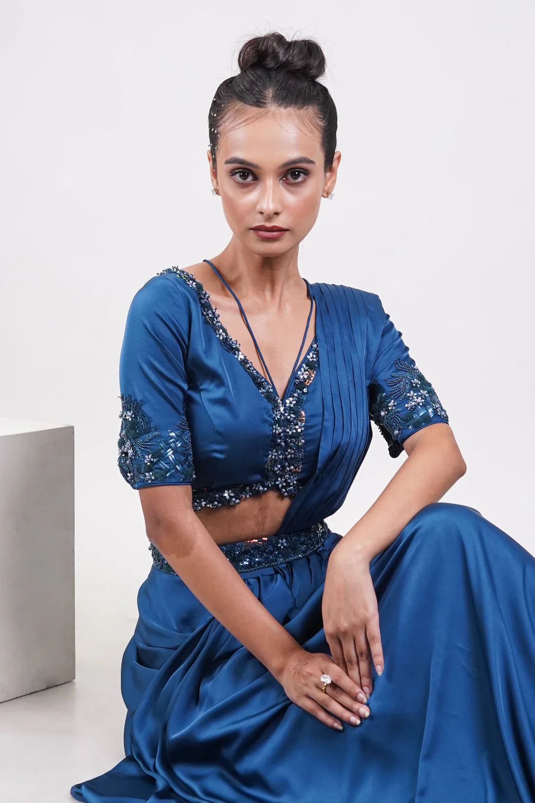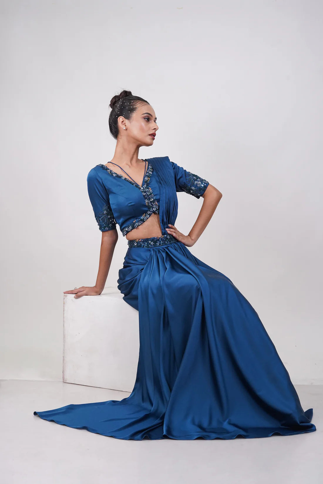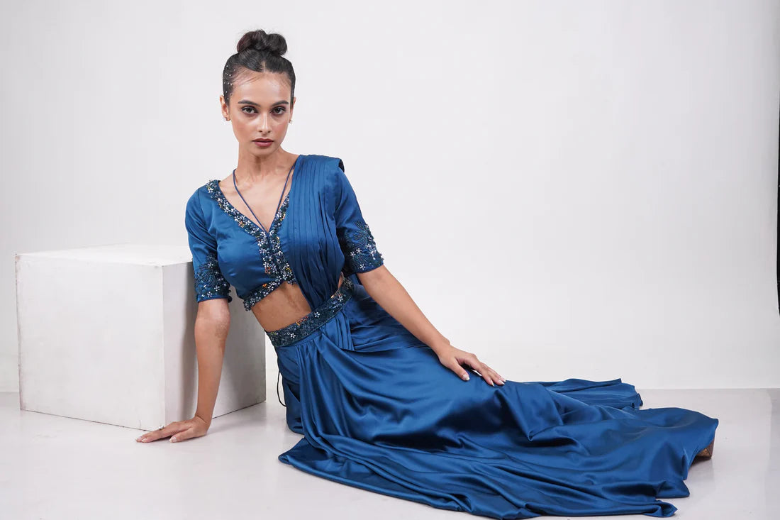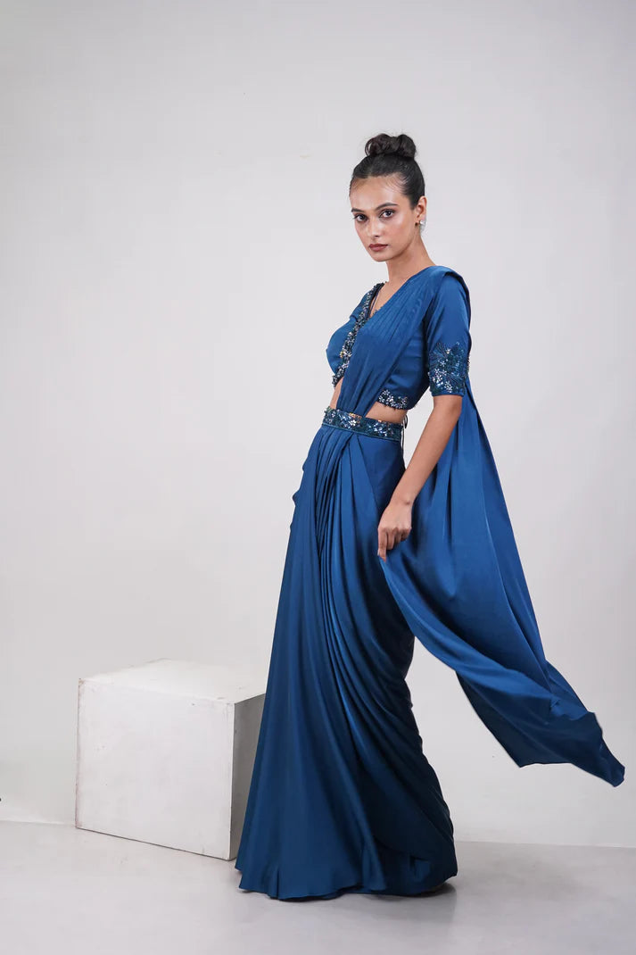 A teal blue draped fusion outfit with a sequin-embellished blouse, cinched waist, and fluid saree-inspired silhouette — blending tradition with modern elegance.