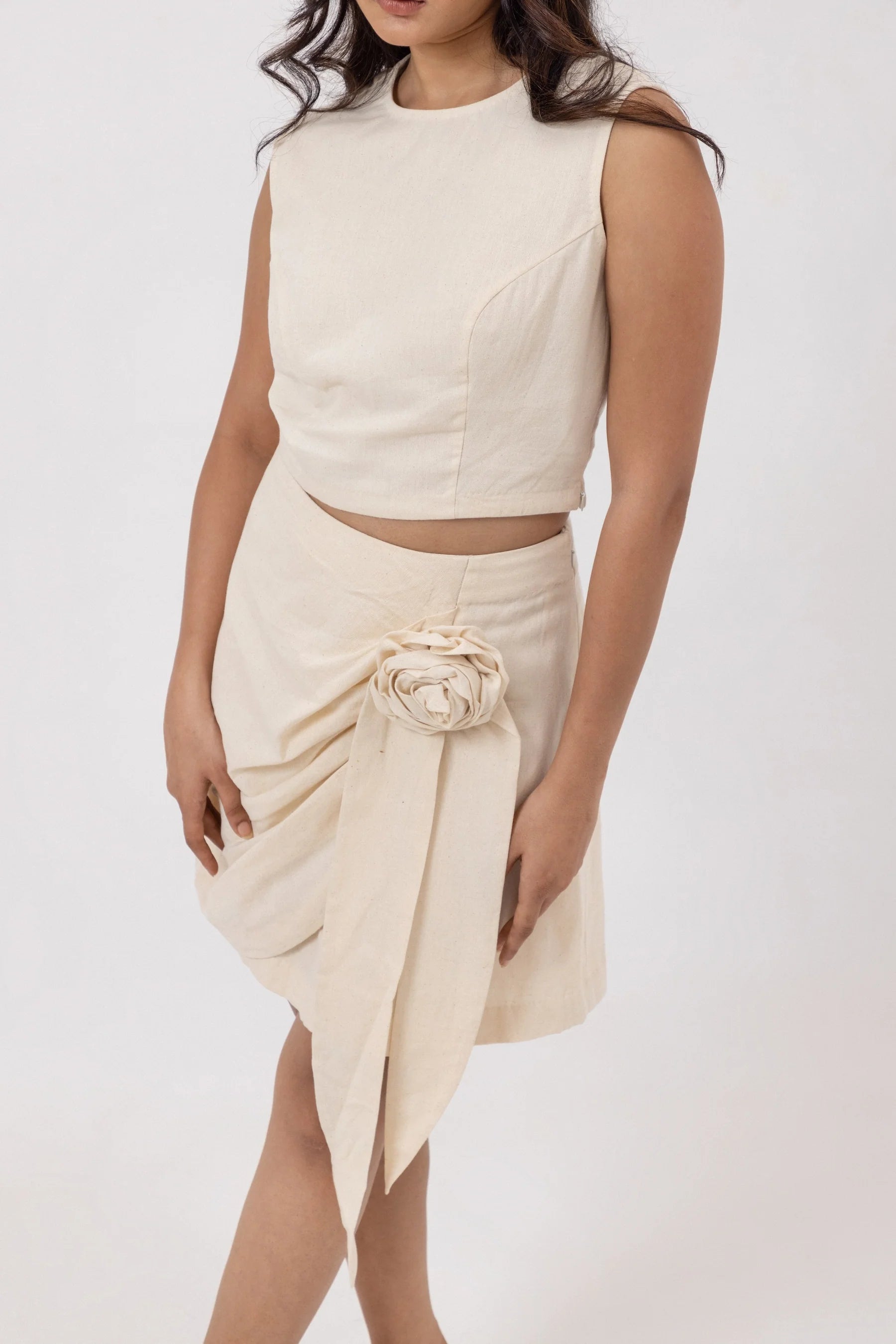 Skirt: The Mirae draped skirt, crafted from soft flax fabric, pairs perfectly with the Sera top for a complete look. Featuring unique flower drape detailing, this skirt adds a touch of elegance and is a must-have staple for your wardrobe.