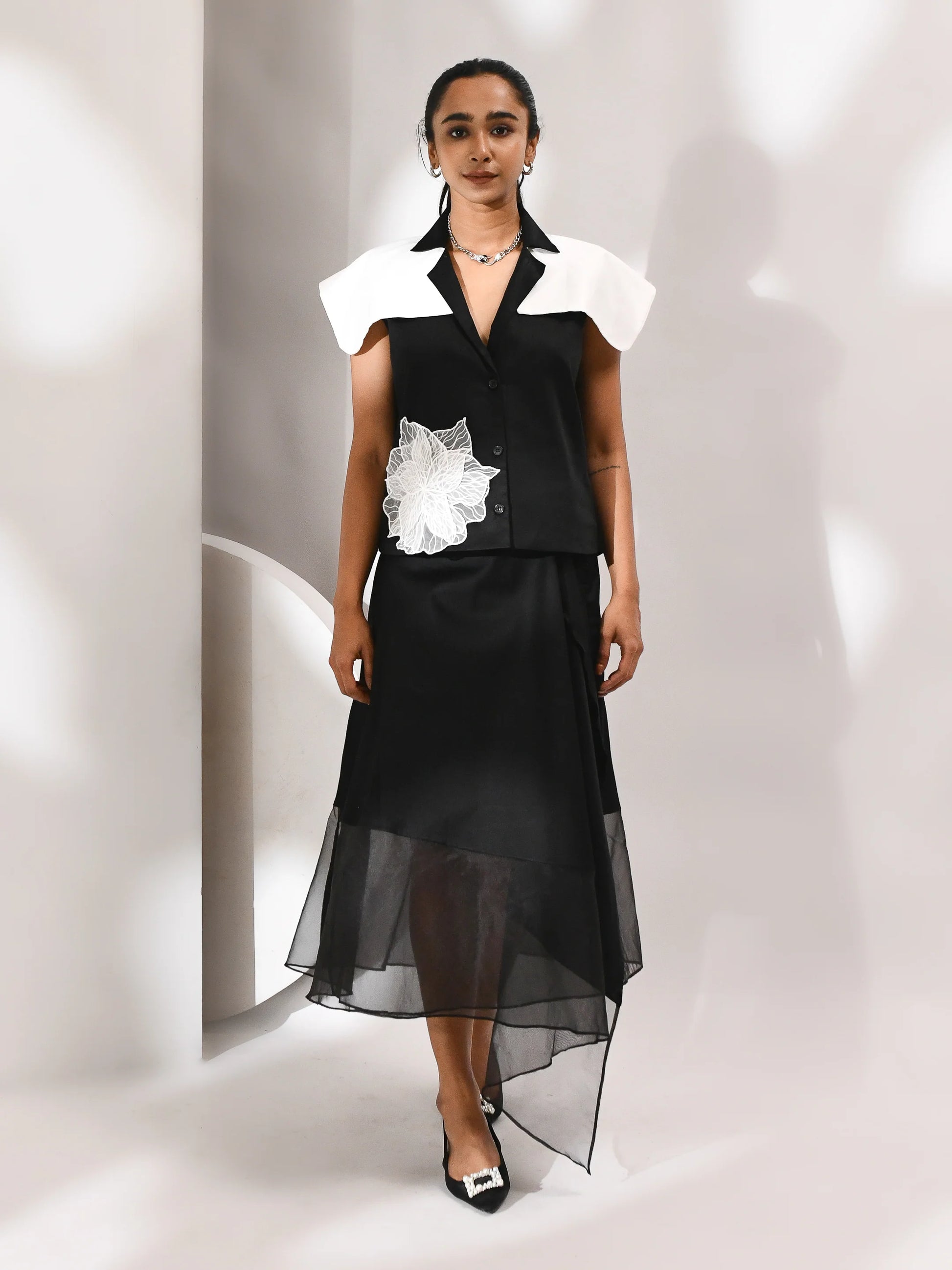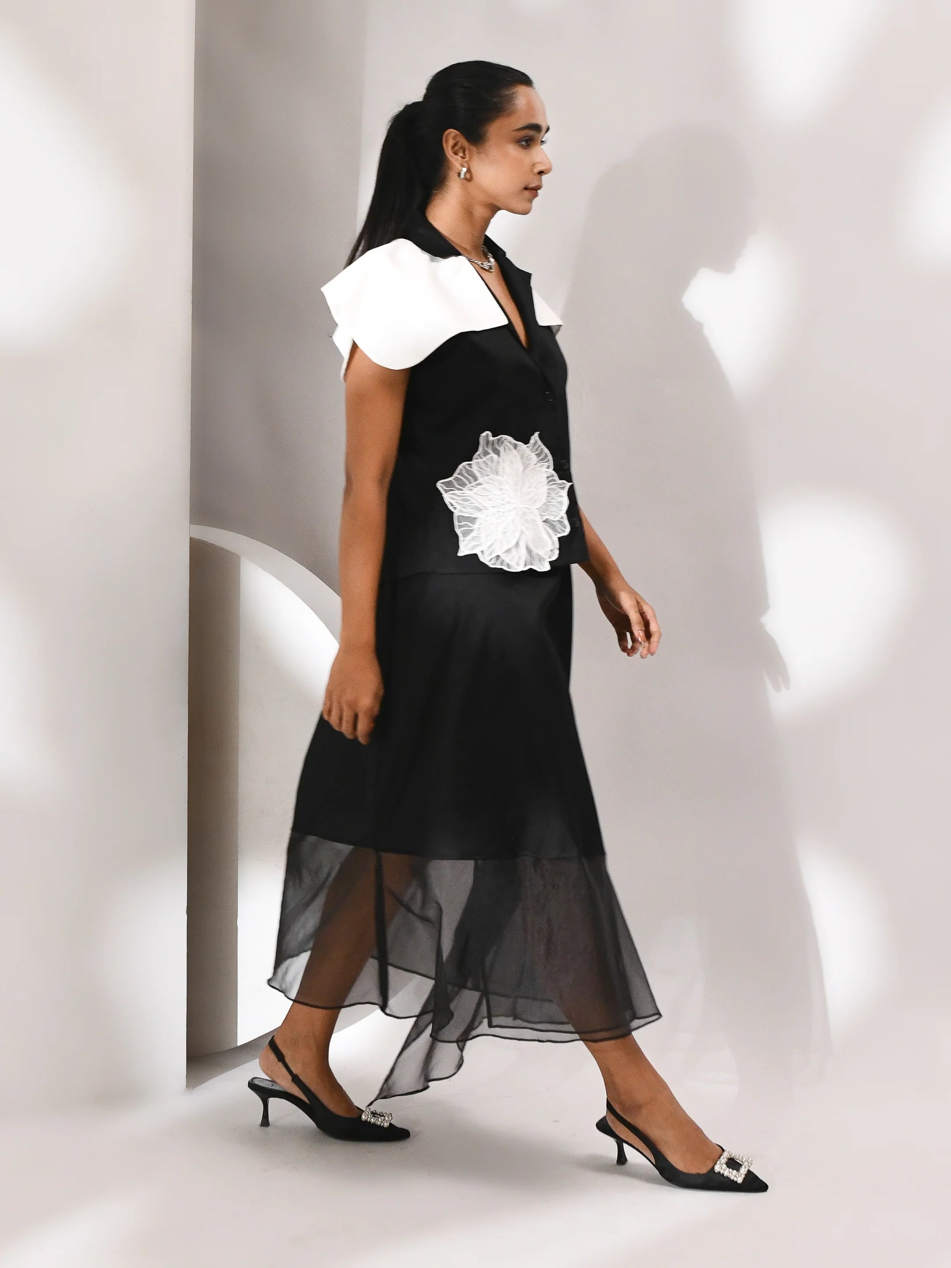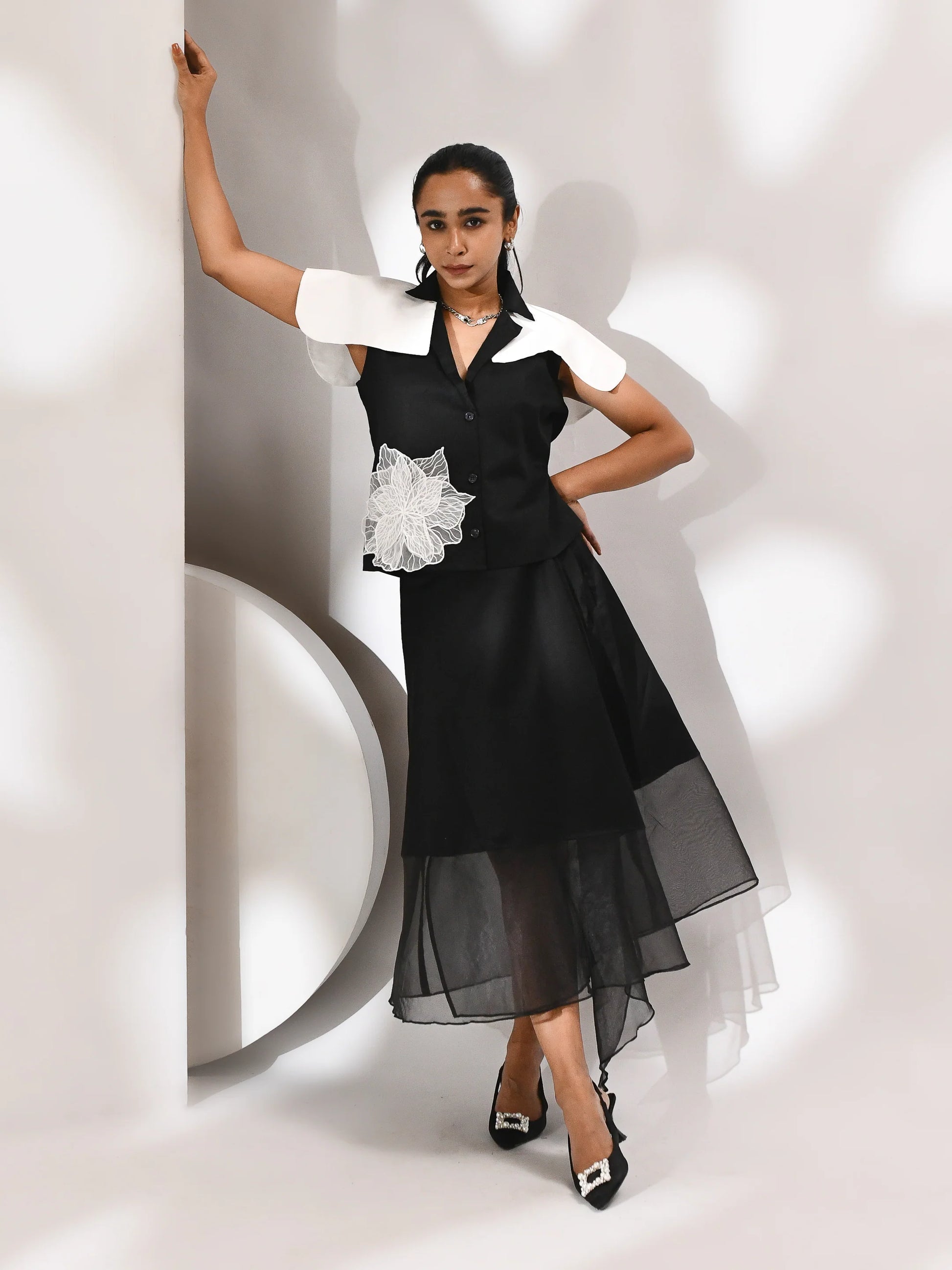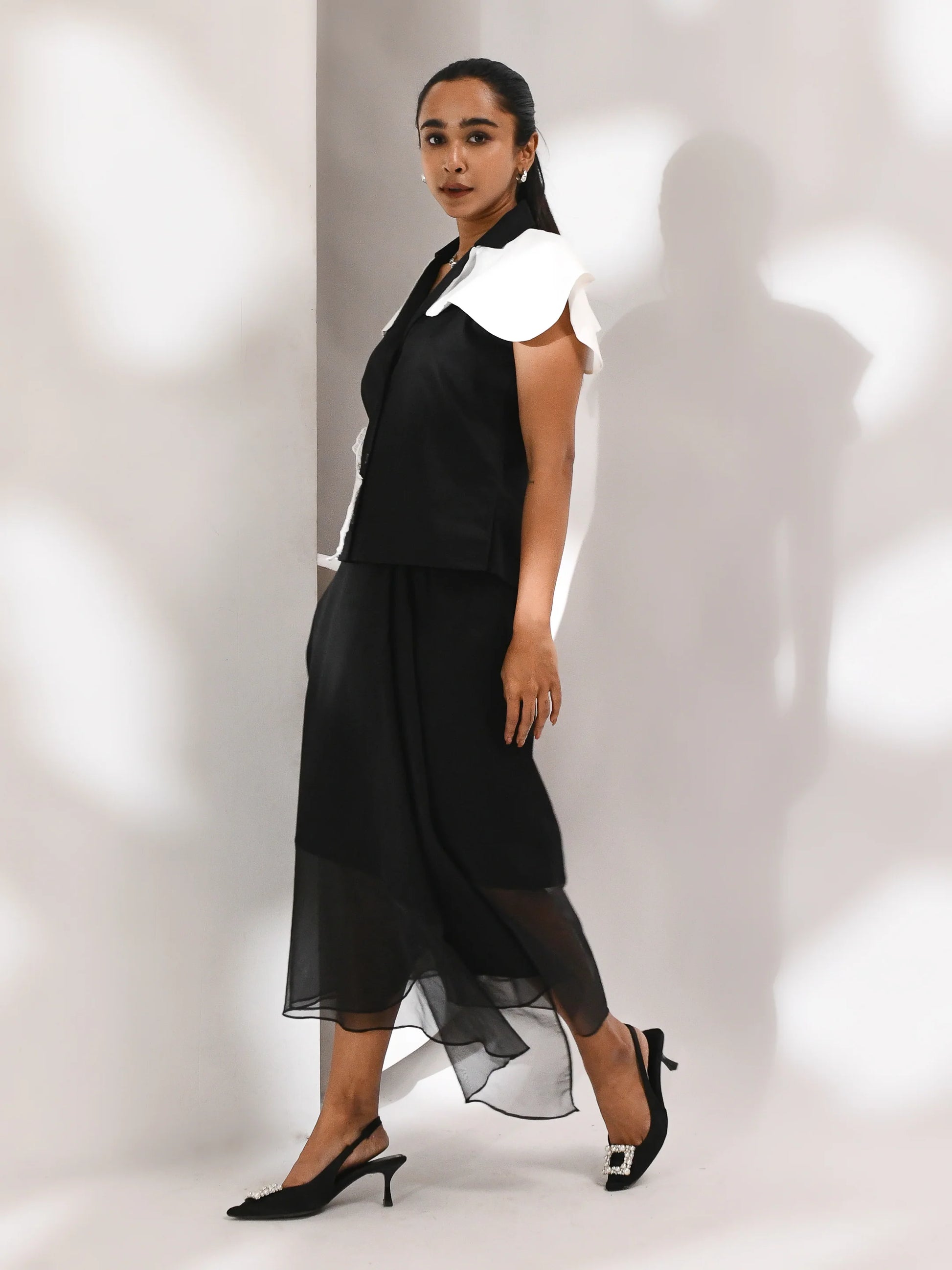 A movement in shadow. This co-ord set—skirt and top—is sculpted in black organza, where sheer layers drift with quiet intent. The silhouette is structured yet fluid, allowing light to trace its edges. Noir Drift is a study in presence and pause, where opacity meets air and every fold holds a whisper of motion.