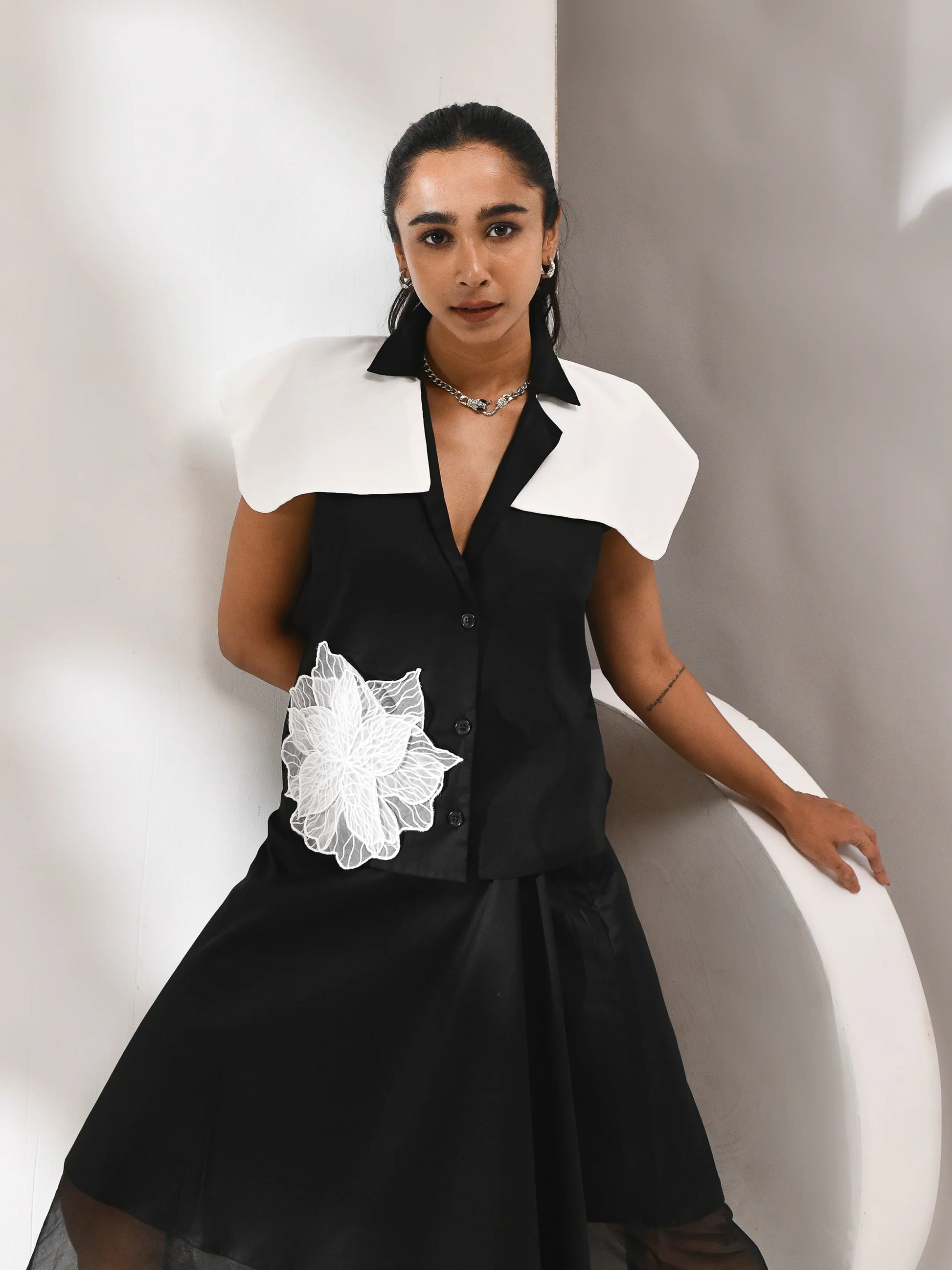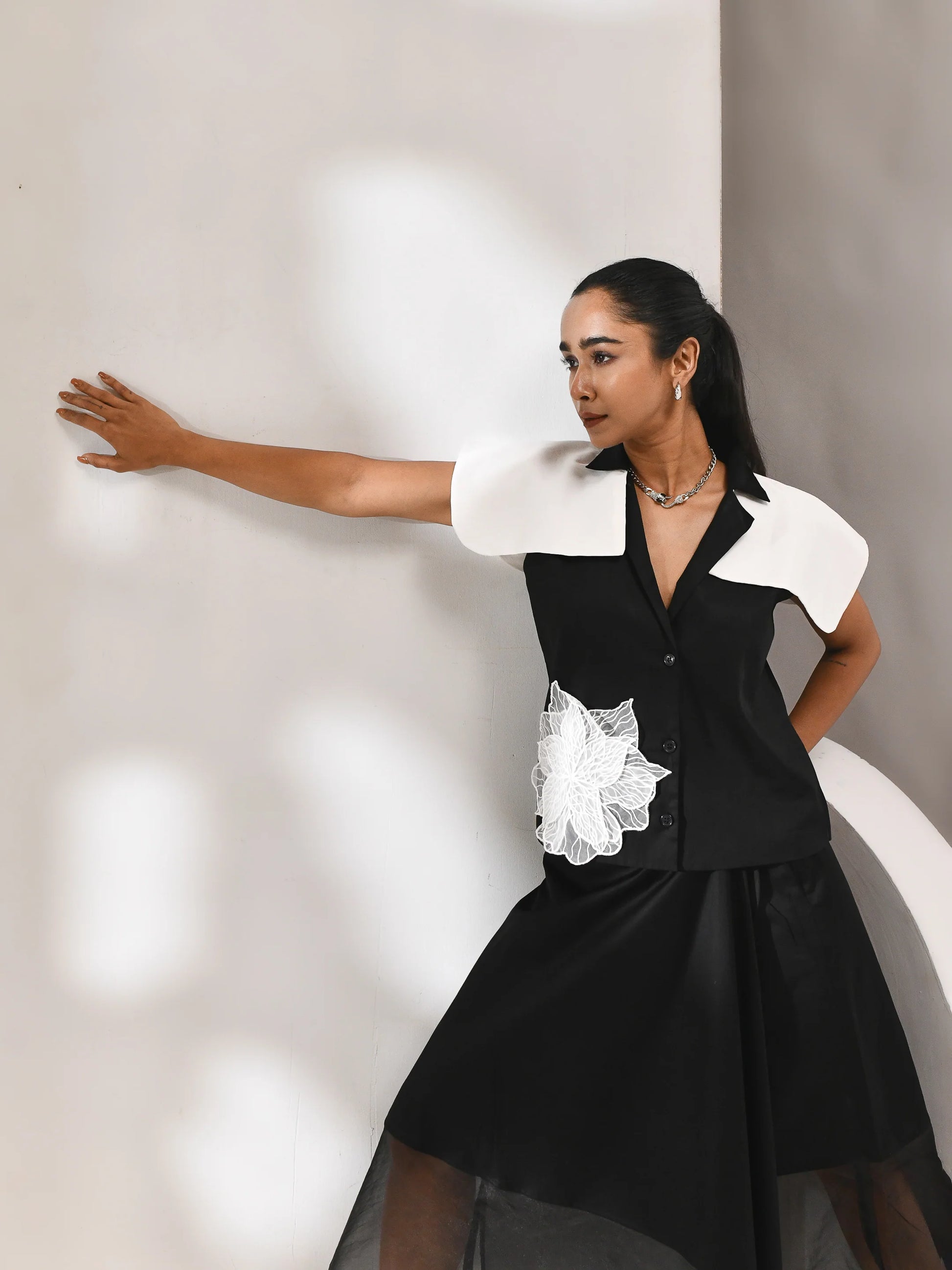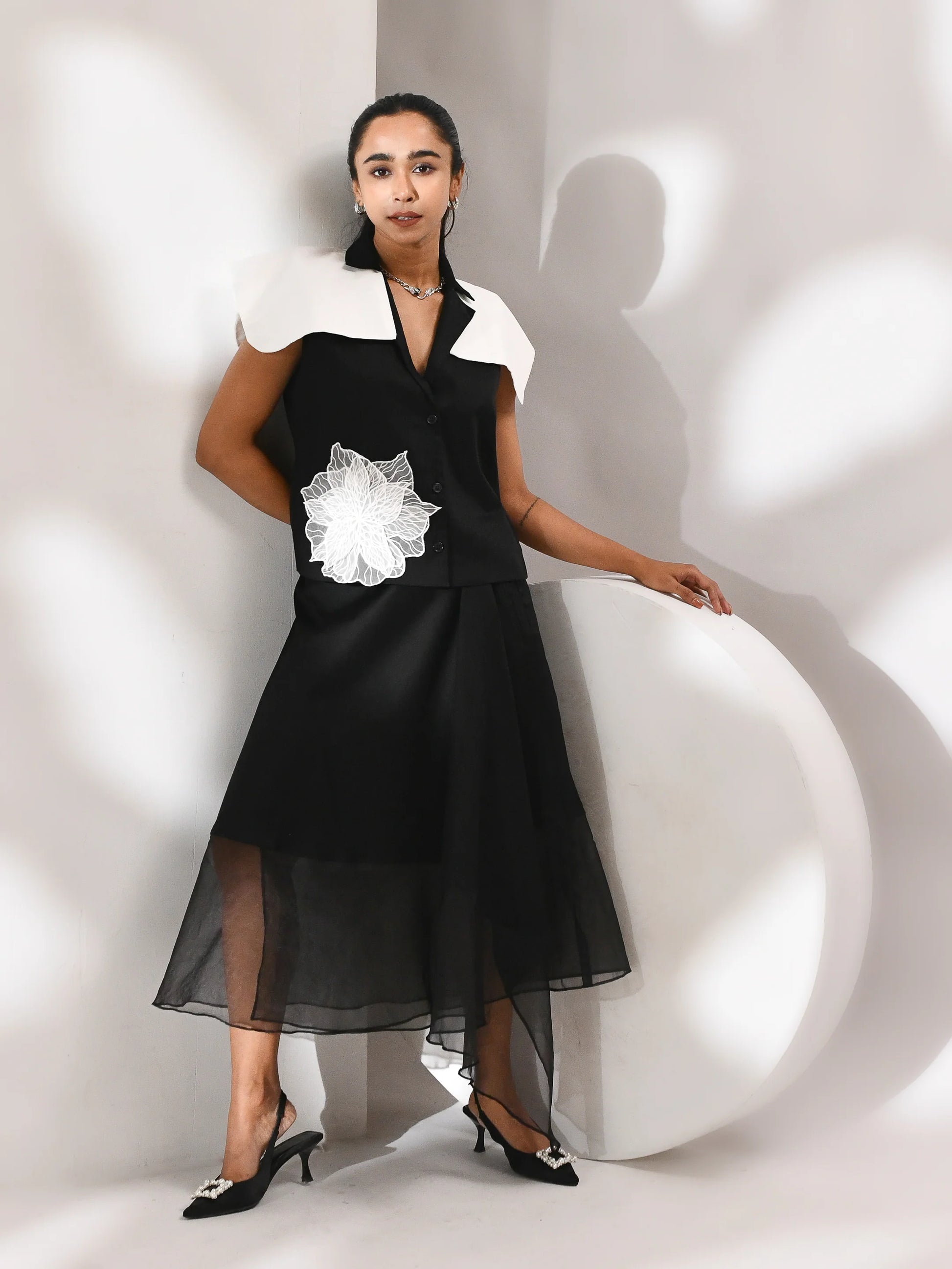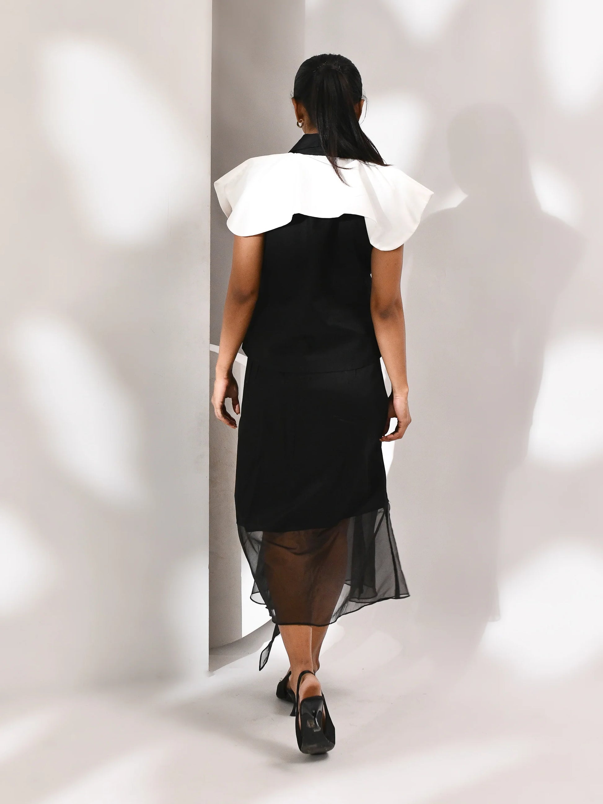 A movement in shadow. This co-ord set—skirt and top—is sculpted in black organza, where sheer layers drift with quiet intent. The silhouette is structured yet fluid, allowing light to trace its edges. Noir Drift is a study in presence and pause, where opacity meets air and every fold holds a whisper of motion.