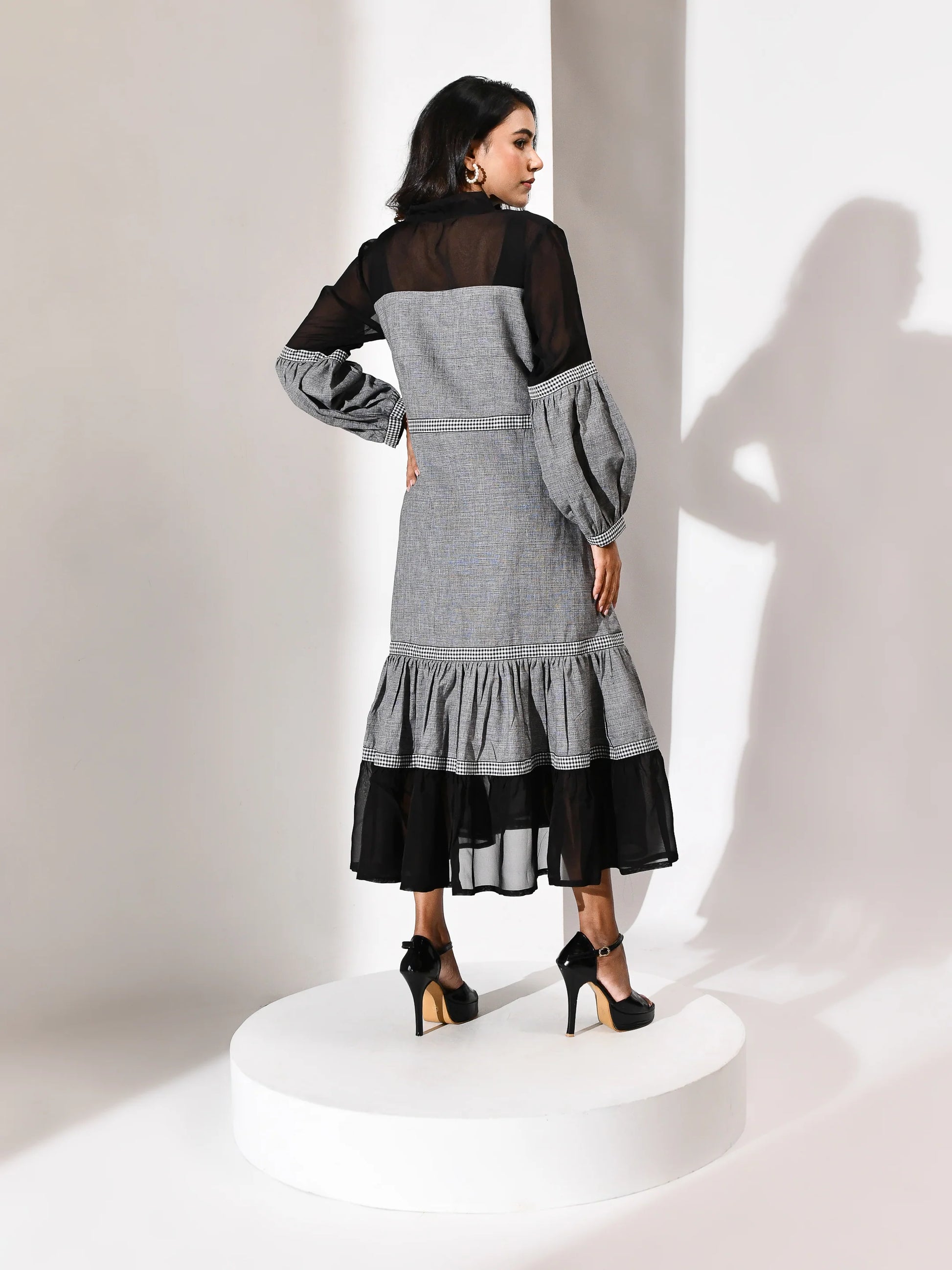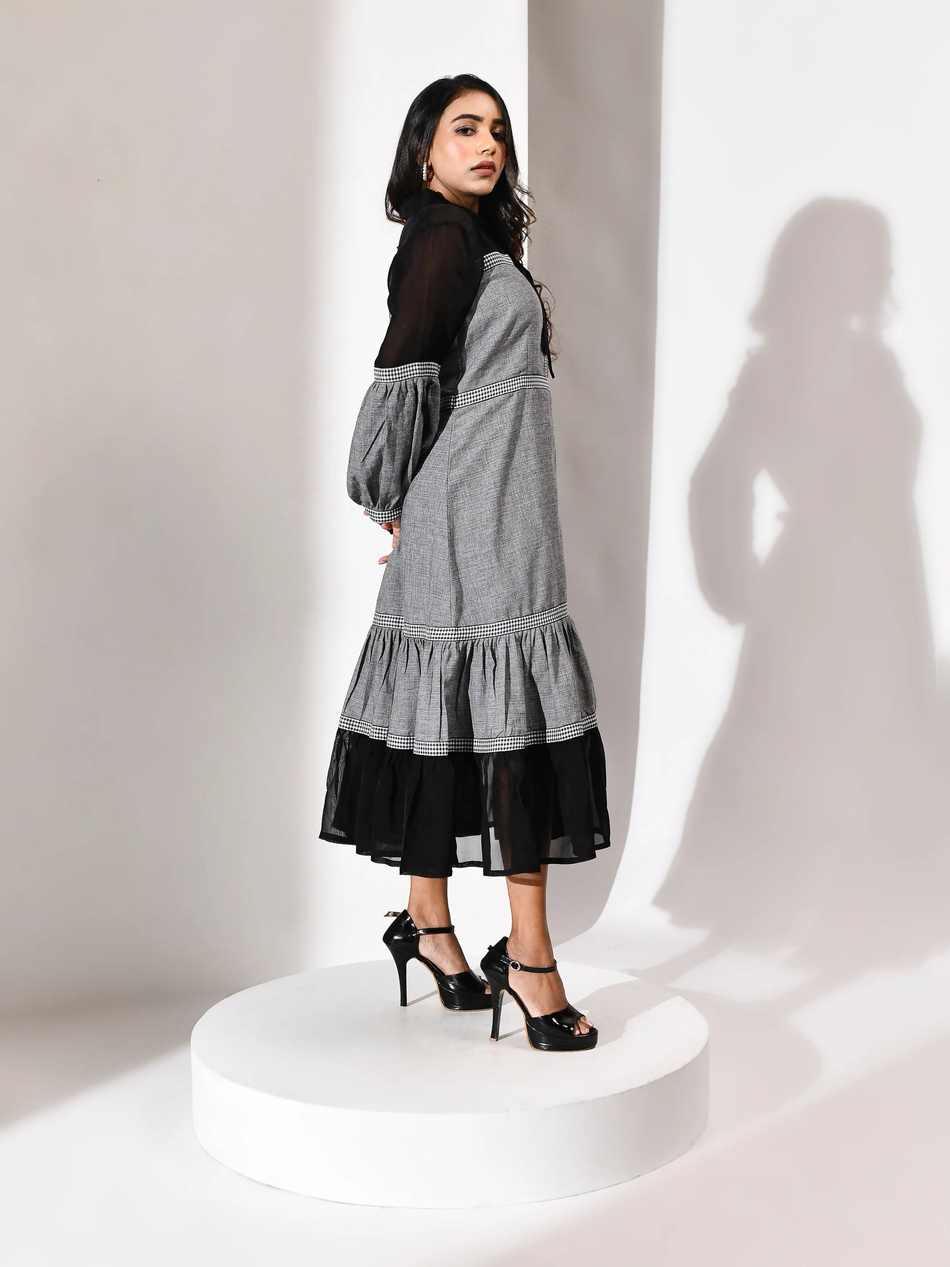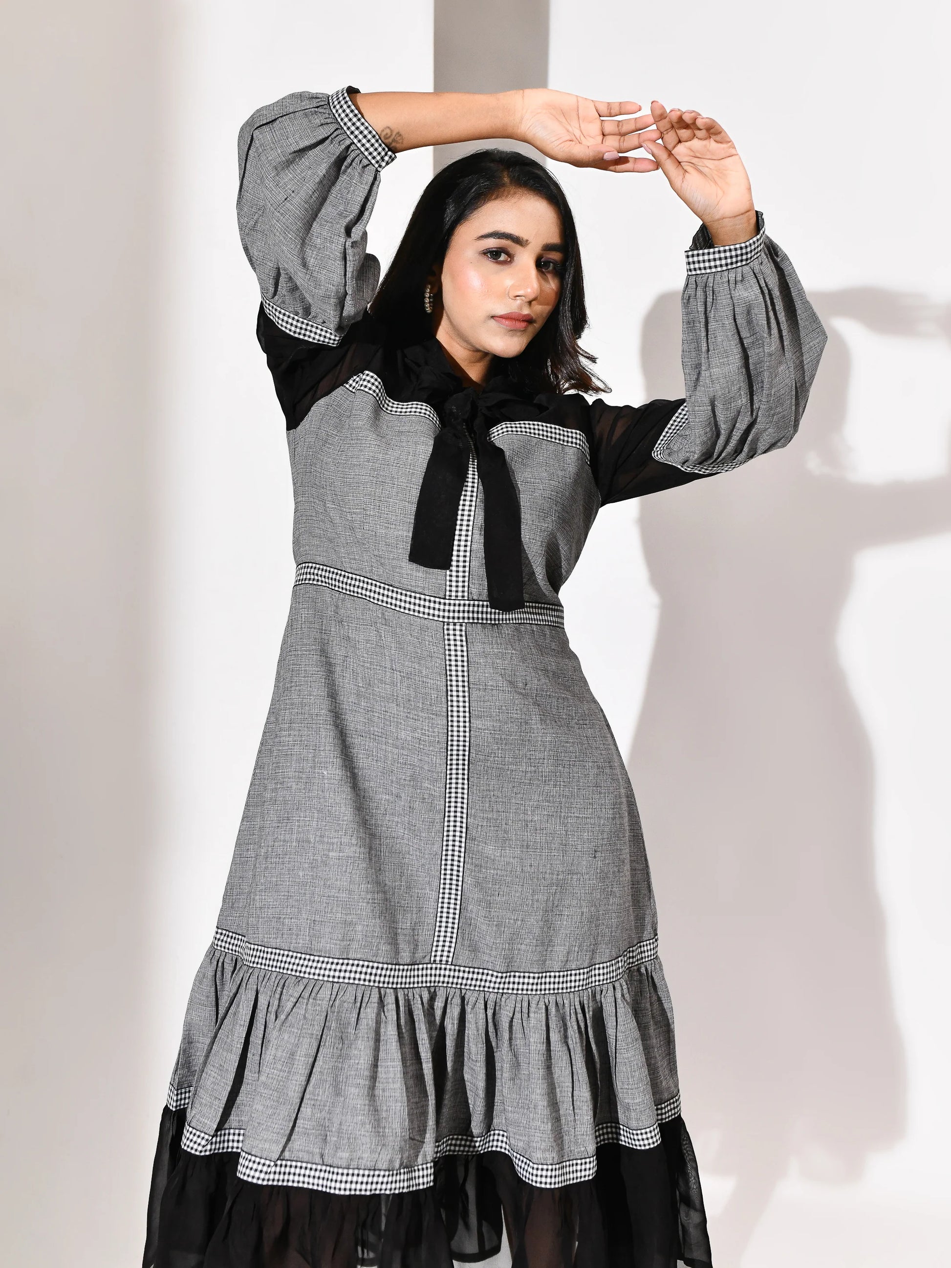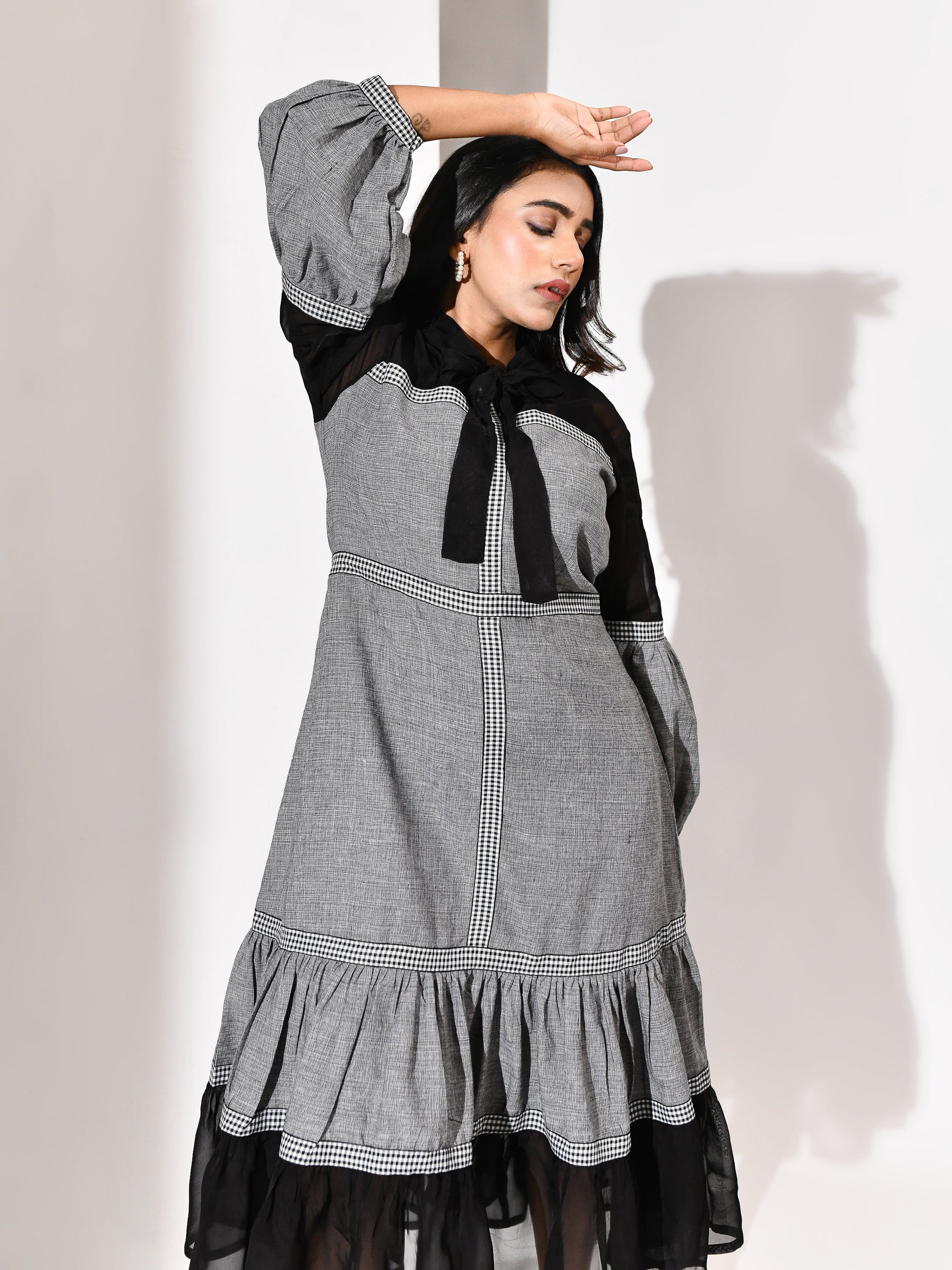 A lattice of contrast and clarity. This dress weaves grey cotton with sheer black organza, anchored by gingham lace that traces geometry across softness. The grid is graphic yet gentle—each line a quiet assertion, each texture a layered whisper. Noirgrid is structure softened by shadow, designed for the woman who moves through form with grace and edge, and wears pattern like poetry.