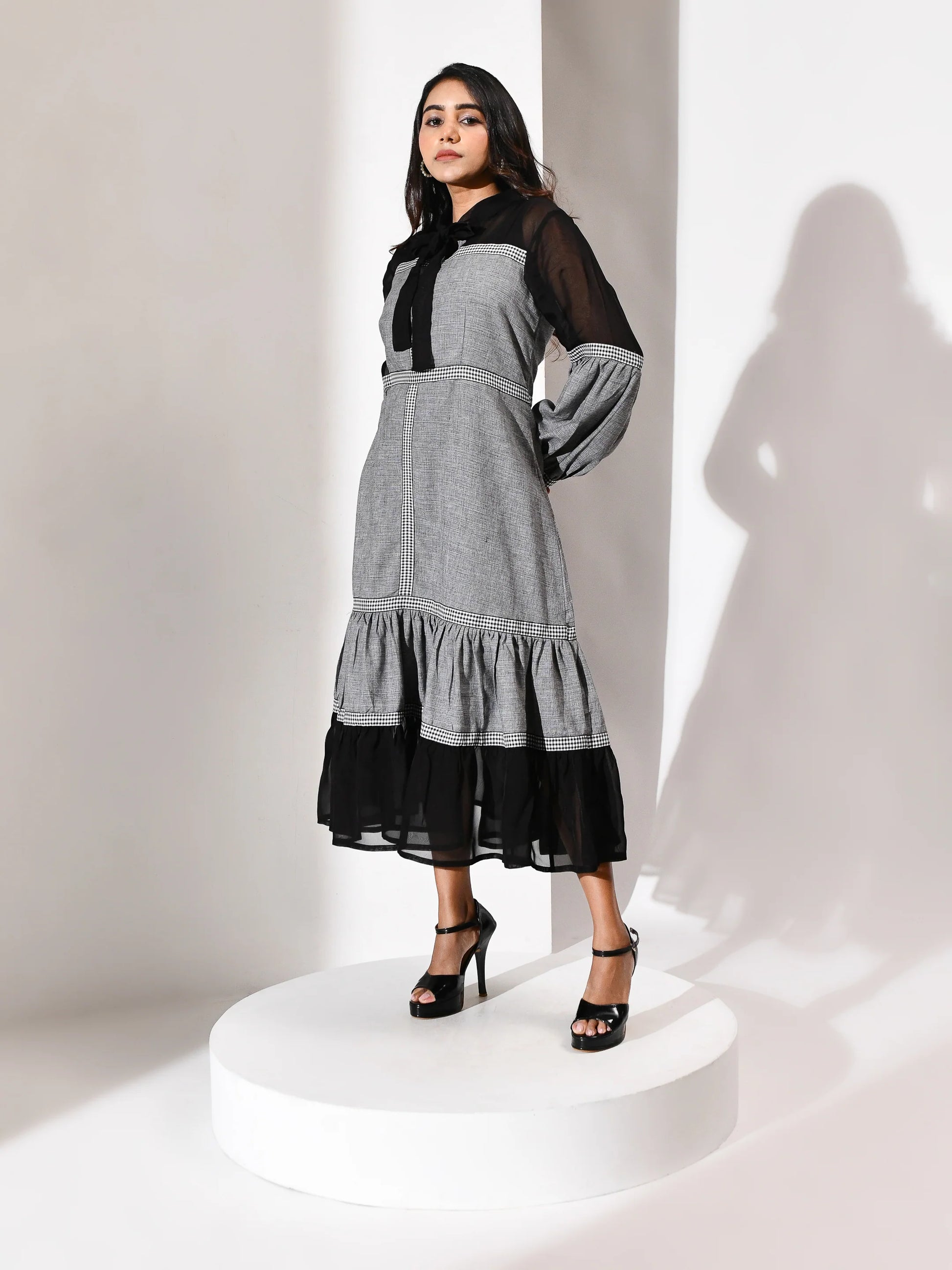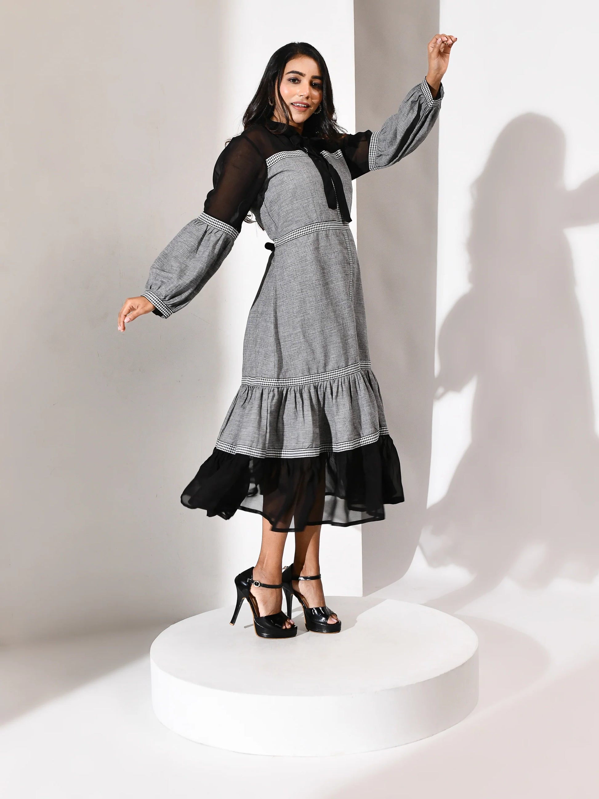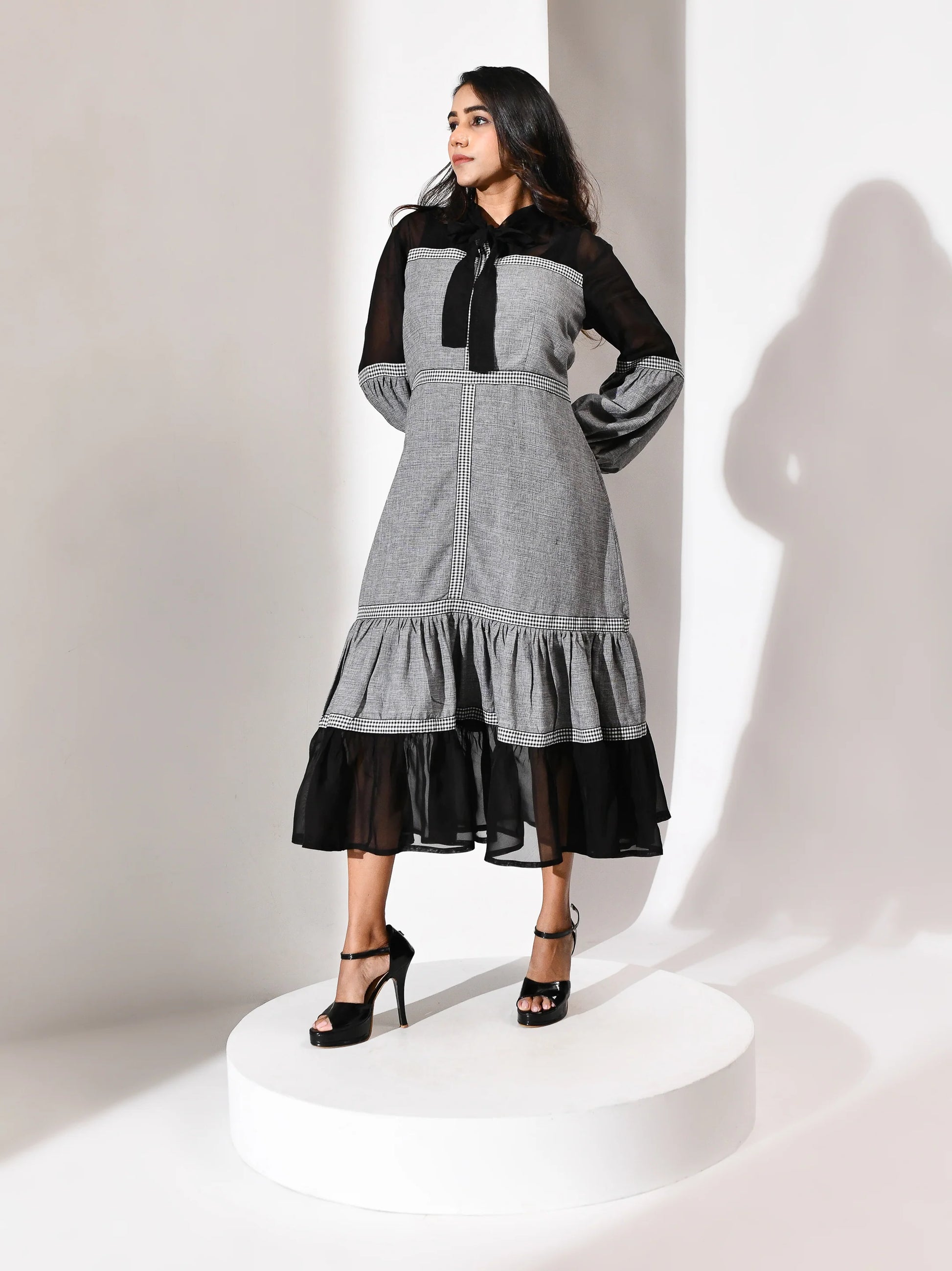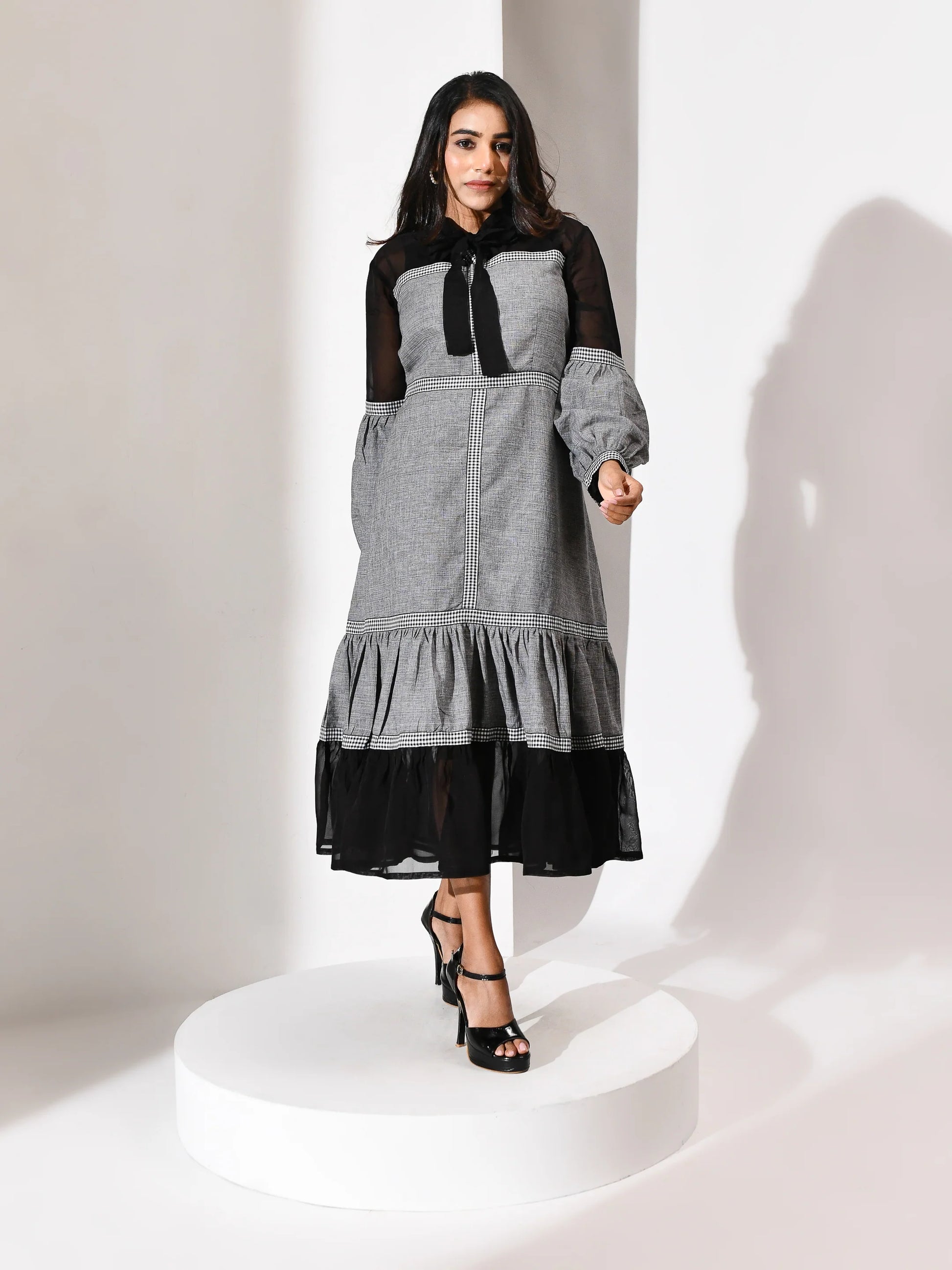 A lattice of contrast and clarity. This dress weaves grey cotton with sheer black organza, anchored by gingham lace that traces geometry across softness. The grid is graphic yet gentle—each line a quiet assertion, each texture a layered whisper. Noirgrid is structure softened by shadow, designed for the woman who moves through form with grace and edge, and wears pattern like poetry.