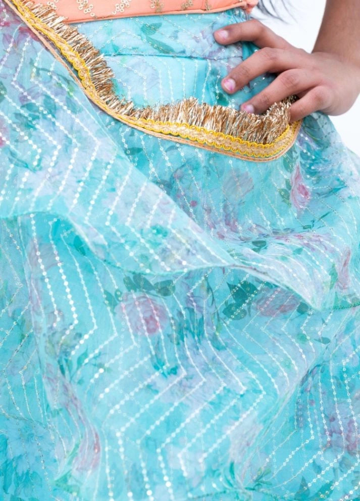 Let your little one shine in our Peach Embroidered Choli with Printed Organza Lehenga Set. The halter-neck choli features delicate embroidery and soft lining, paired with a printed organza lehenga that’s lined with cotton and enhanced with cancan for graceful flare. A stylish ruffle dupatta finished with lace completes the look. Perfect for weddings, festive celebrations, and parties, this ensemble blends playful elegance with all-day comfort.
