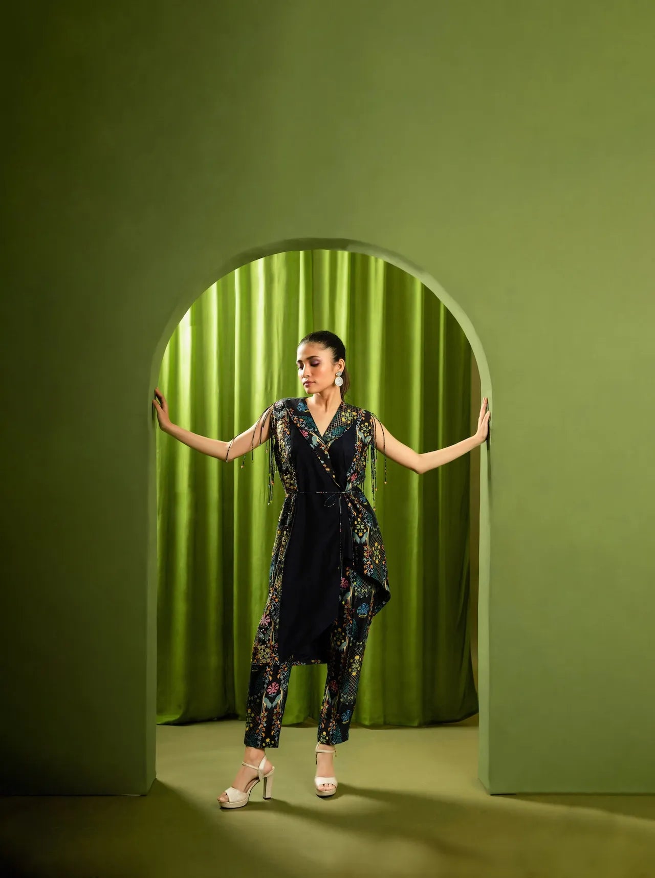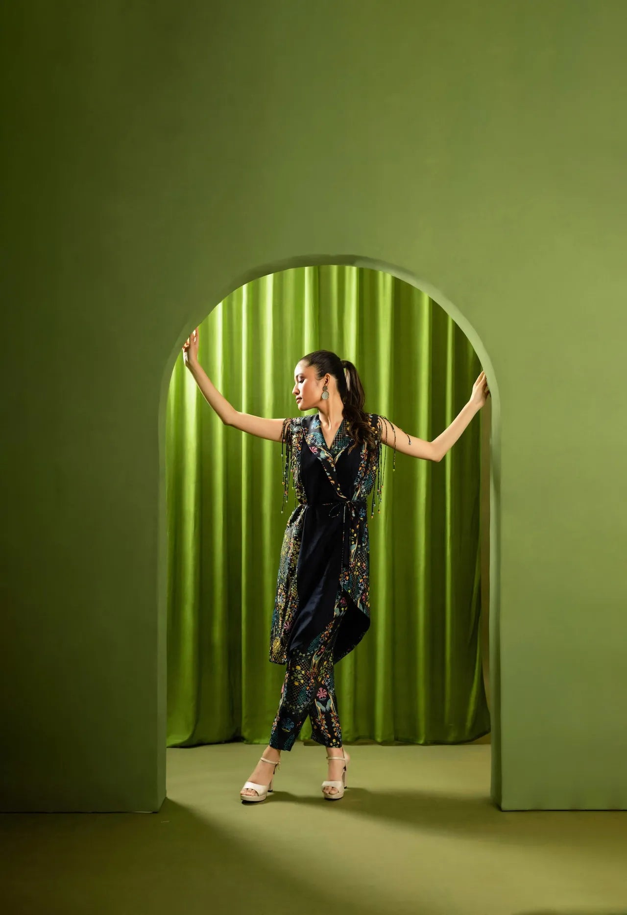 Featuring a printed lapel asymmetic top with an embroidered panel and cord hangings on the sleeves. It is paired a with a tailored cigarette pant below to complete the look. A perfect ensemble for Diwali parties and all things festive.