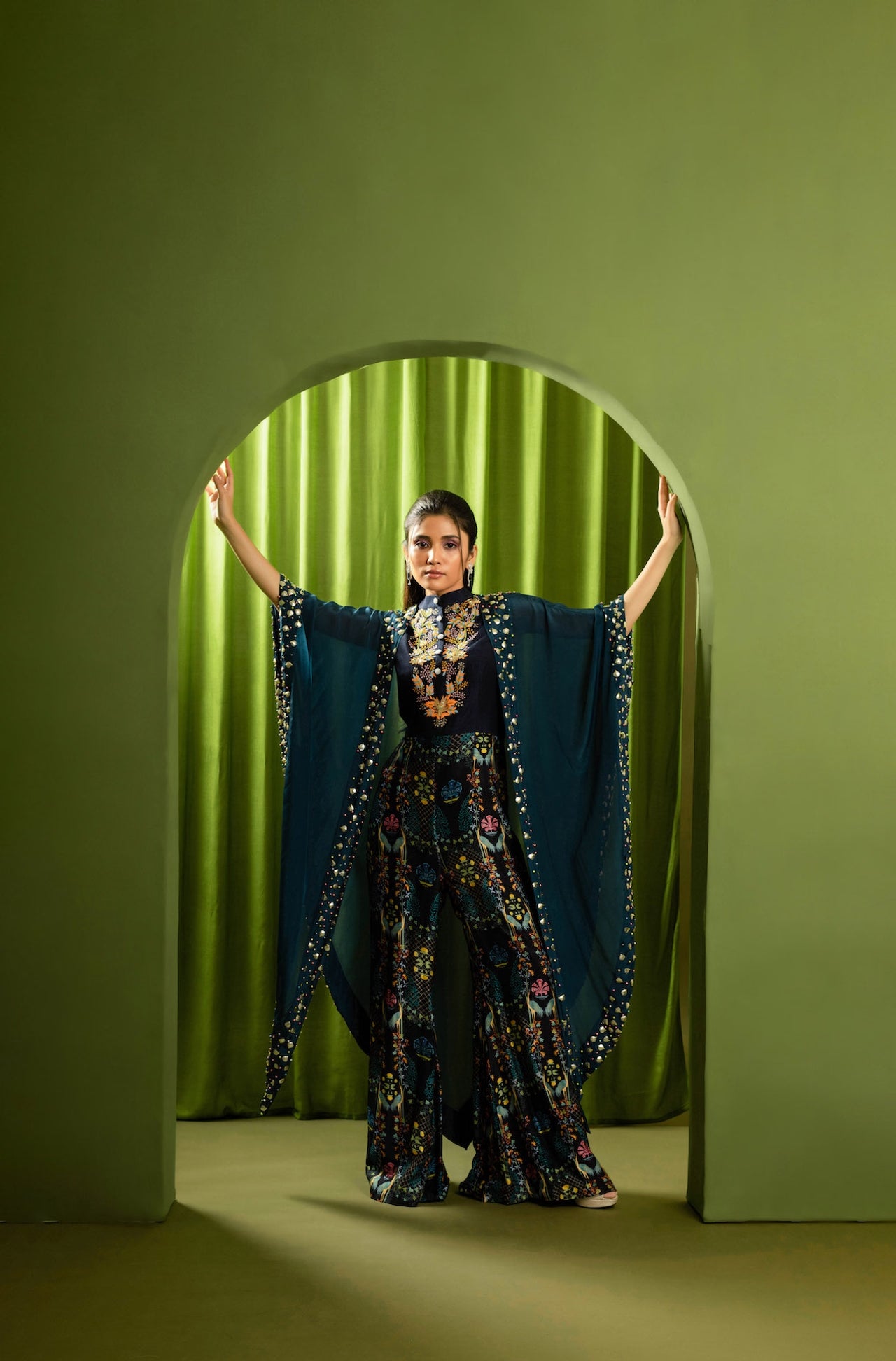 Featuring a printed jumpsuit in linen base embellished with large fuschia pink floral appliques.