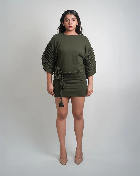 This jersey rope dress with embroidery and a rope belt from the "Hear Me Out" Collection will make you feel both comfortable and attractive. Because it is painstakingly stitched, this rope garment takes more than 25 hours to create. It's made of jersey fabric, which is known for its softness, flexibility, and wrinkle resistance.