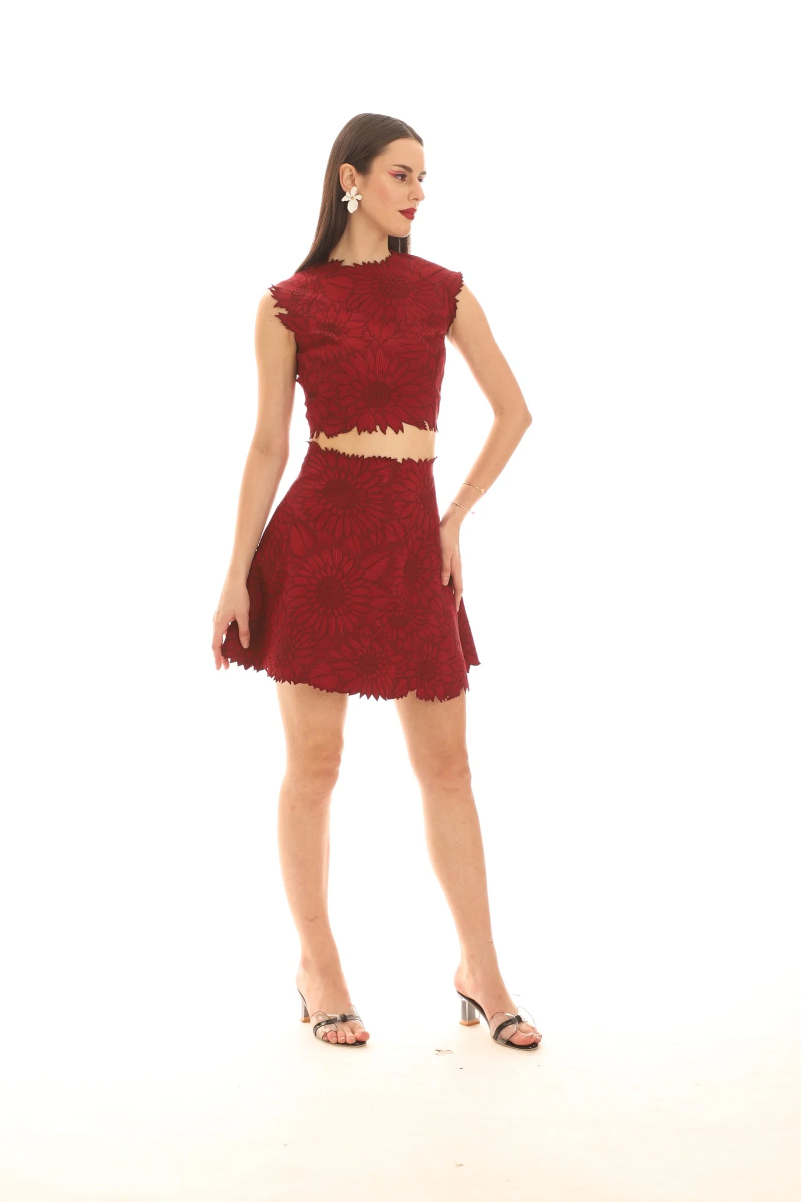 Enhance your wardrobe with the timeless charm of a maroon embroidered skirt, combining rich color with intricate detailing for a sophisticated look.