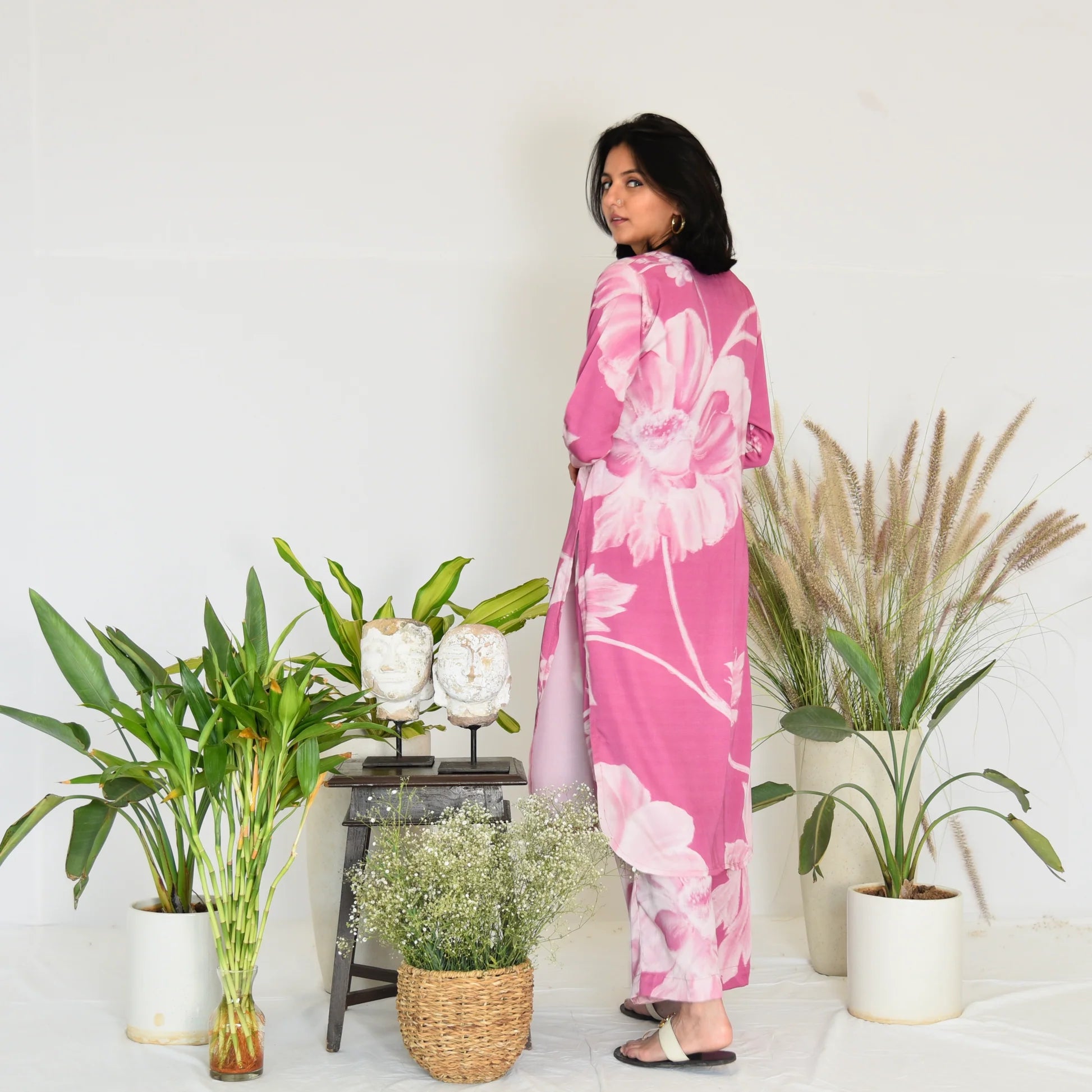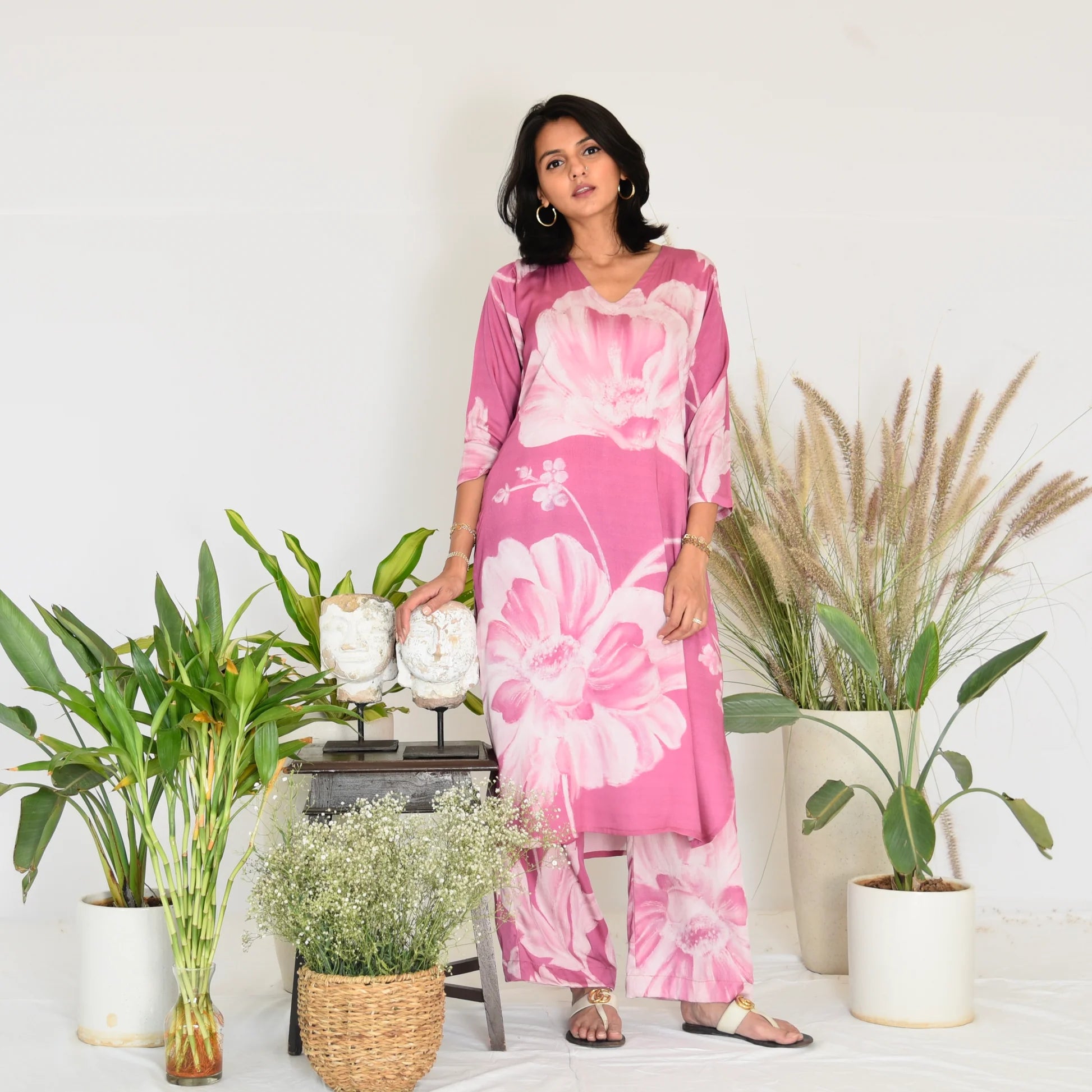 Introducing our exquisite white floral printed kurta. This relaxed-fit piece showcases v neckline and round curved at the bottom of the kurta. The pants are straight fitted with elastic waist. Crafted from luxurious modal satin fabric, the kurta boasts a lovely shine, elevating your look with a touch of glamour. Embrace the beauty of nature and radiate grace with this enchanting kurta, perfect for pairing with your favorite bottoms to make a statement of elegance on any occasion.